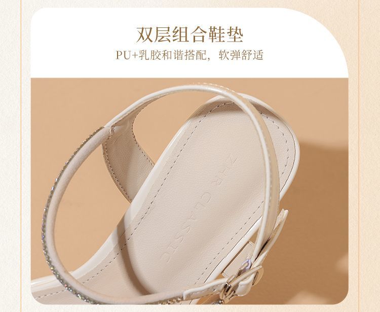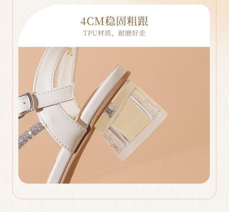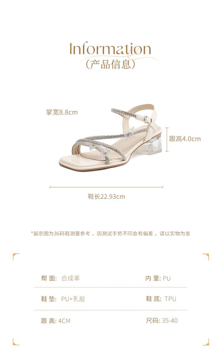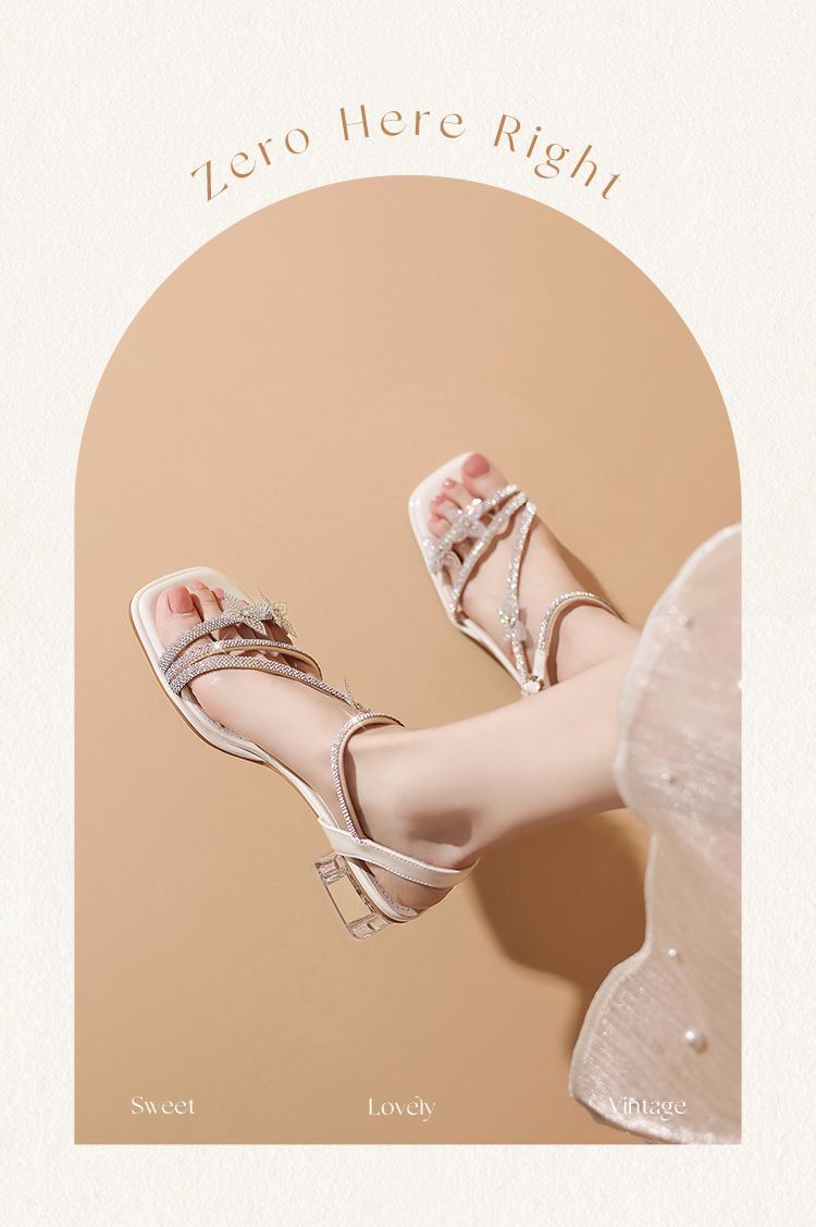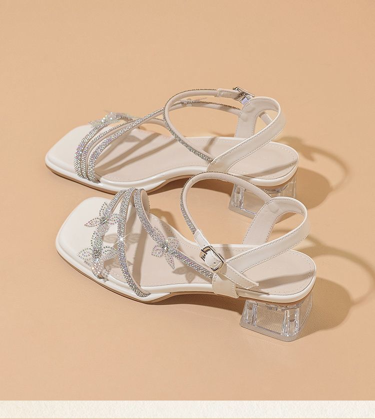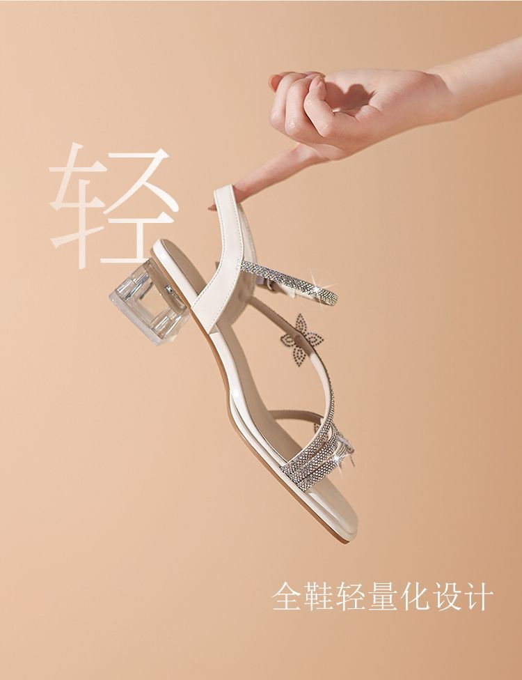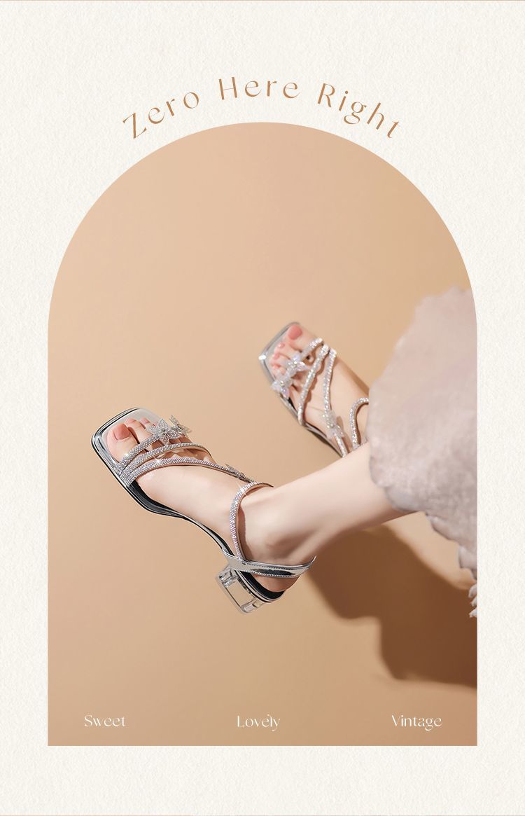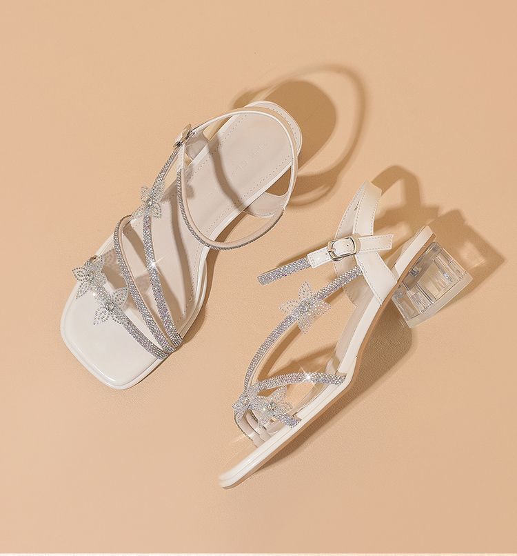 ZHR水钻蝴蝶结凉鞋银色粗跟凉鞋2025夏新款一字带高跟鞋中跟女鞋