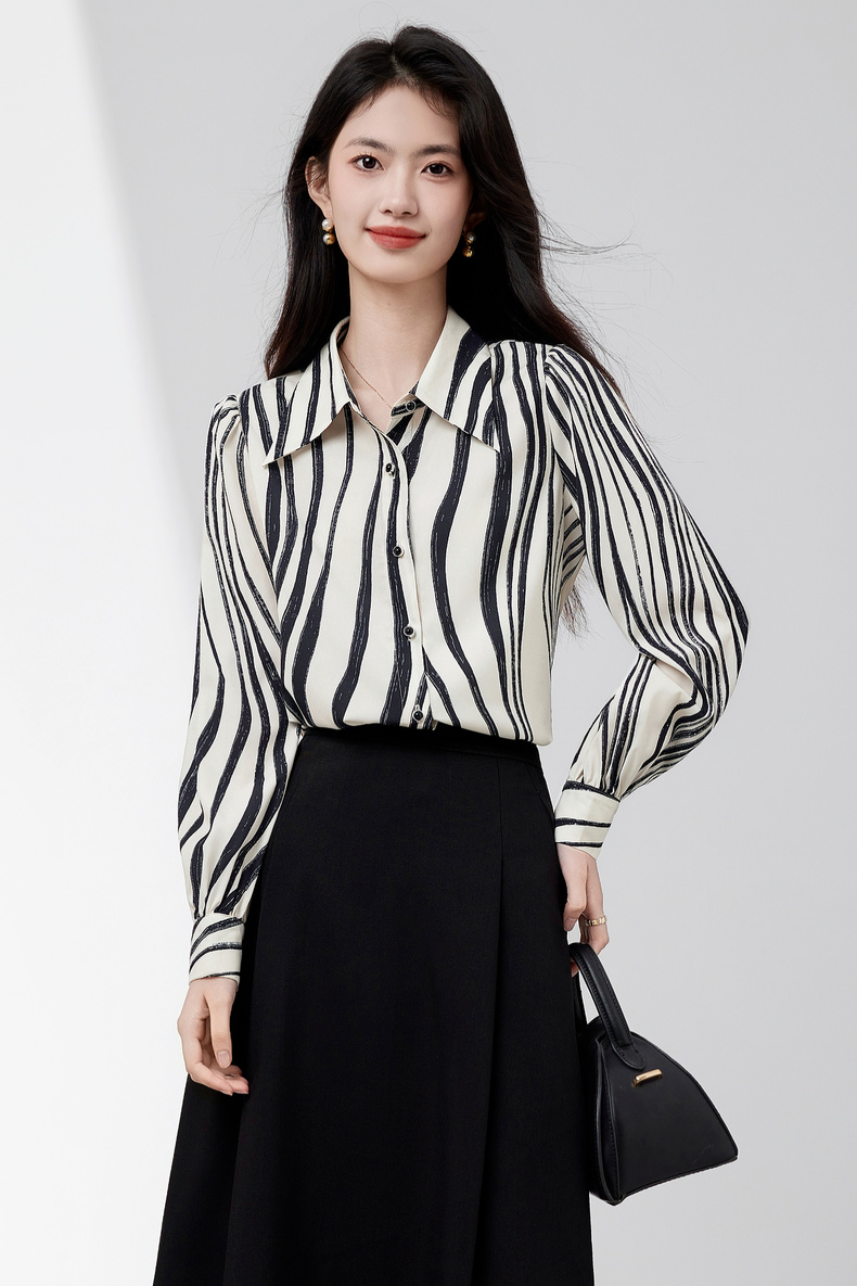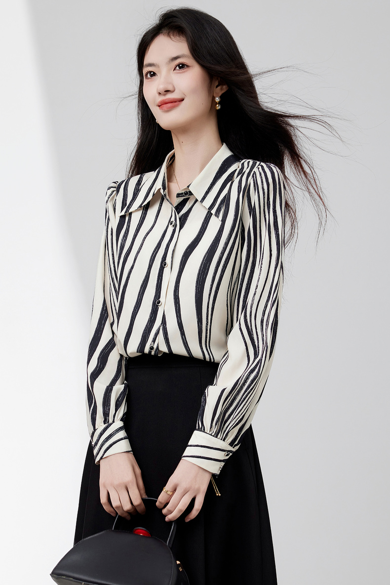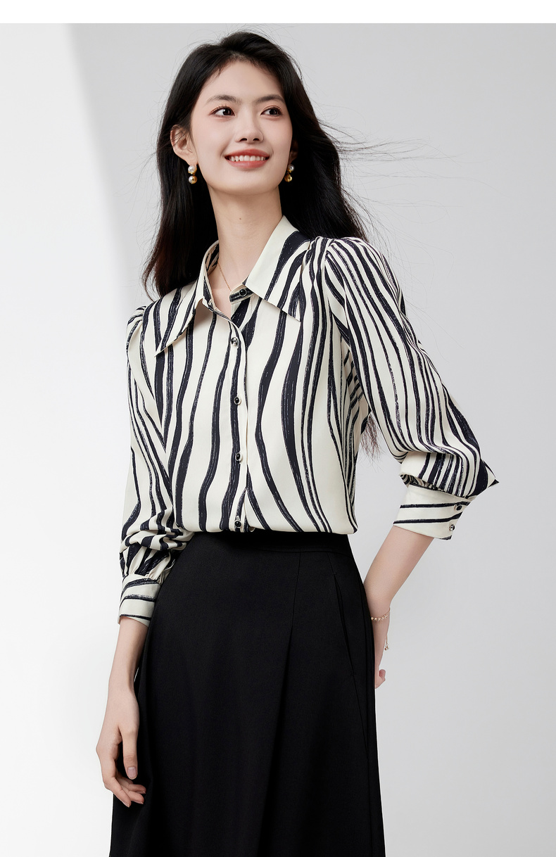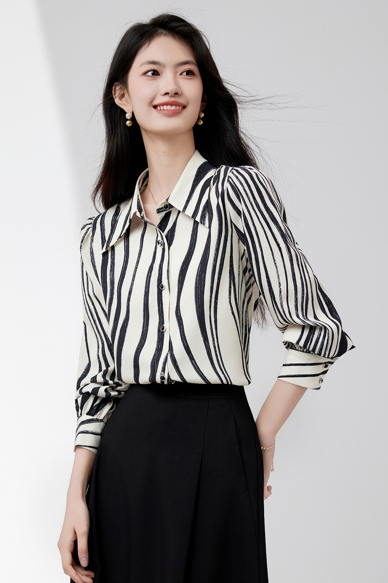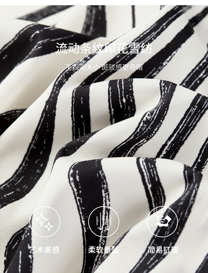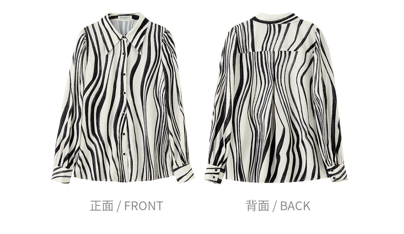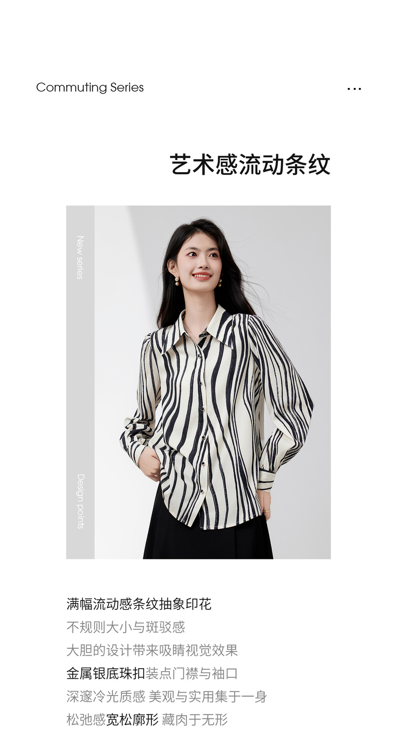 【内购】【流动条纹】都市通勤设计感抽象印花翻领长袖雪纺衬衫-153CH2603