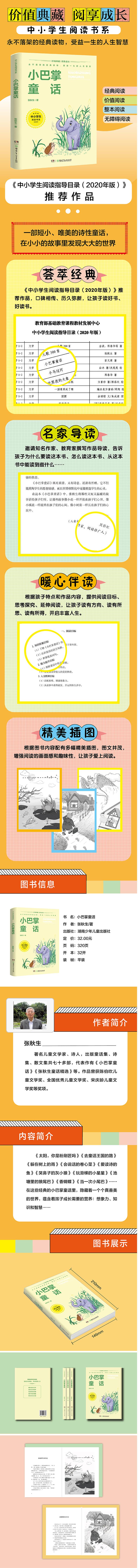 “小巴掌童话”是儿童文学家张秋生拥有代表性的童话作品集。里面收录了很多张秋生的经典童话作品。比如《河马先生的大雨伞》里,河马先生打着一顶大雨伞来熊奶奶家做客,这时小波波熊穿着熊奶奶新织的套衫,去找好朋友玩。忽然窗外传来了一阵嘈杂声,原来淘气的小波波熊撑着河马先生的大伞,被风吹上了天空。勇敢的小波波熊急中生智,把皮靴绑到套衫的麻线上,大皮靴扯着麻线,一点一点沉了下去。大伙儿一起扯着落下来的麻线,使小波波熊安然无恙地回来啦。 这些童话并不以故事情节的曲折离奇为目标,但读来总是格外感到亲切而自然。张秋生用他朴实无华的劳动,亲切地打破了诗和散文的界线,童话和诗的界线,梦幻和生活的界线,把我们领进了一个真善美的绚丽多姿的王国。