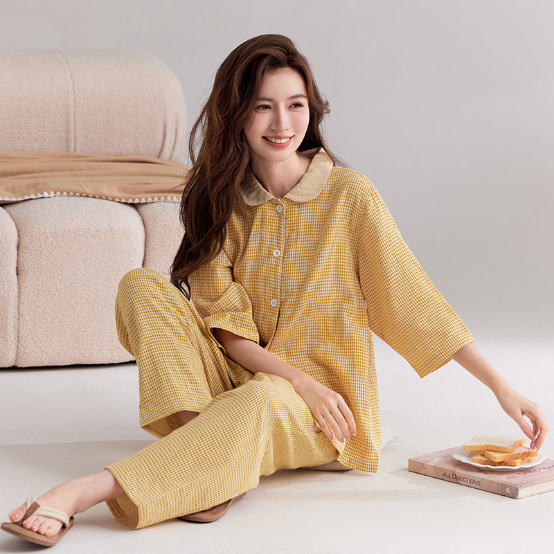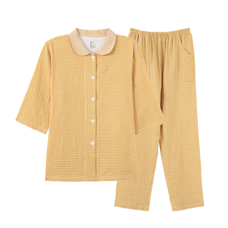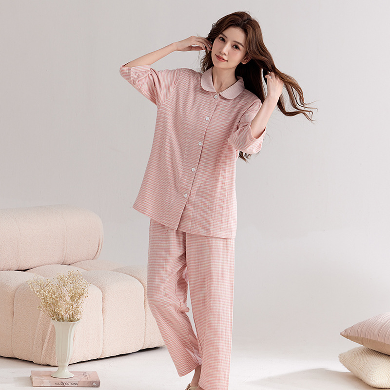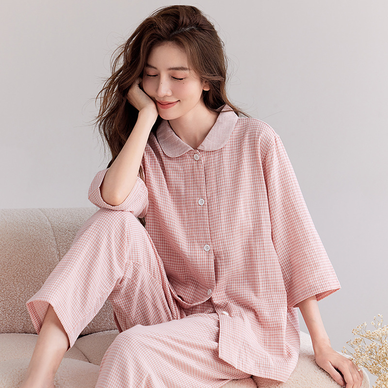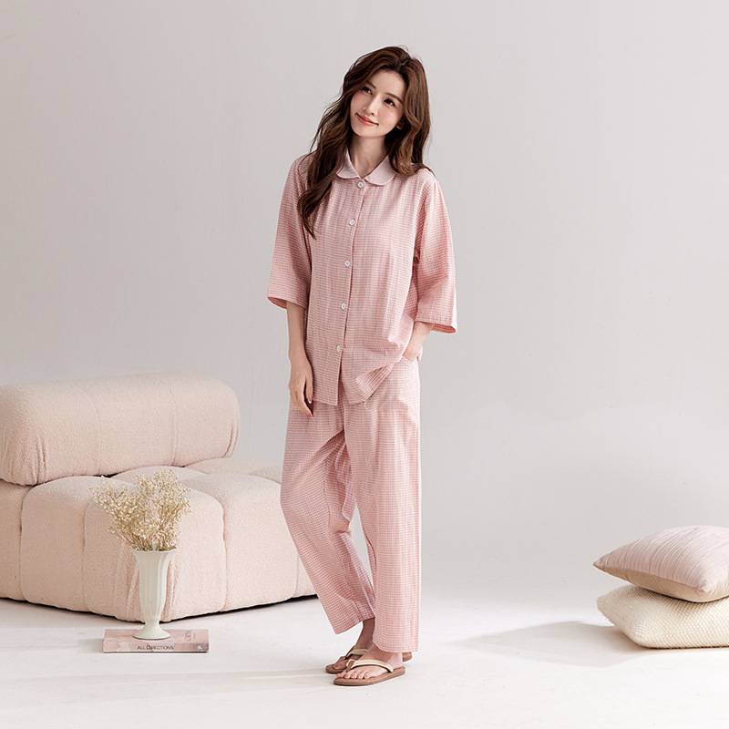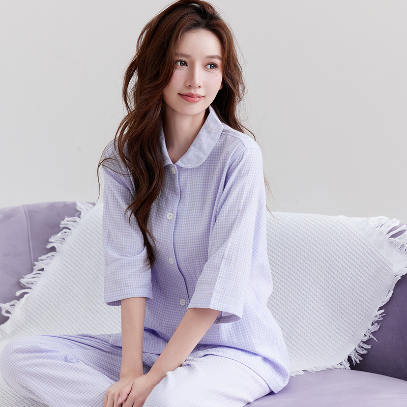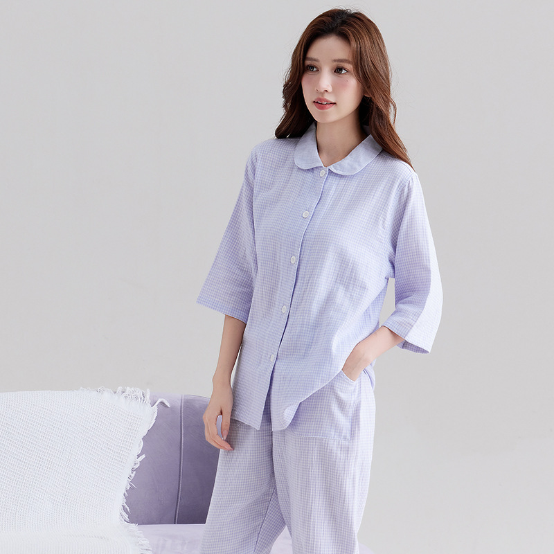 【双层纱七分袖细格纹睡衣】全棉双层纱家居服七分袖细格纹睡衣女士家居服套装