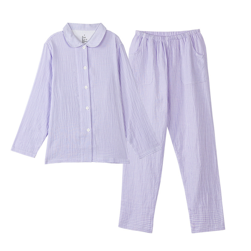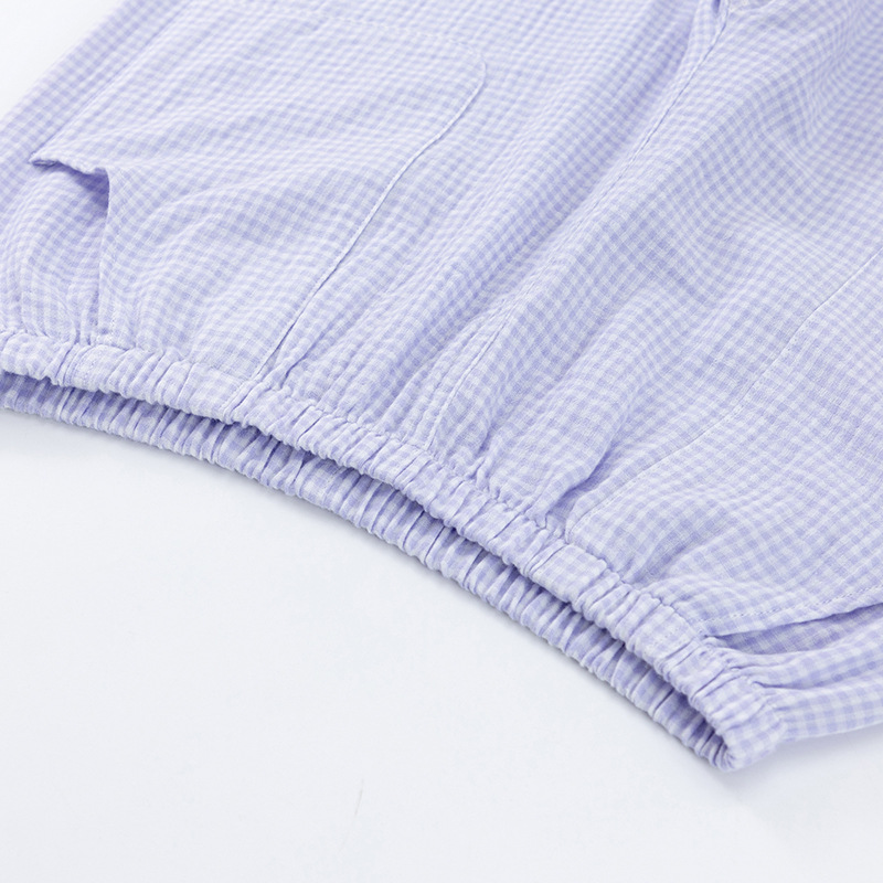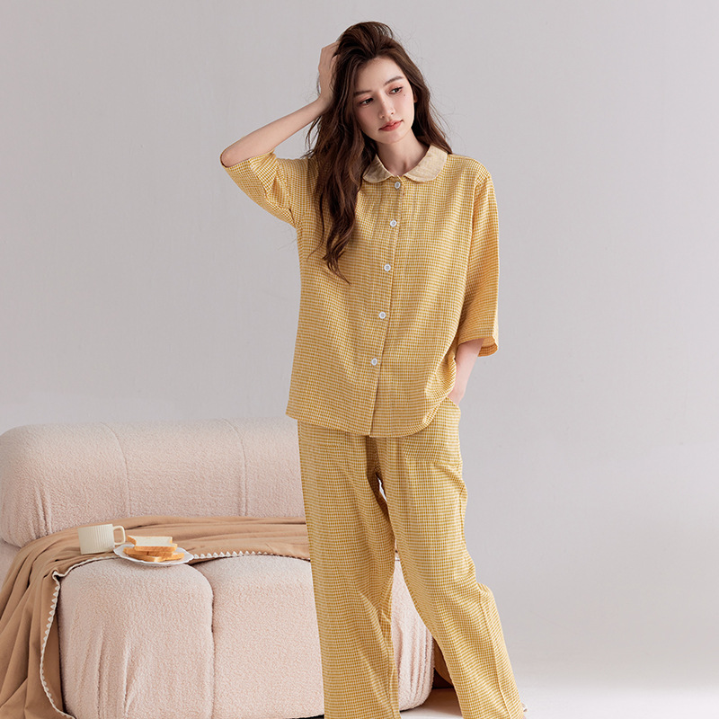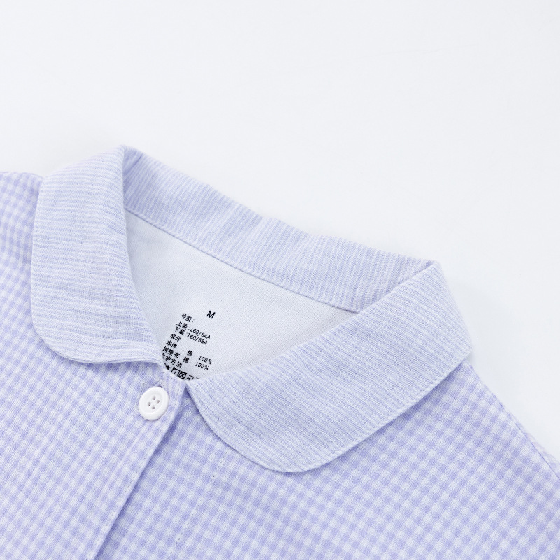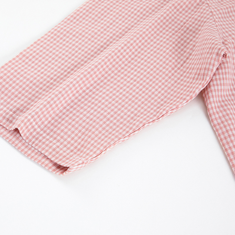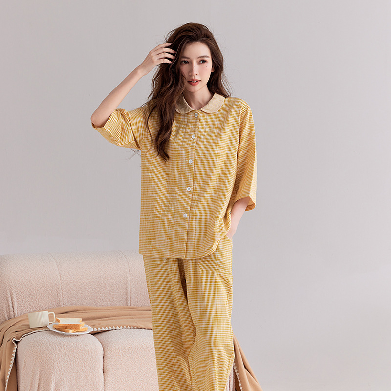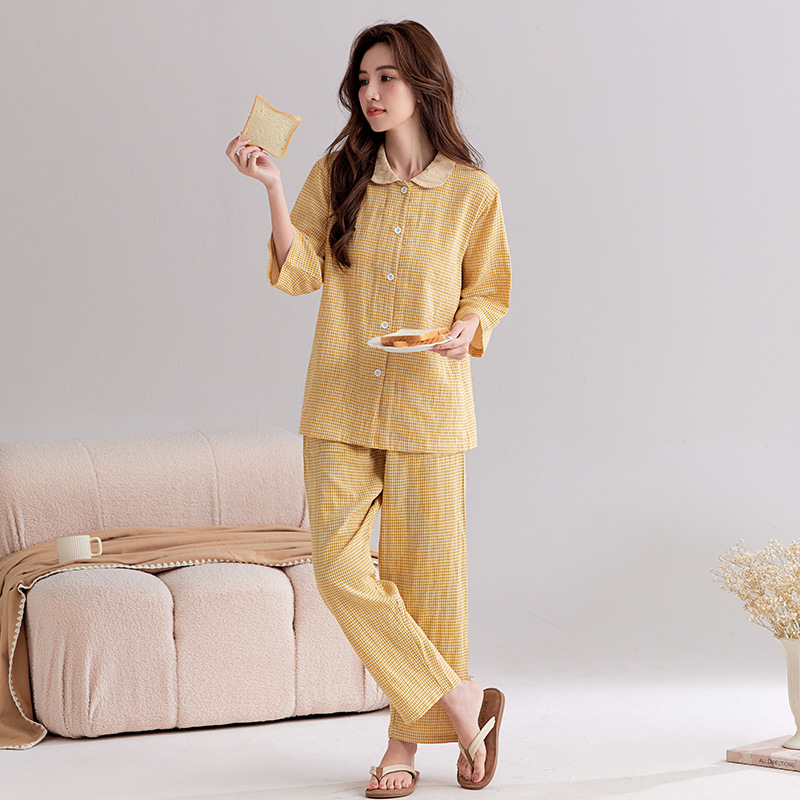 【双层纱七分袖细格纹睡衣】全棉双层纱家居服七分袖细格纹睡衣女士家居服套装