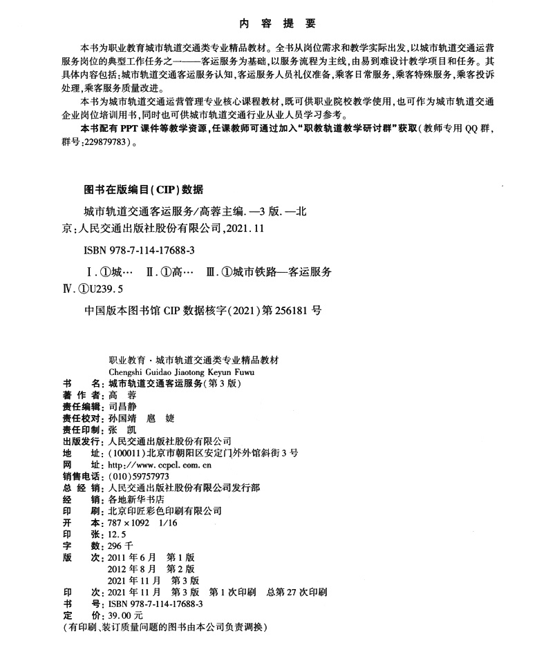 书名:城市轨道交通客运服务(第3版)