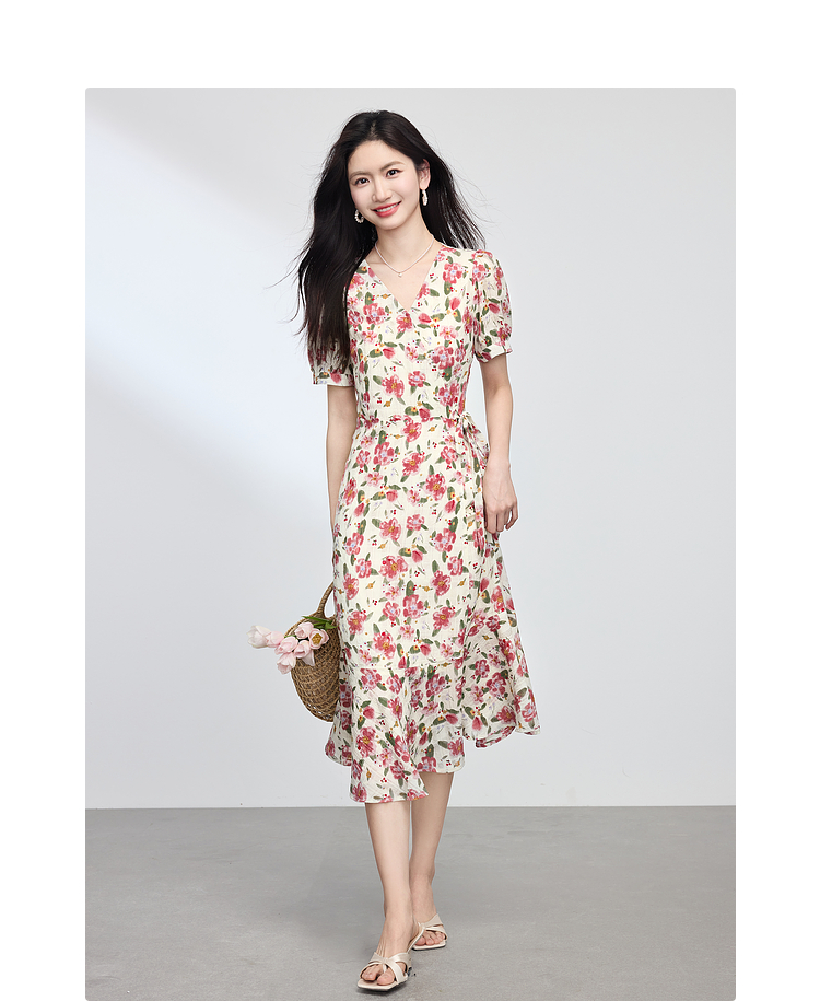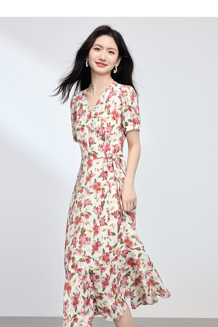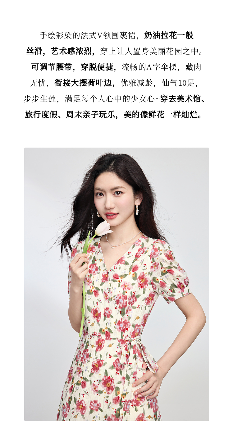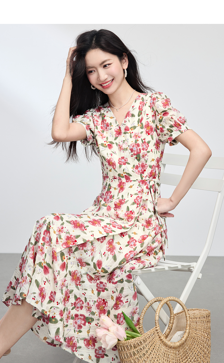 【专属特价】熙世界夏日穿搭法式浪漫围裹碎花连衣裙女高级感V领长裙2025夏款