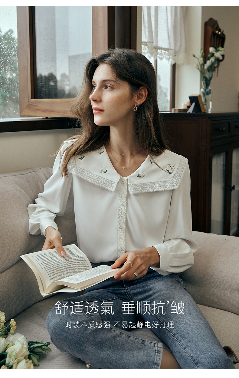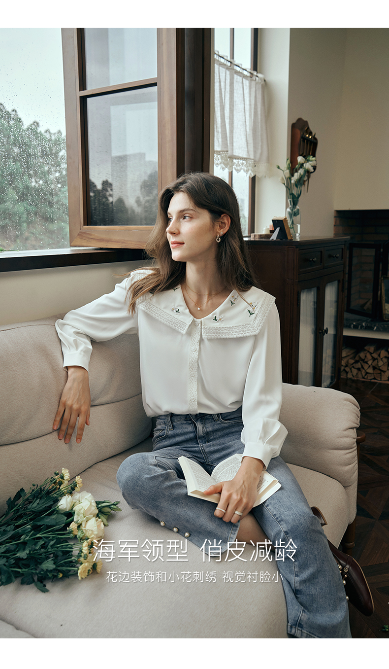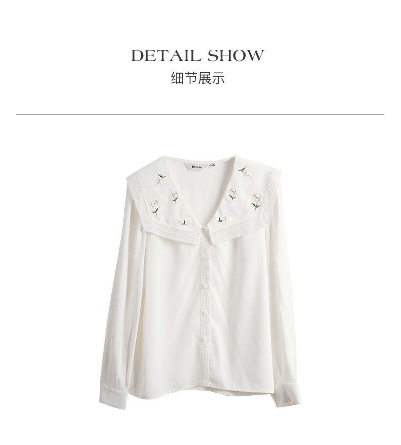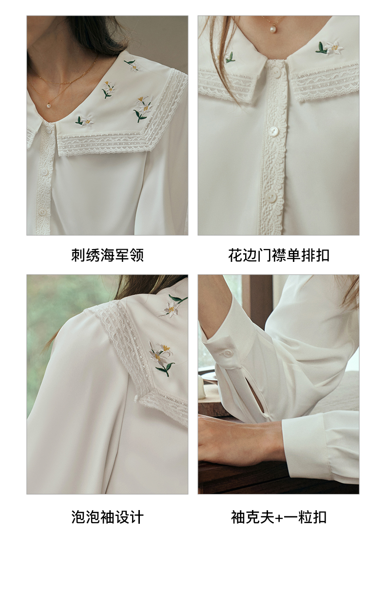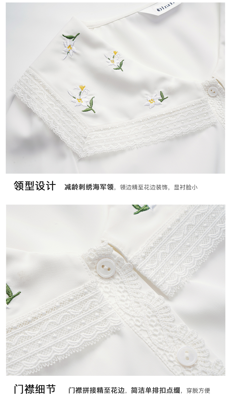 OLrain欧芮儿米白色蕾丝雪纺衫女初秋2023新款宽松刺绣海军领小衫