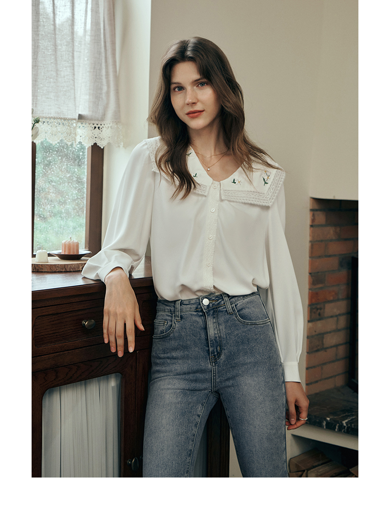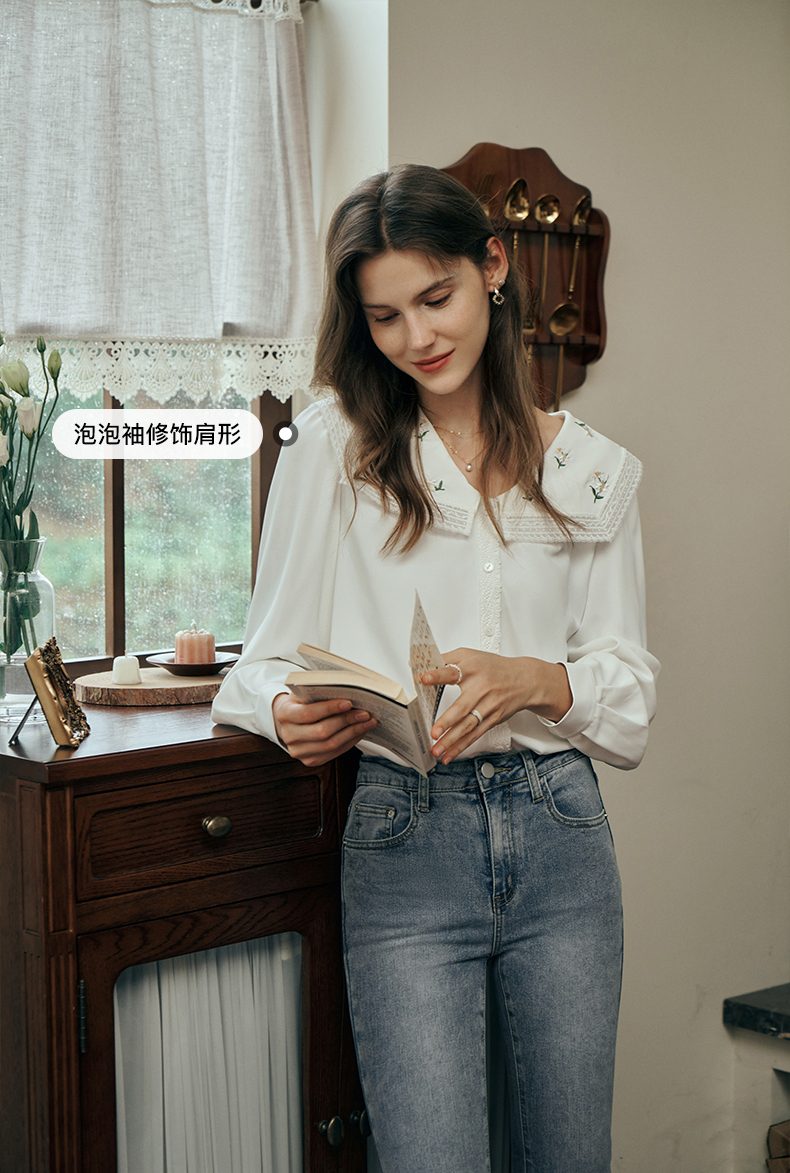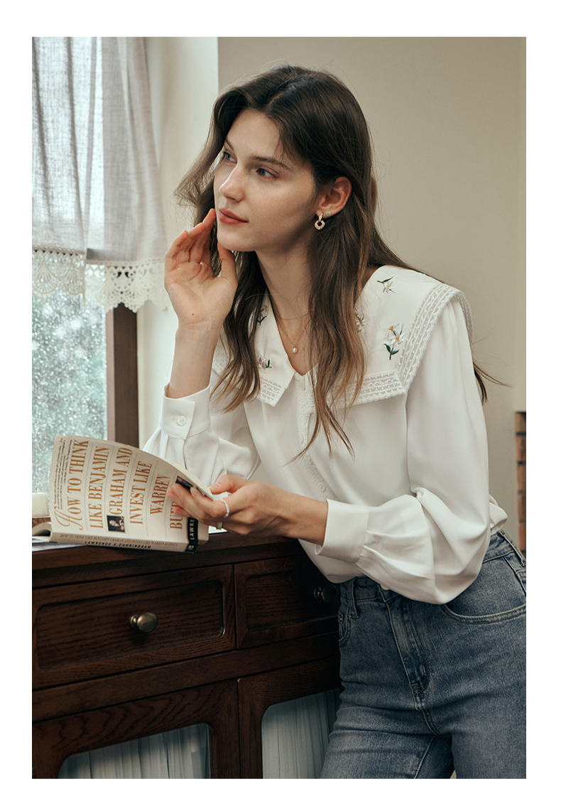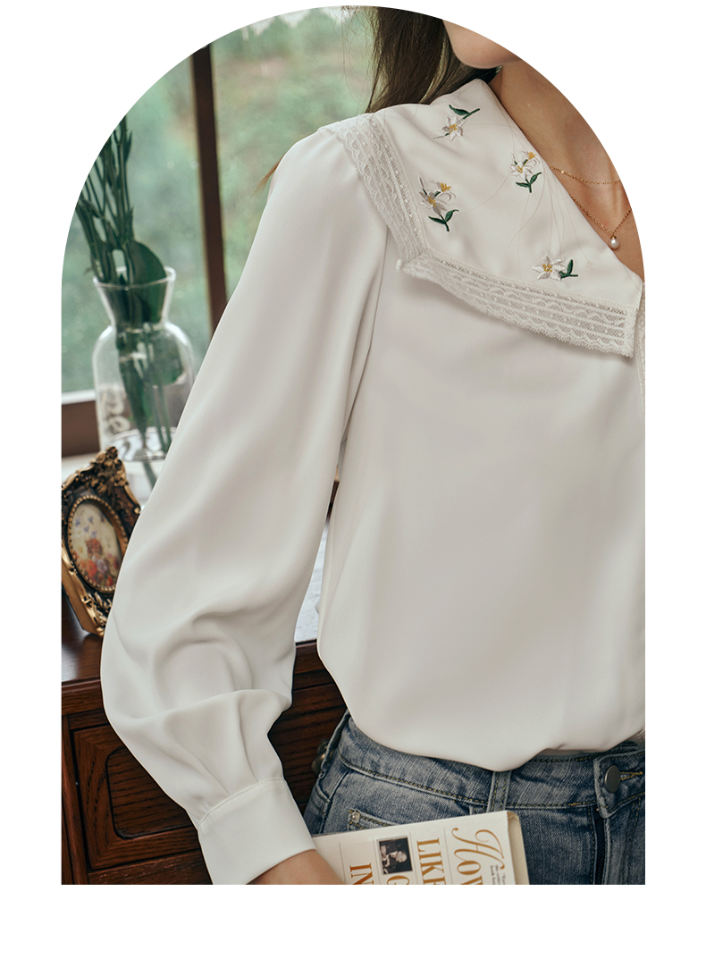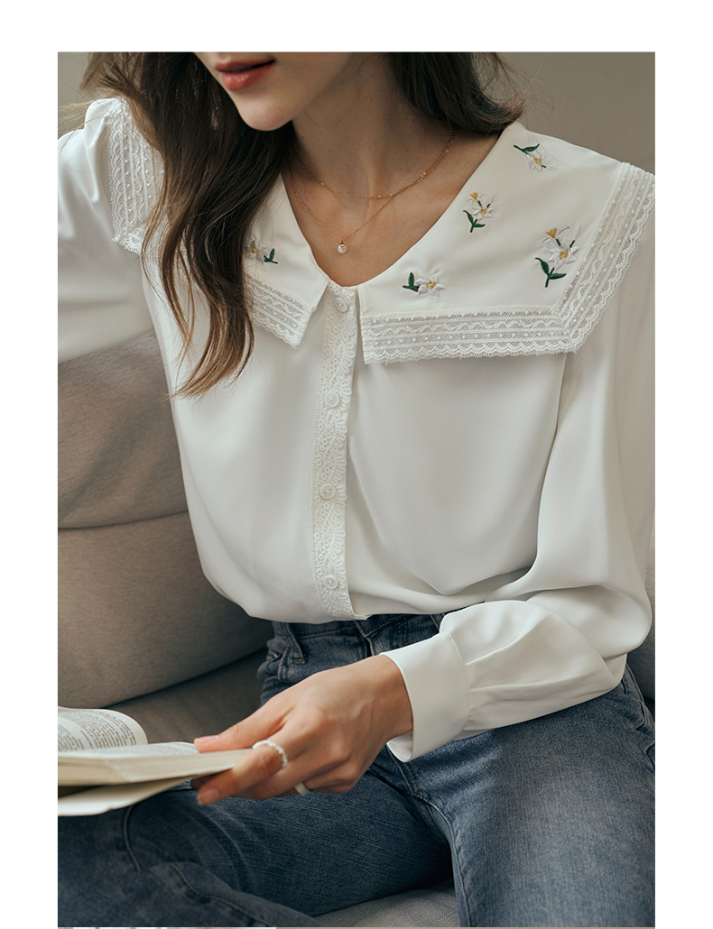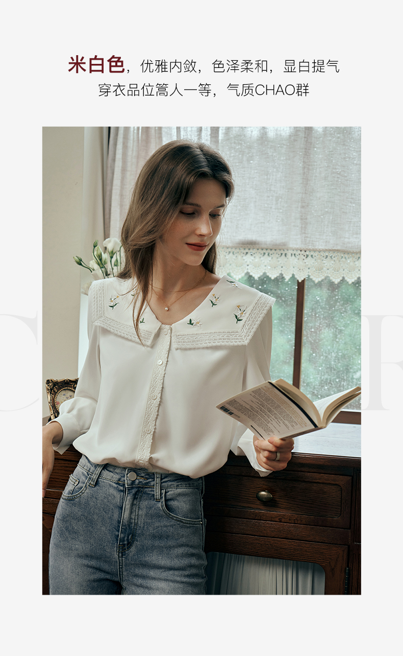 OLrain欧芮儿米白色蕾丝雪纺衫女初秋2023新款宽松刺绣海军领小衫