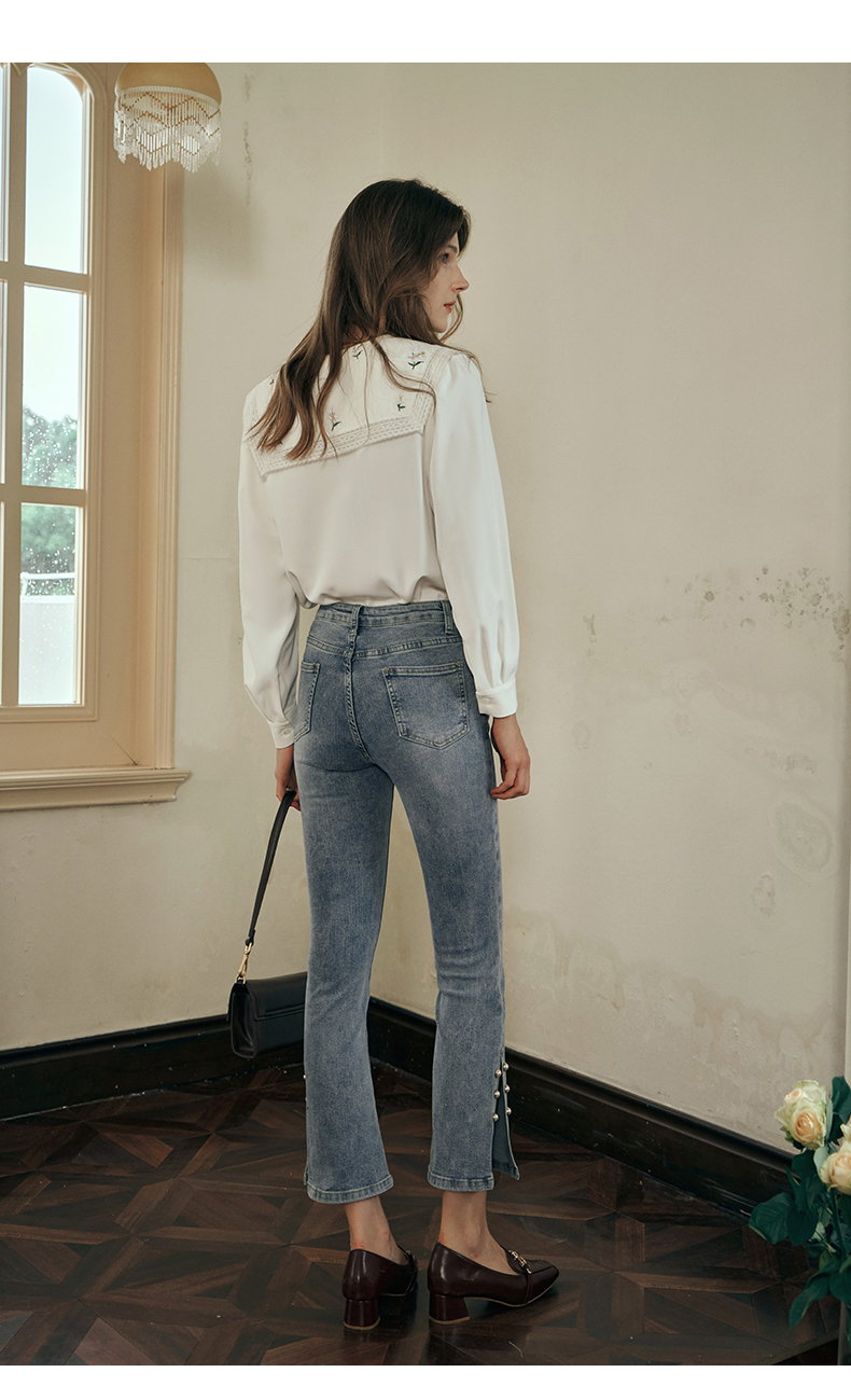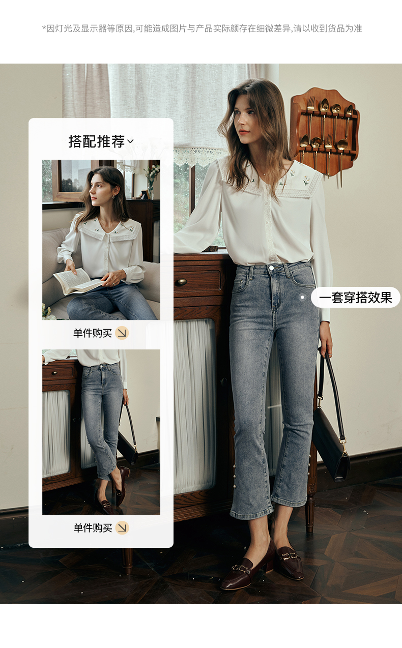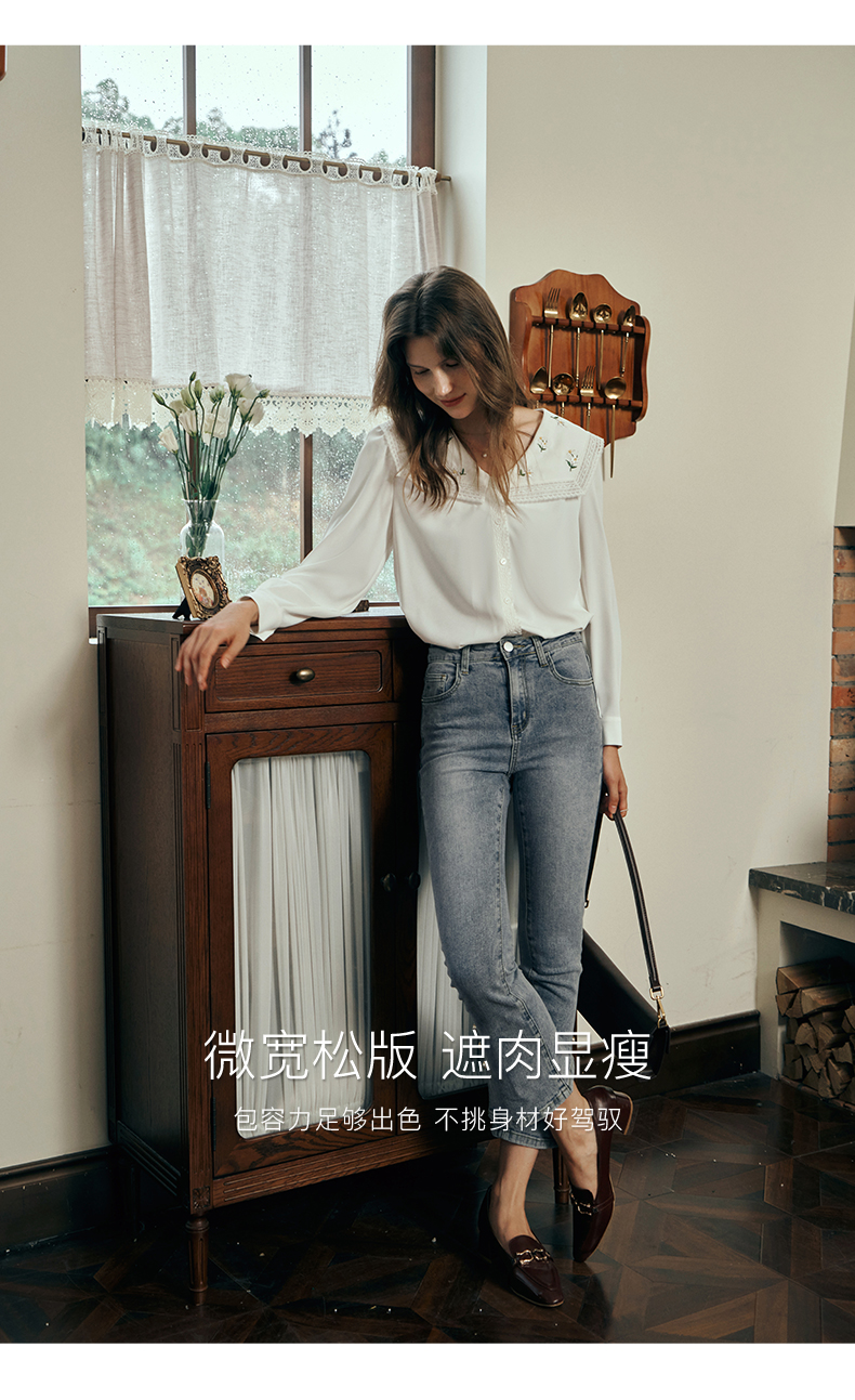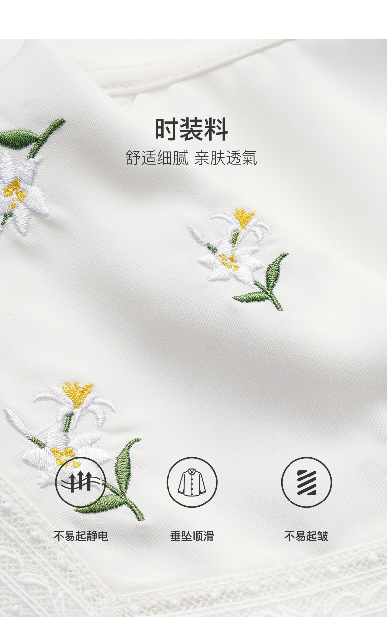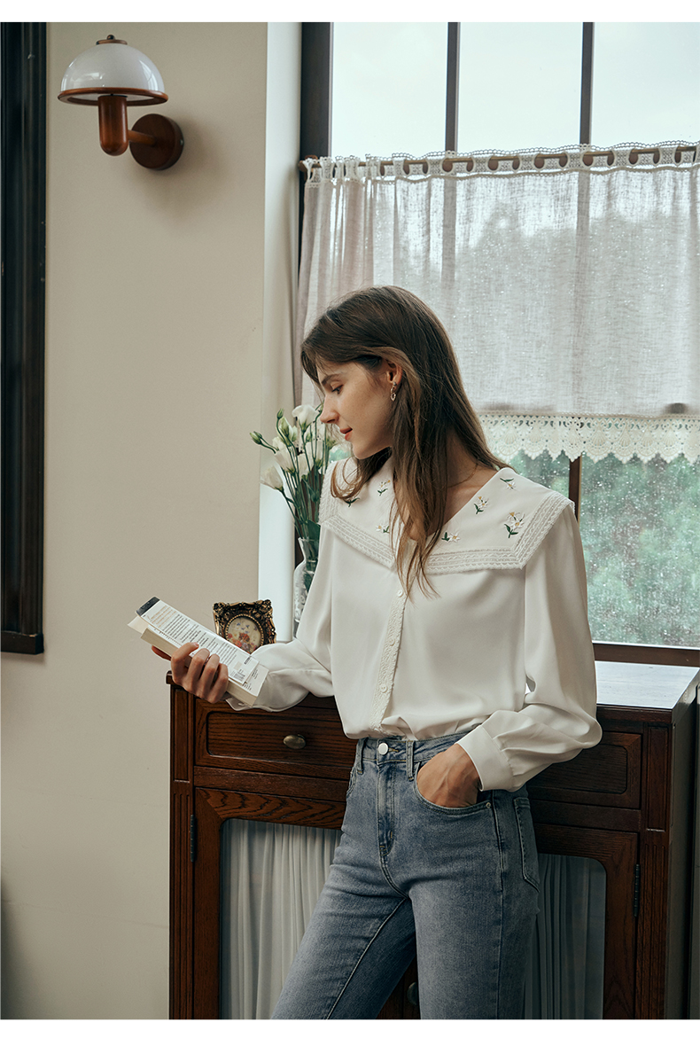OLrain欧芮儿米白色蕾丝雪纺衫女初秋2023新款宽松刺绣海军领小衫