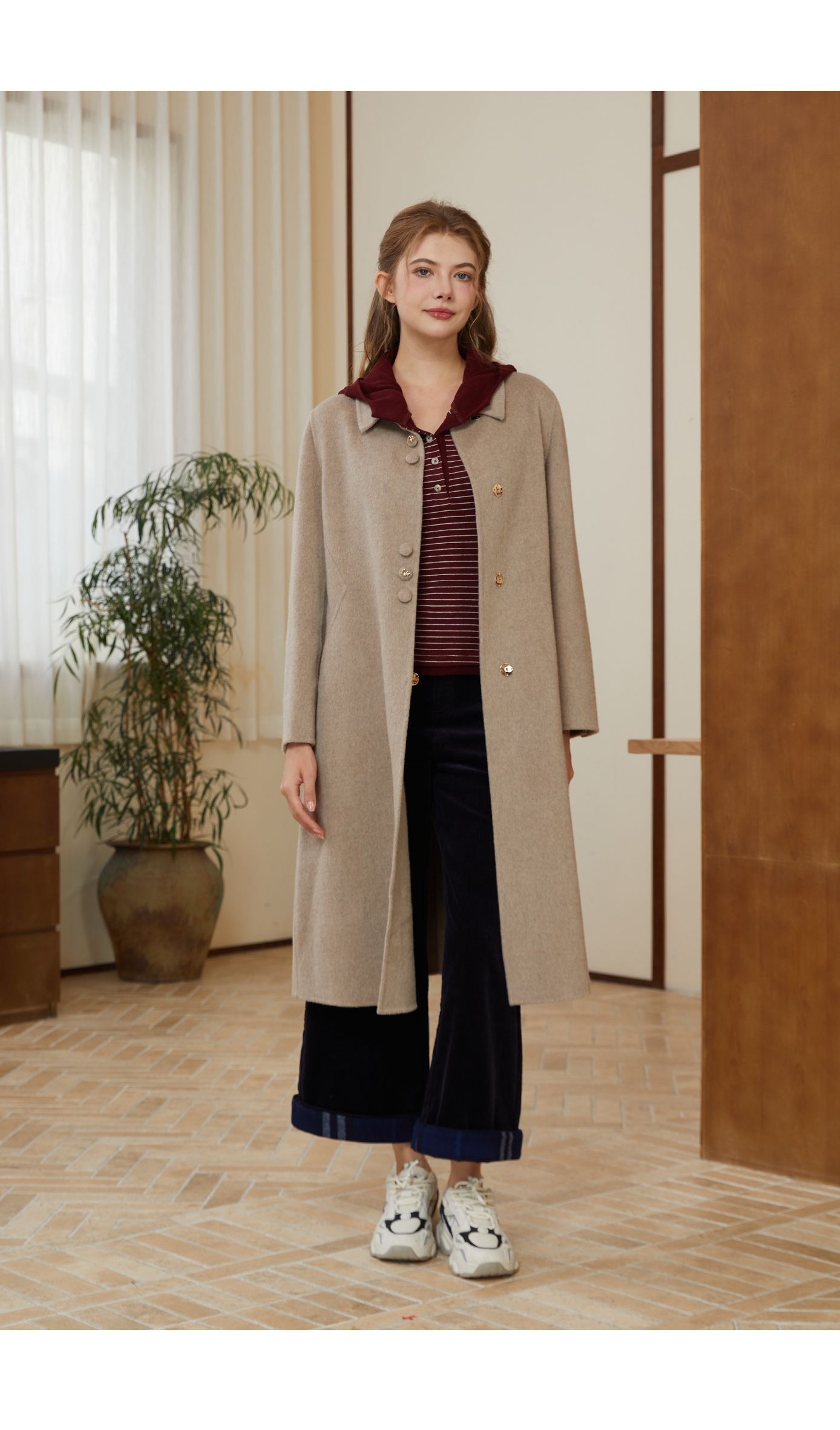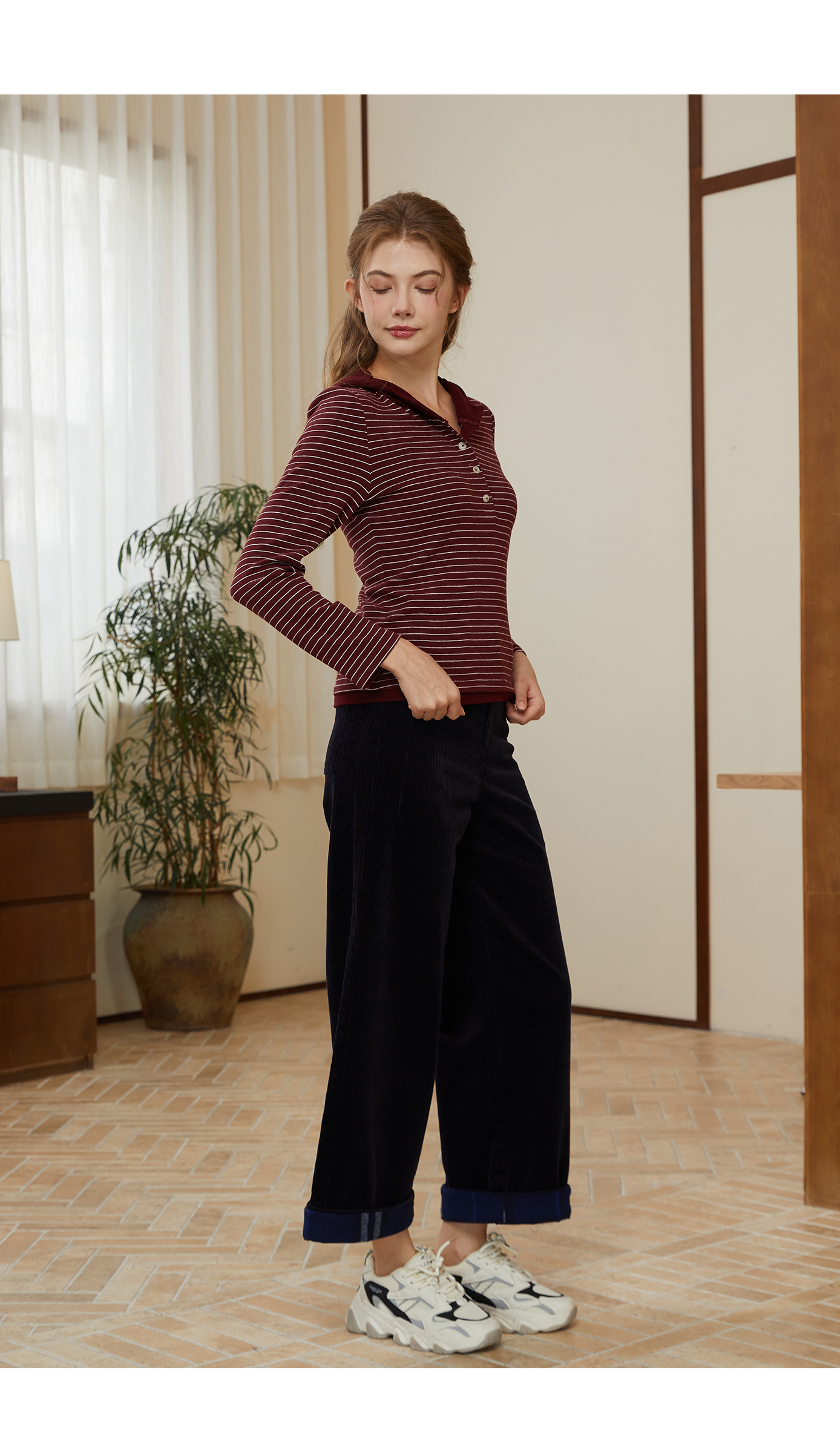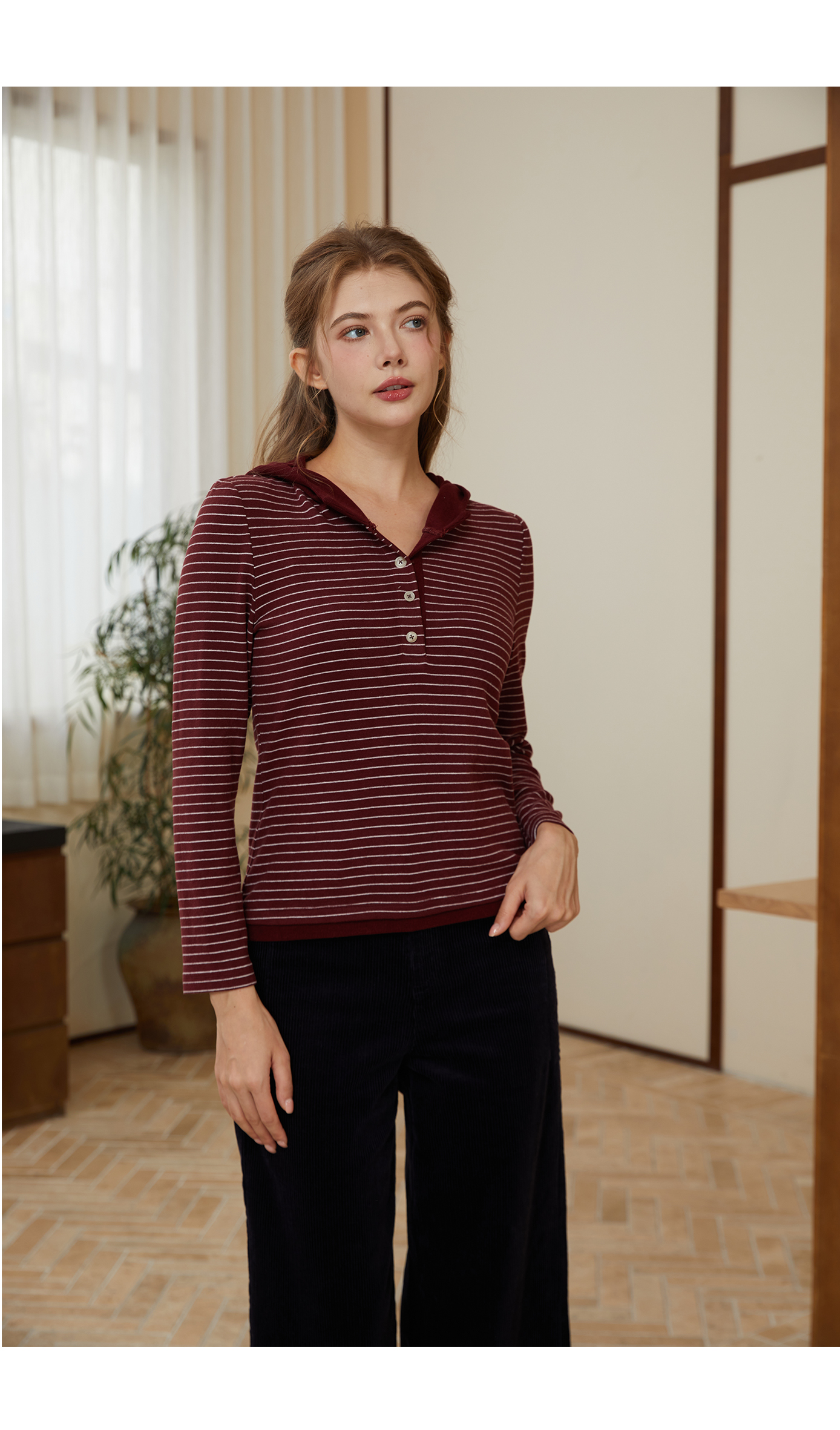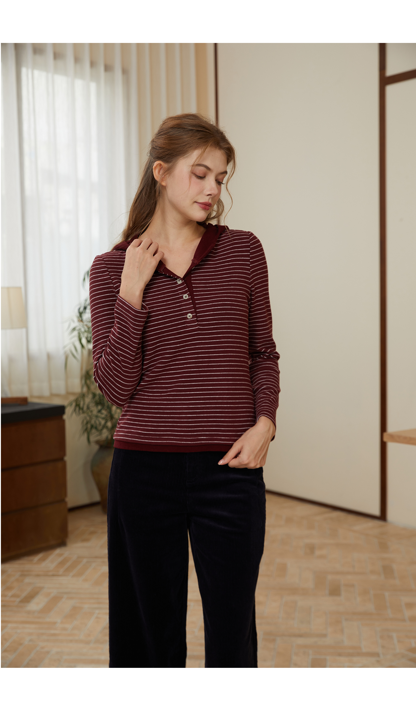 司歌条纹连帽弹力收腰休闲卫衣女秋冬T921284X