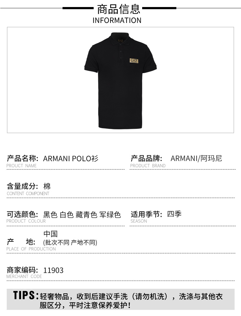 【特惠秒】Armani EA7 男士运动休闲Polo弹棉短袖T恤 11903