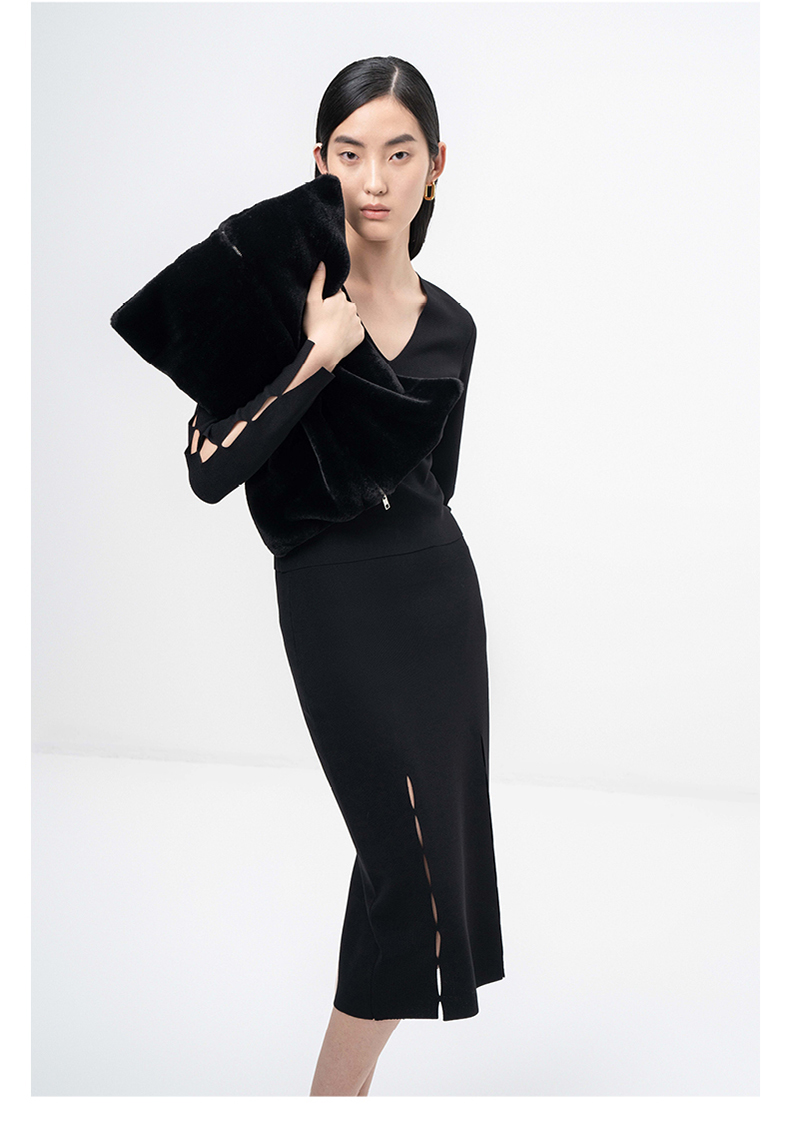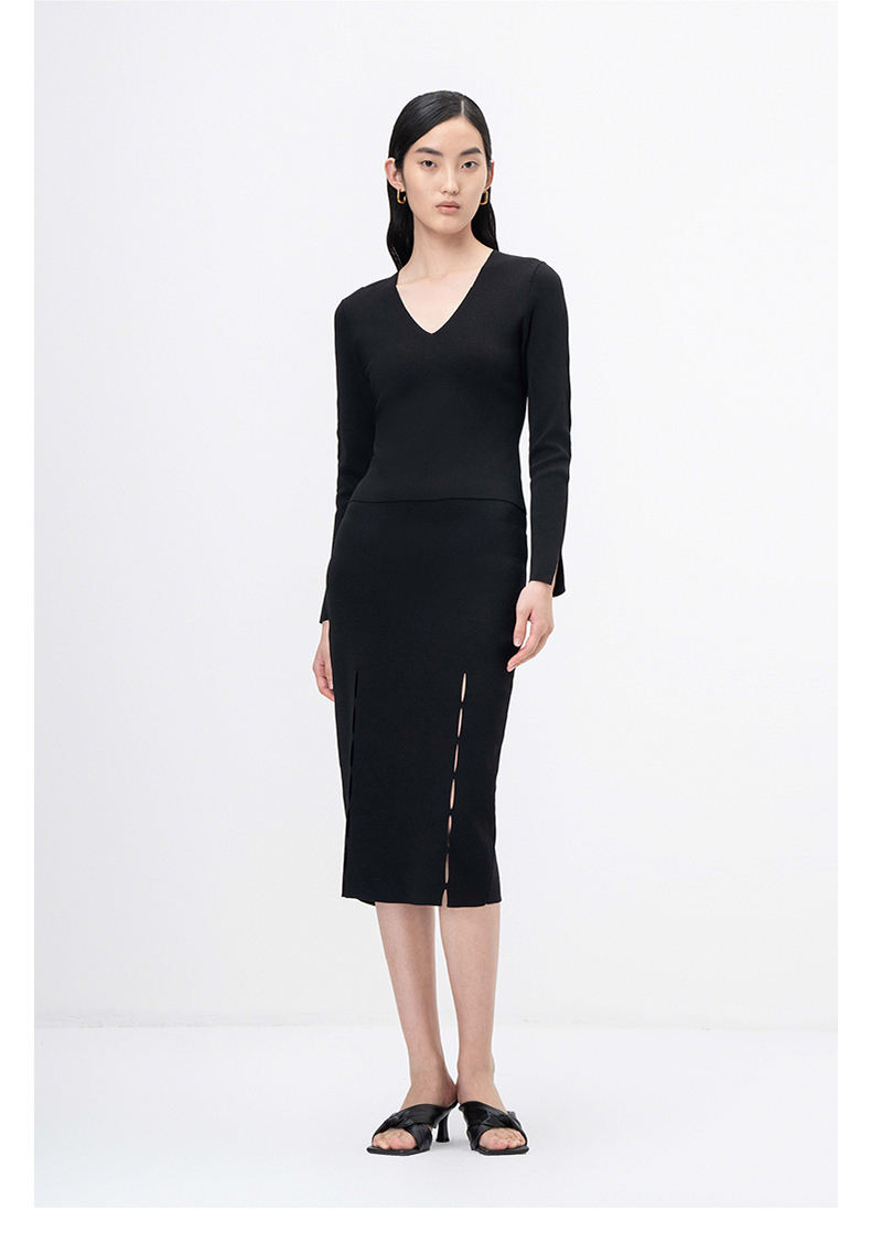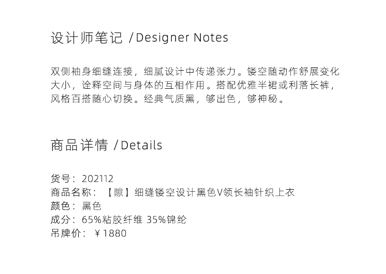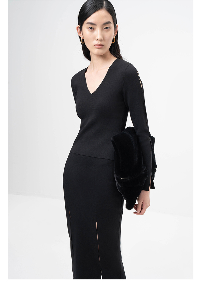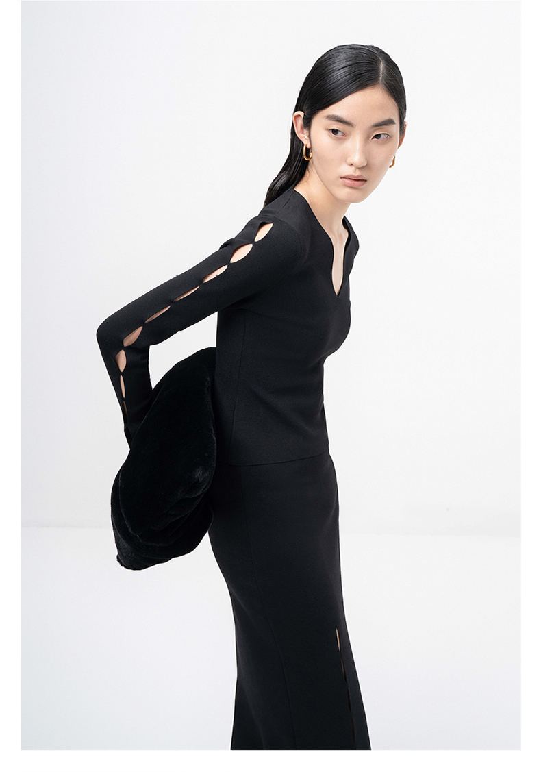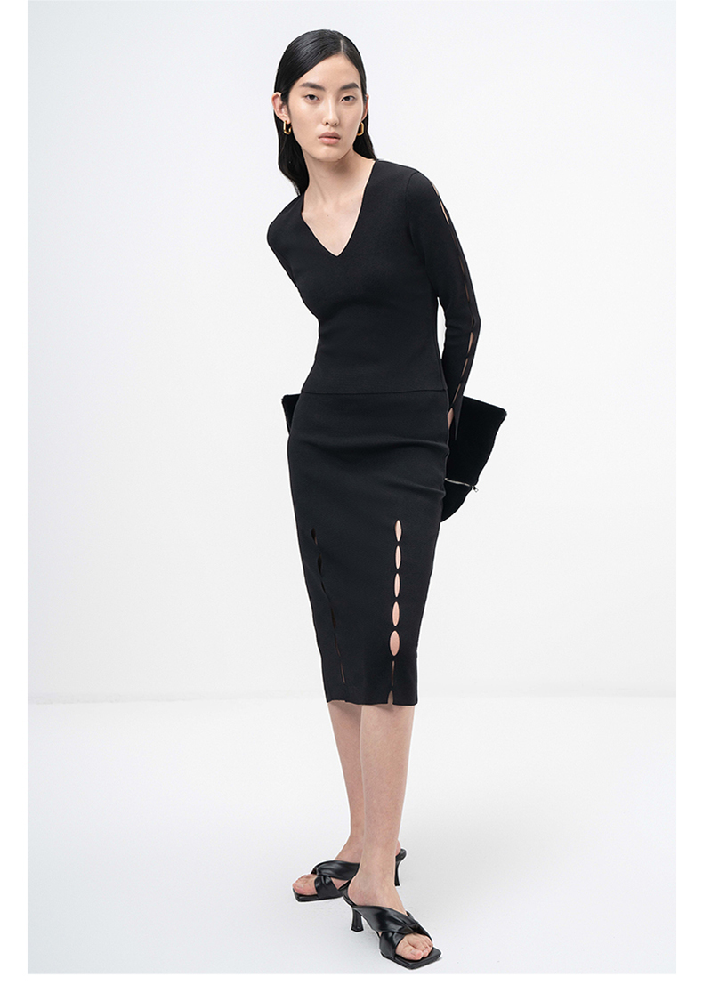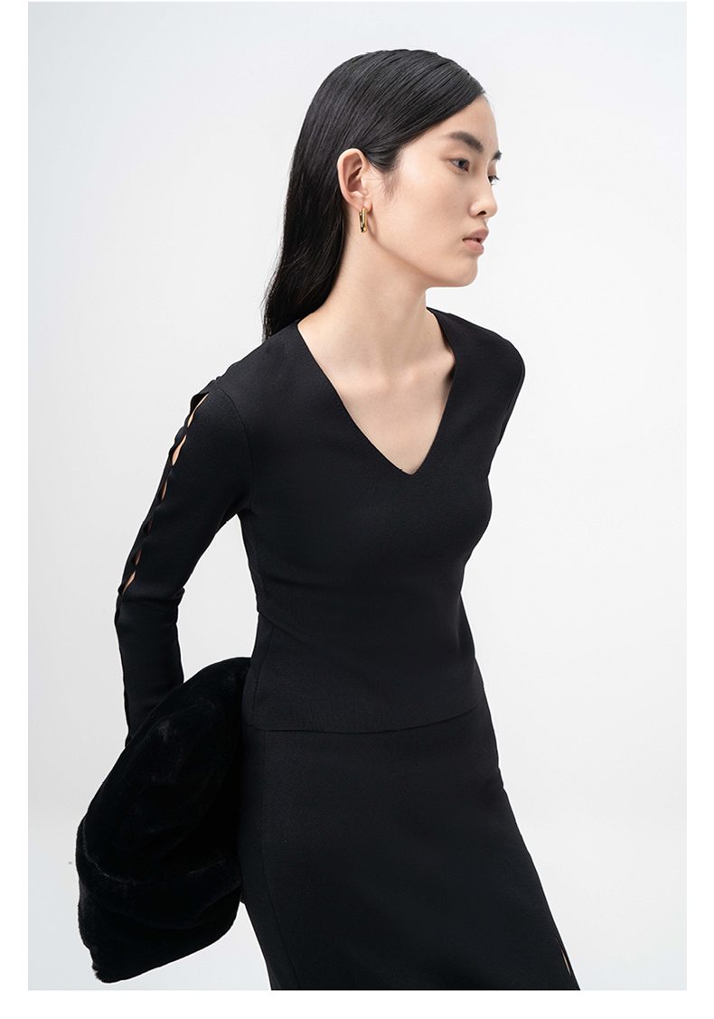 【隙】细缝镂空设计黑色V领长袖针织上衣/202112