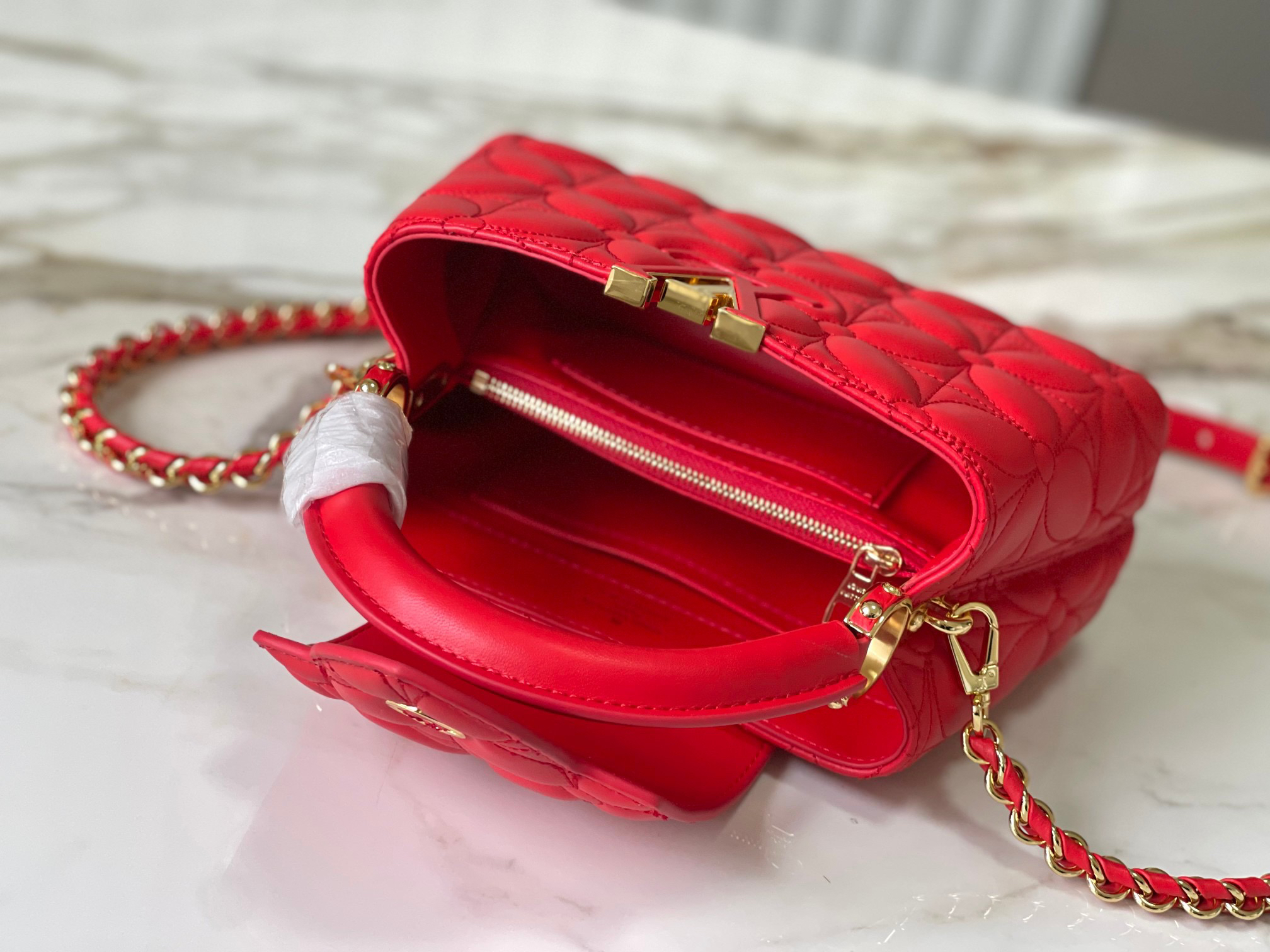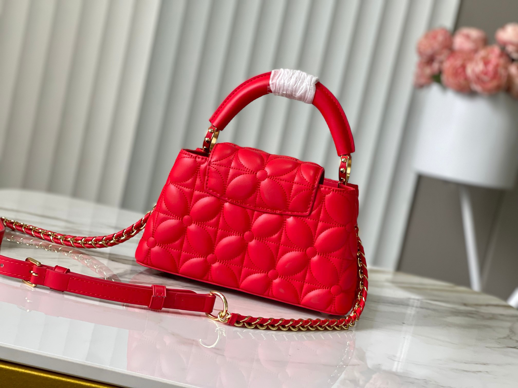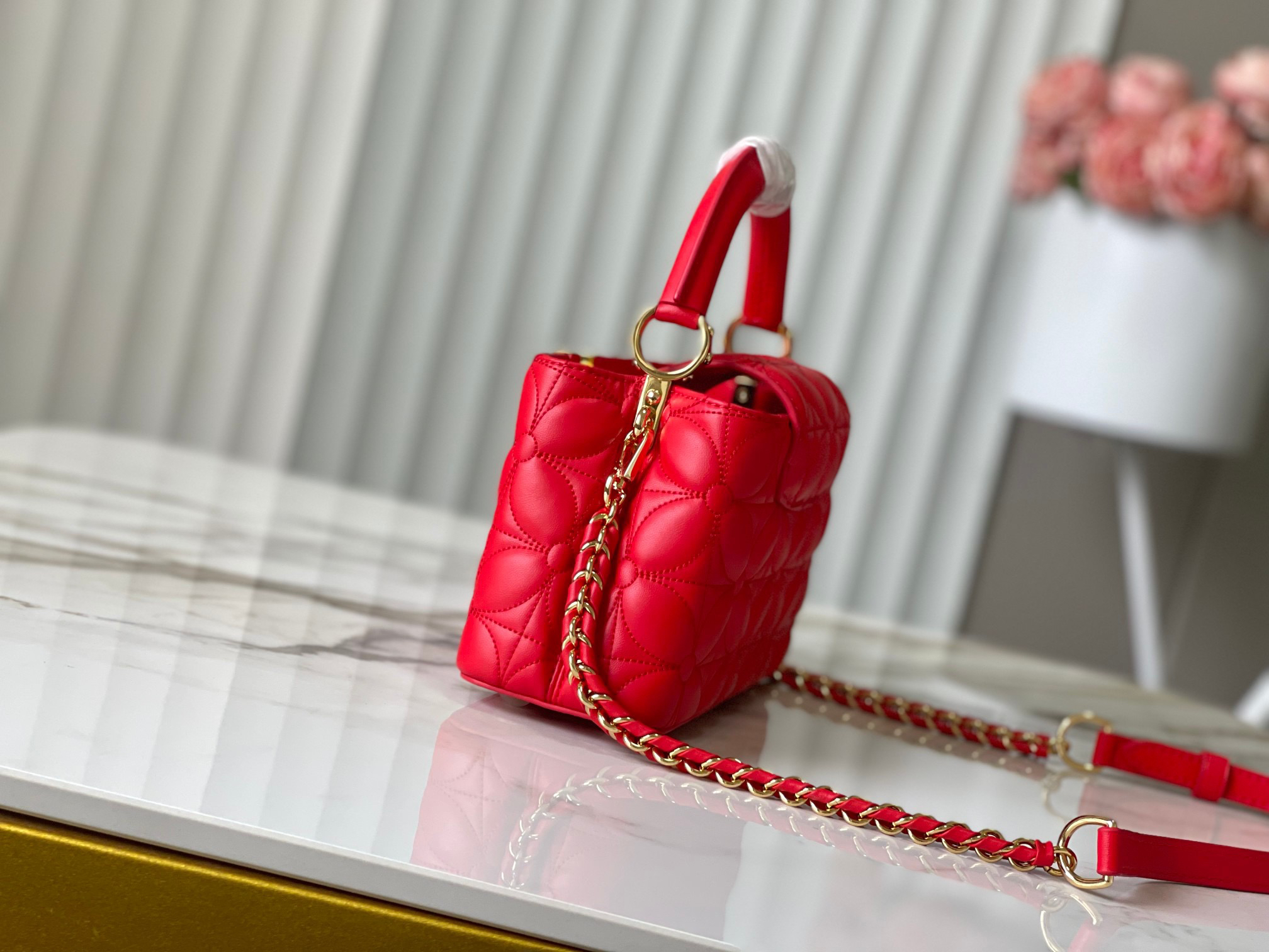 秋冬特惠💰1600 渠道级LV 新品 te级LV 全套包装 M25332/M48865红色四叶草链条款(变码芯片)Monogram 花卉于优雅绗缝中浮现 为 Capucines 手袋吹袭门店装饰之风 柔软绵羊皮塑造沉稳构型与饰边 可拆卸肩带实现舒适肩背体验 Size:22 * 12 * 8 cm