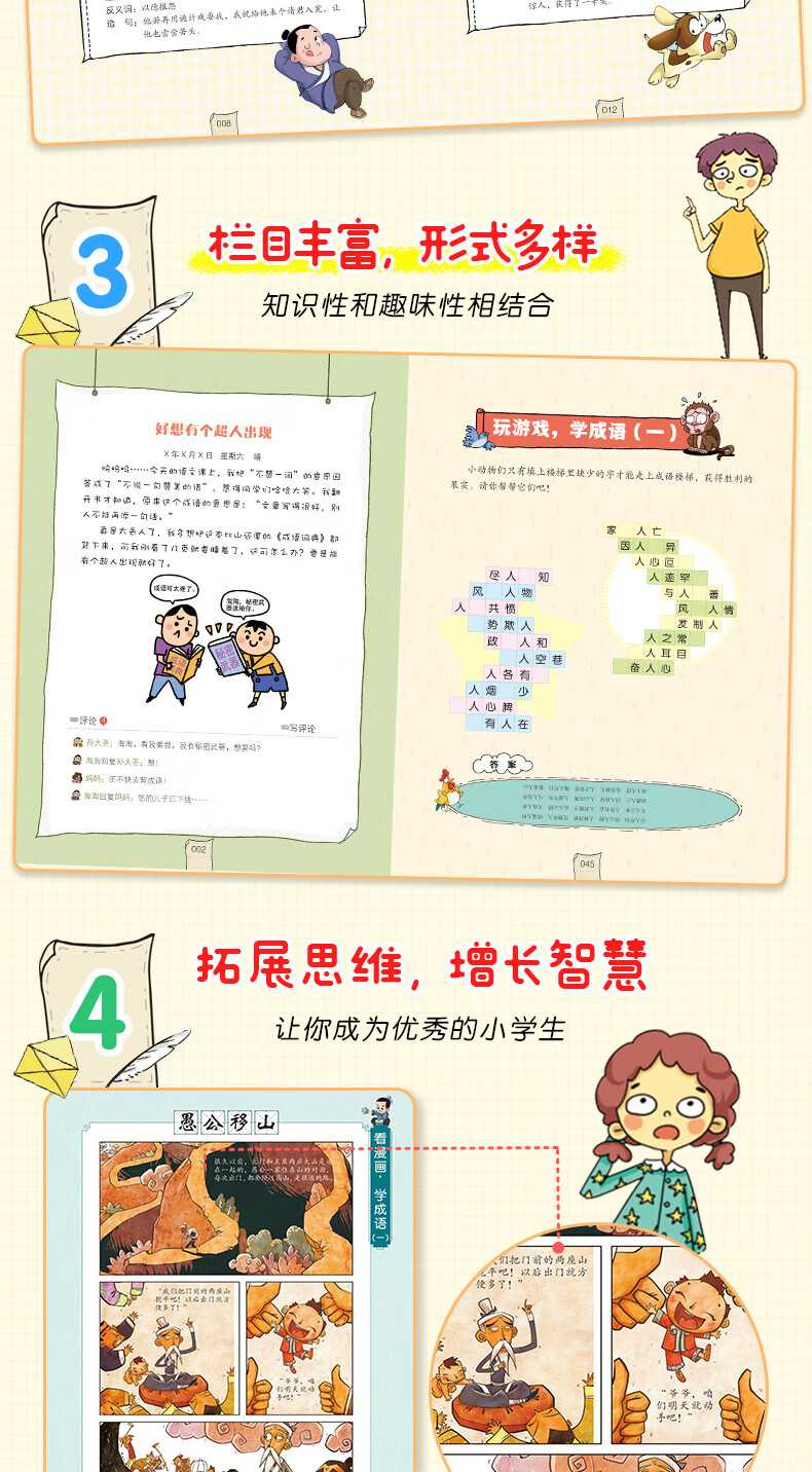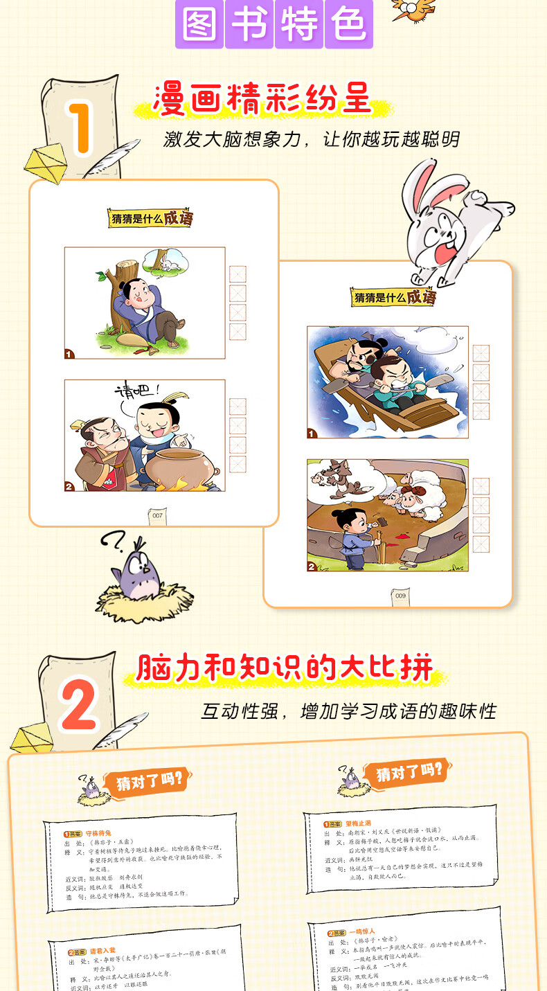 本书让小学生先看漫画猜成语,再给出正确答案,并在答案中附上释义、出处、造句、近义词、反义词等相关拓展内容,详细的介绍了300多个成语的日常使用法。同时,书中还有超有趣的成语漫画故事,小学生可以边欣赏漫画,边学习成语,边阅读故事,让小学生在游戏中感受中华传统文化的博大精深,增加成语词汇量,提高联想能力、阅读能力和写作能力。