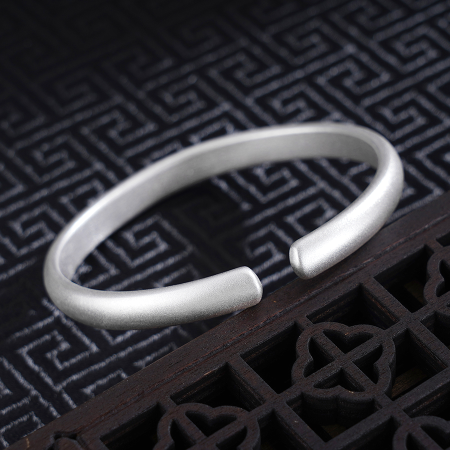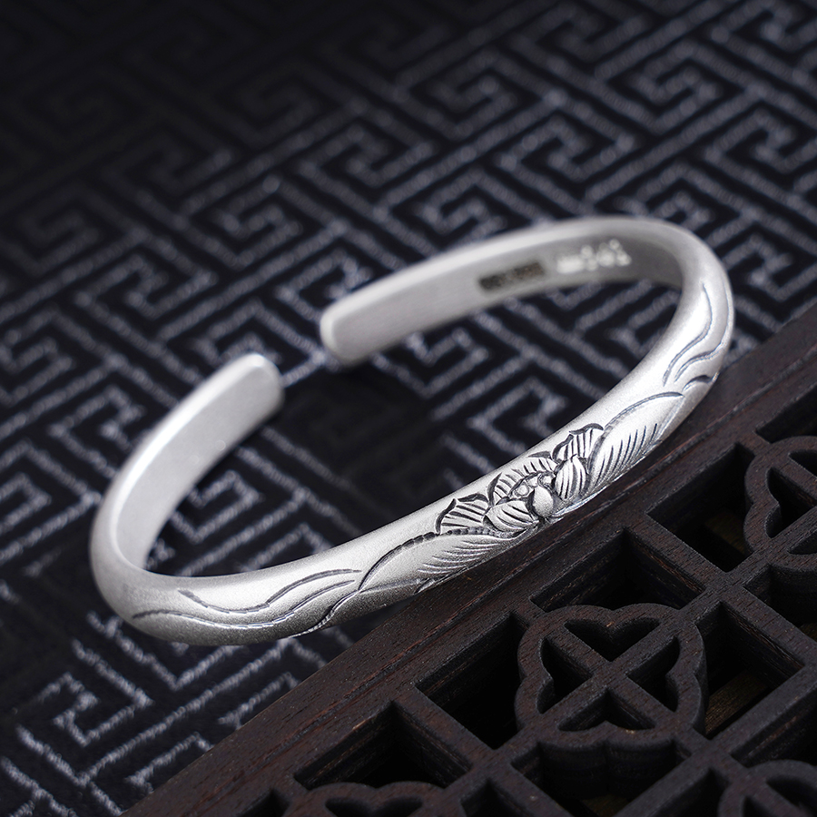 【寓意】:纯银开口手镯,镯面錾刻莲花图案。经仿古做旧处理,似时光轻抚过的诗篇。寓意心守澄明,福泽绵长。