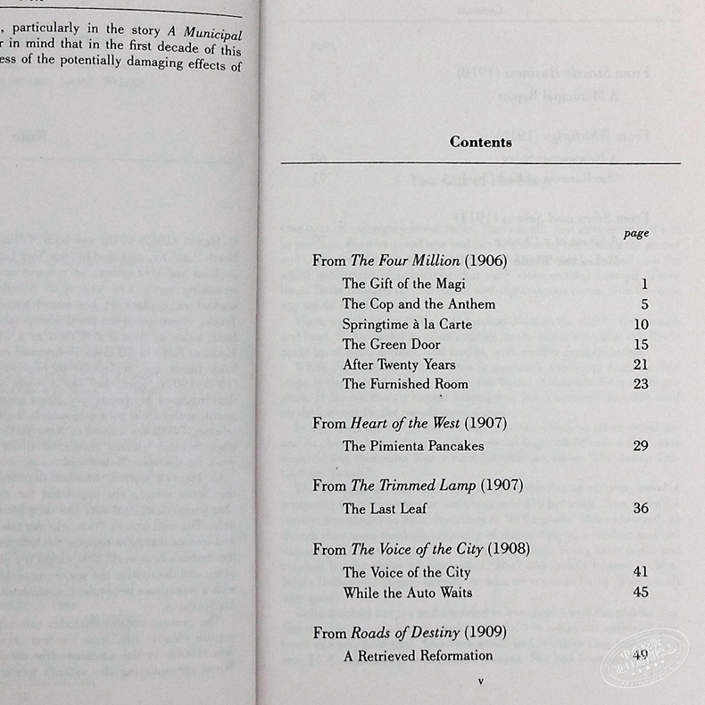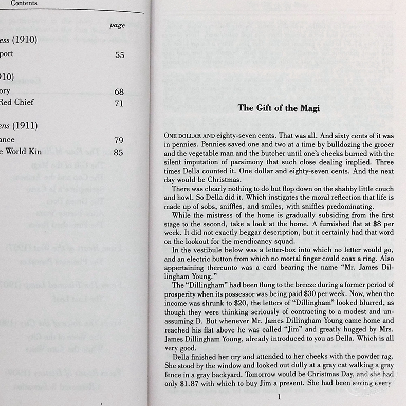 From The Four Million (1906) The Gift of the Magi The Cop and the Anthem Springtime a la Carte The Green Door After Twenty Years The Furnished Room From Heart of the West (1907) The Pimienta Pancakes From The Trimmed Lamp (1907) The Last Leaf From The Voice of the City (1908) The Voice of the City While the Auto Waits From Roads of Destiny (1909) A Retrieved Reformation From Strictly Business (1910) A Municipal Report From Whirligigs (1910) A Newspaper Story The Ransom of Red Chief From Sixes and Sevens (1911) A Ghost of a Chance Makes the Whole World Kin