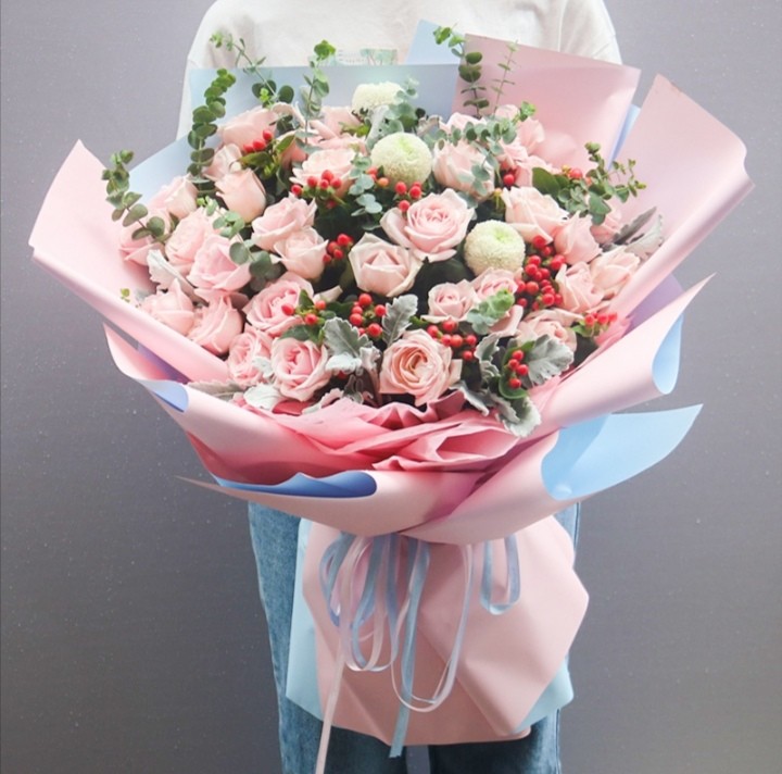 花材:最美的时光 30朵粉佳人玫瑰,3朵乒乓菊,尤加利,红豆,应叶菊搭配(3037)