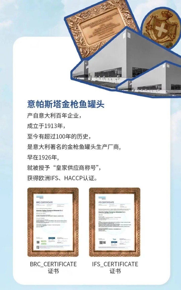 不但如此,作为意大利百年企业,意帕斯塔金枪鱼罐头自1926年就获得了“意大利皇家供应商”的称号!