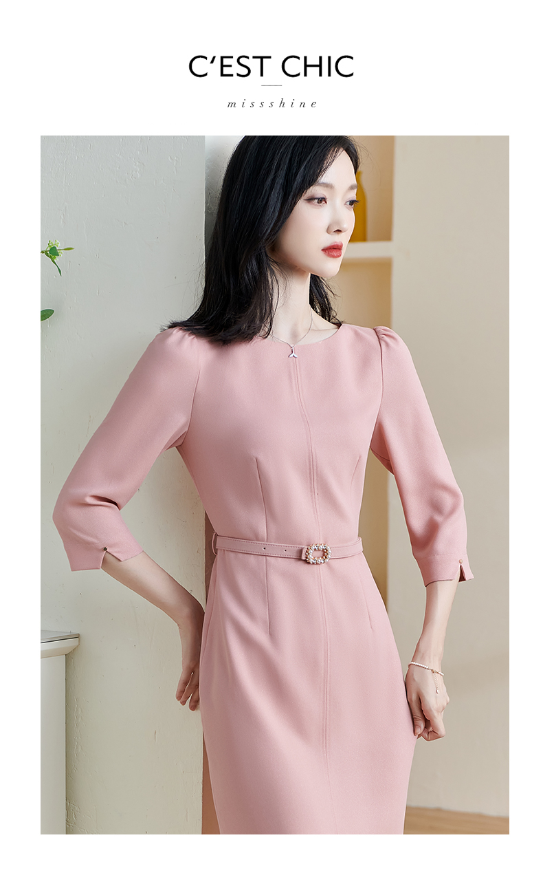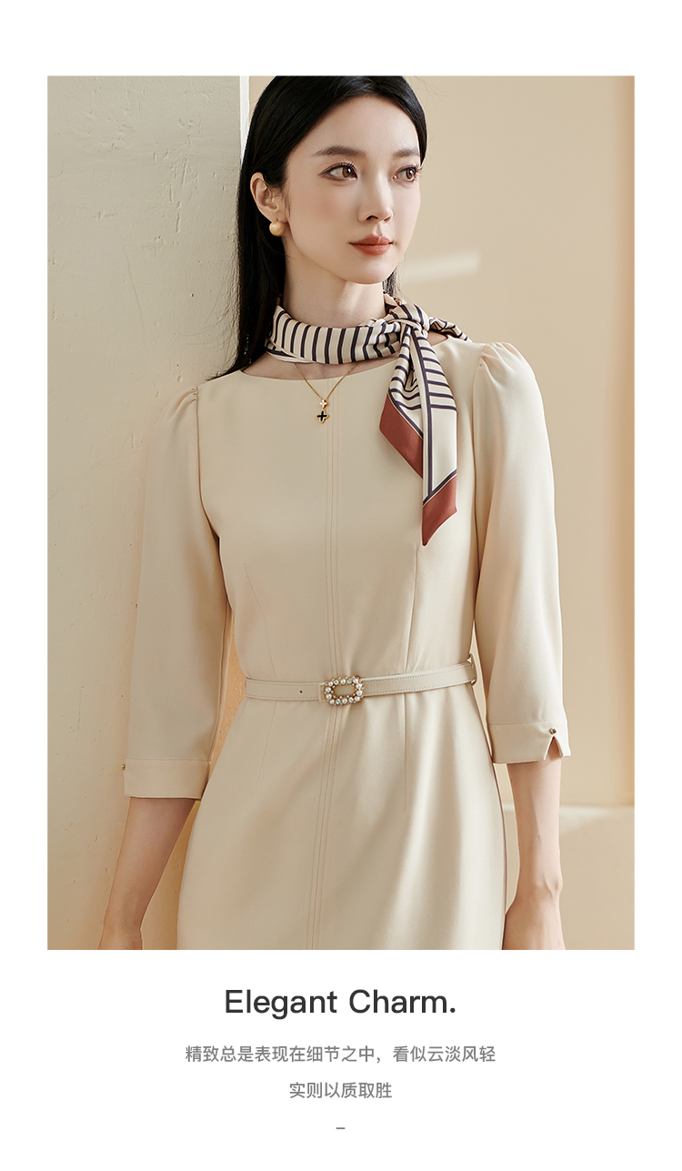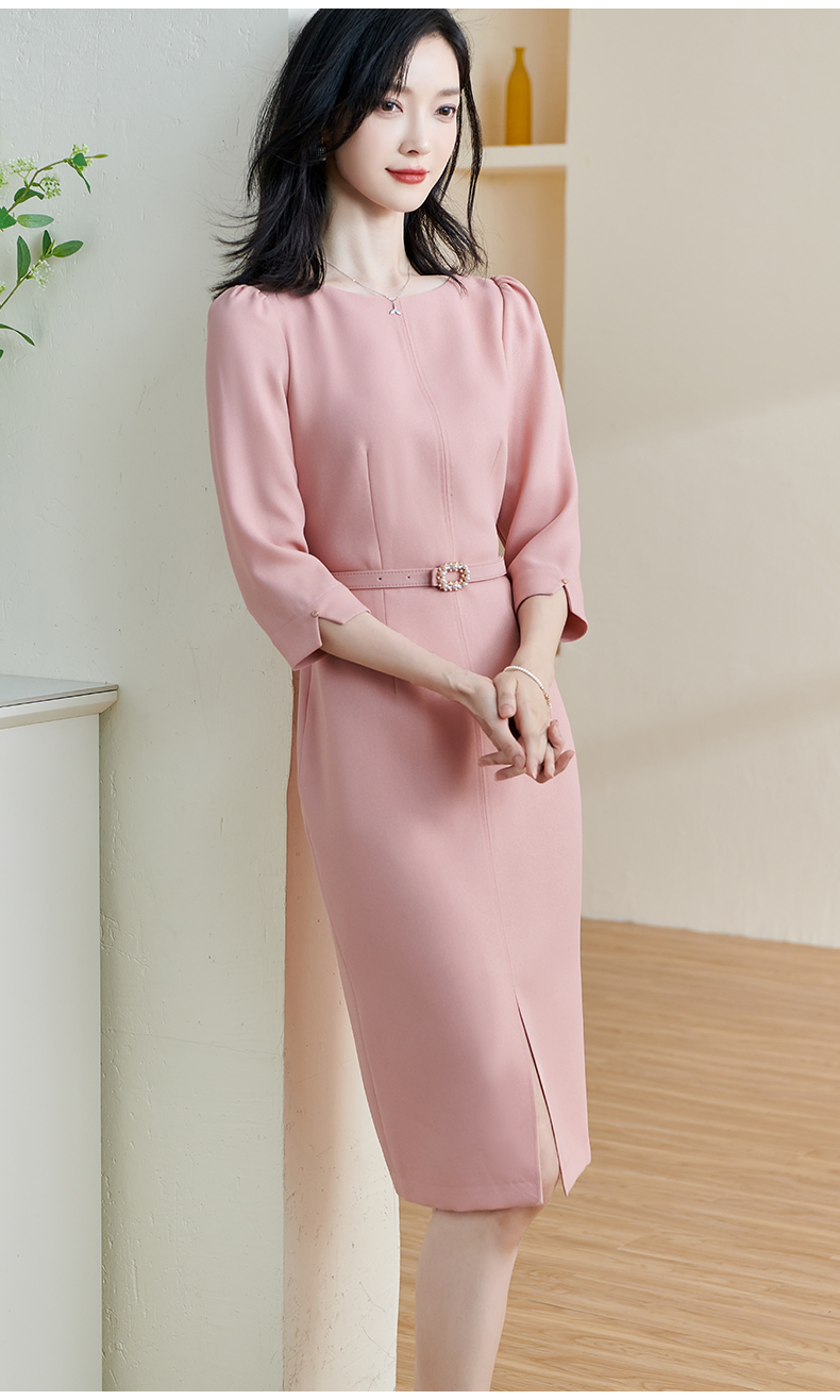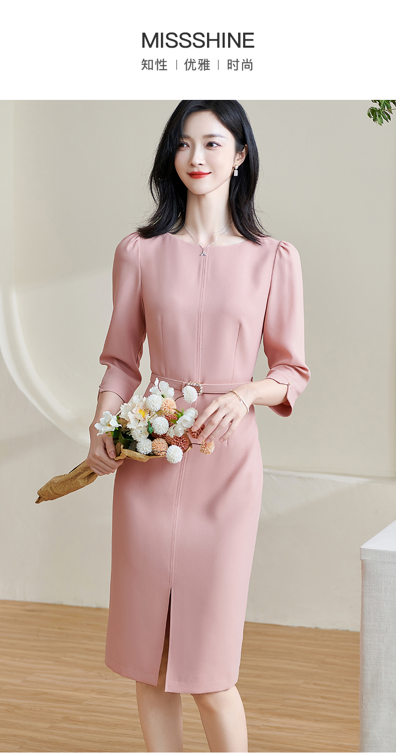 米思阳2026春新款温柔气质中长裙一字领开叉系带显瘦连衣裙2254