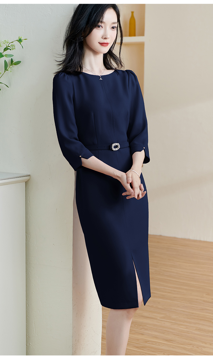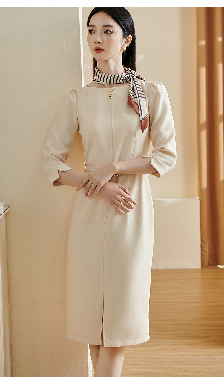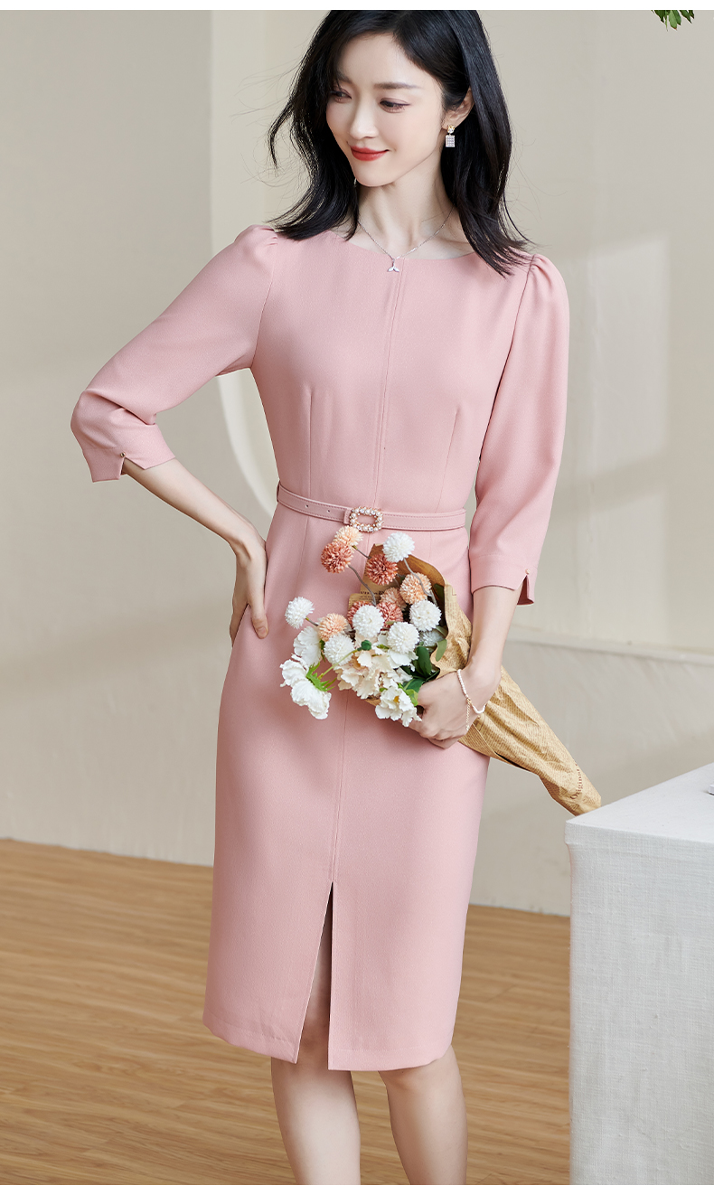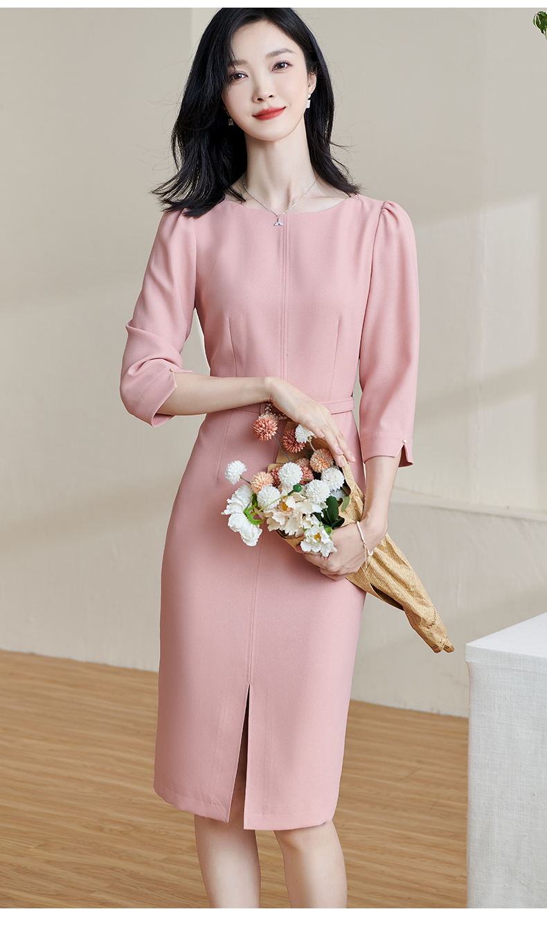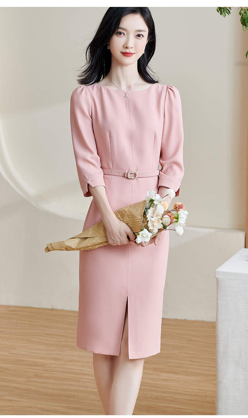 米思阳2026春新款温柔气质中长裙一字领开叉系带显瘦连衣裙2254