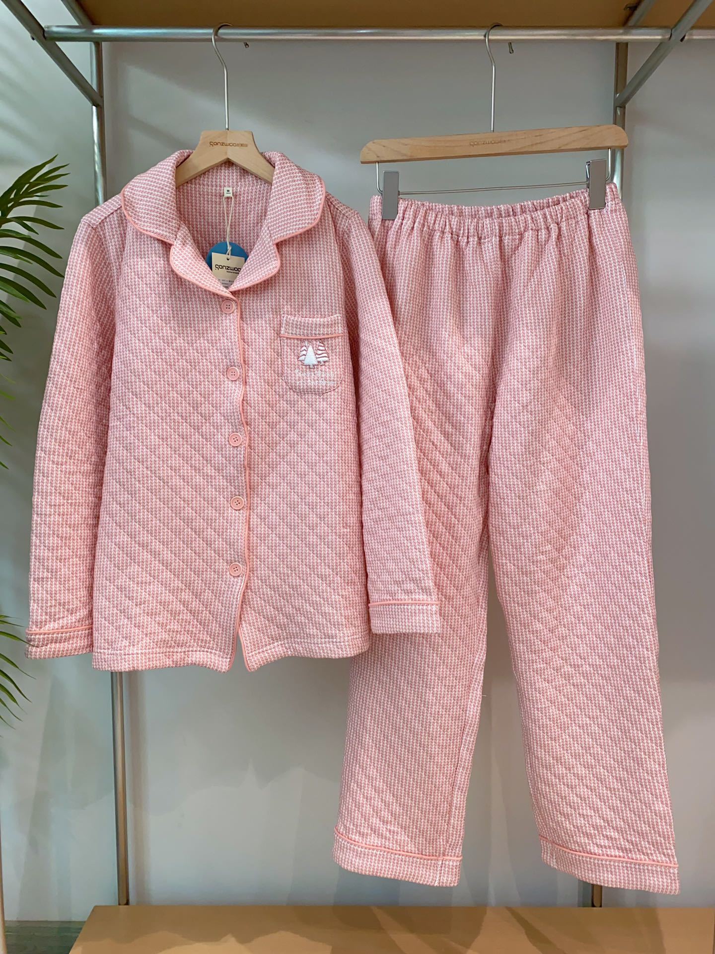 松植屋男女情侣款《杉树》纯色简约设计翻领三层空气棉加厚夹棉睡衣家居服套装