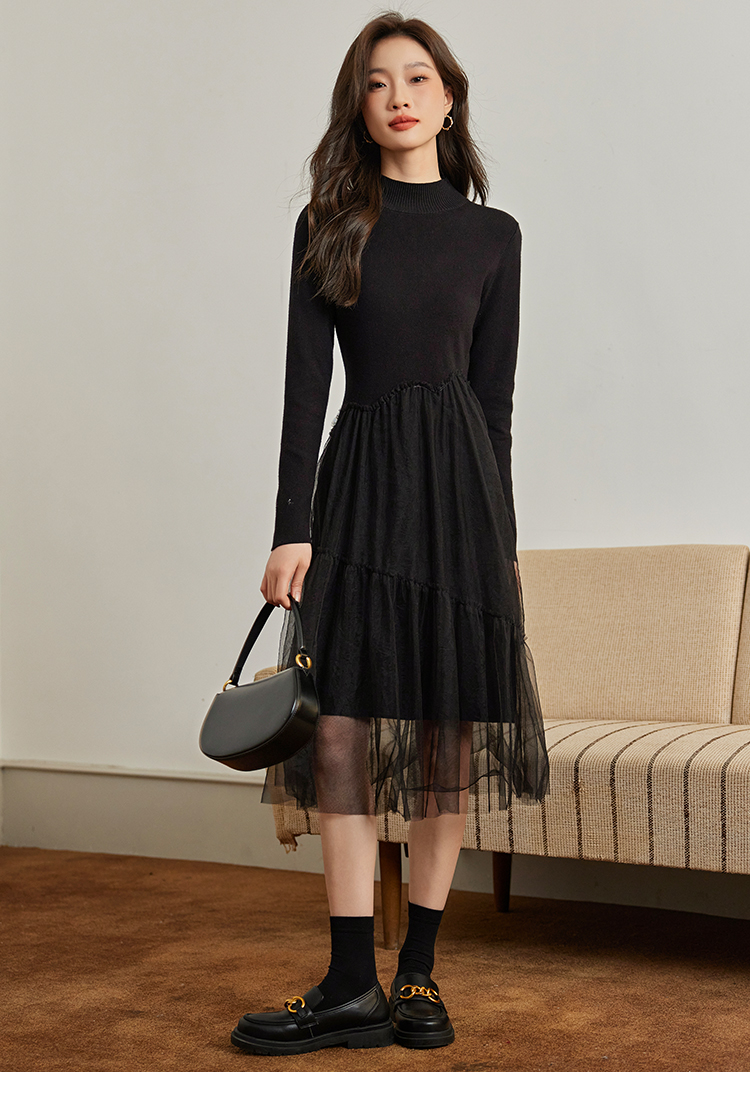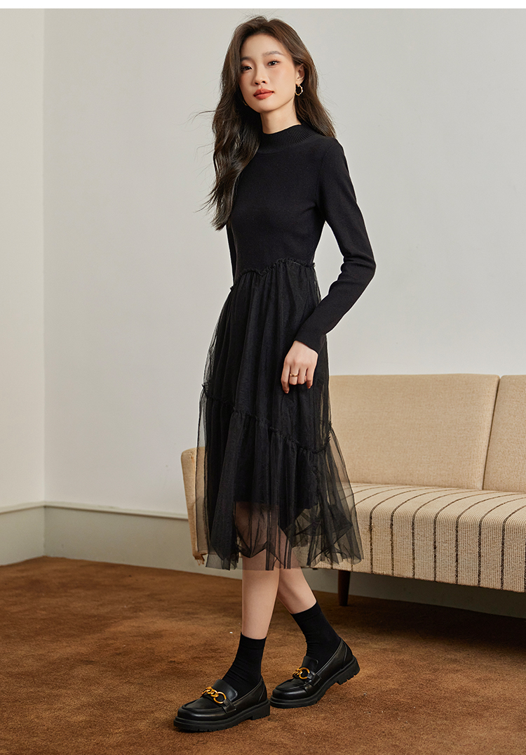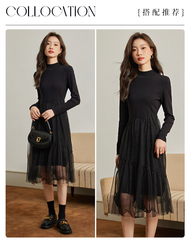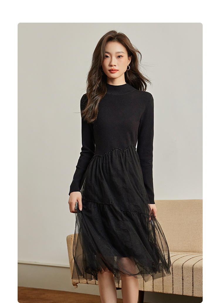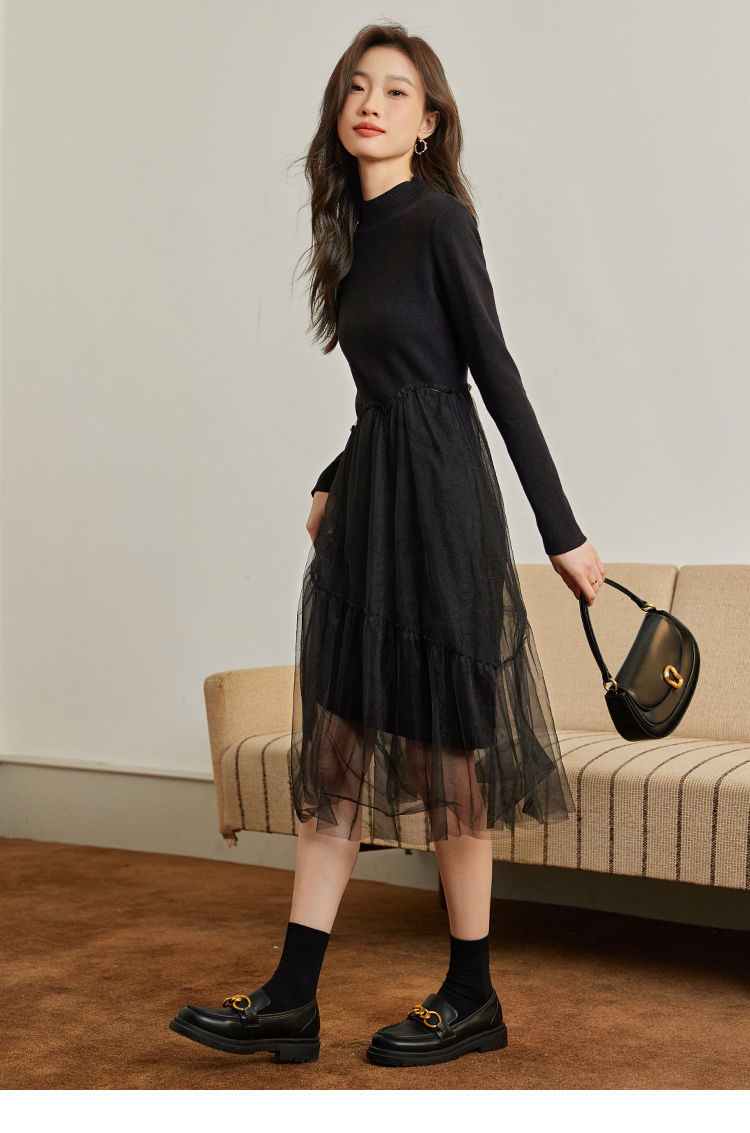 【年终特卖】熙世界半高领针织拼接网纱连衣裙女2025秋冬新款赫本风打底小黑裙