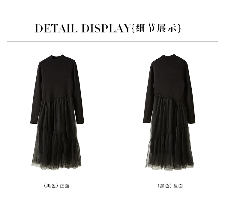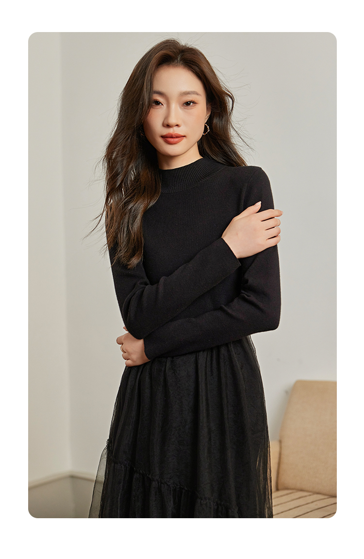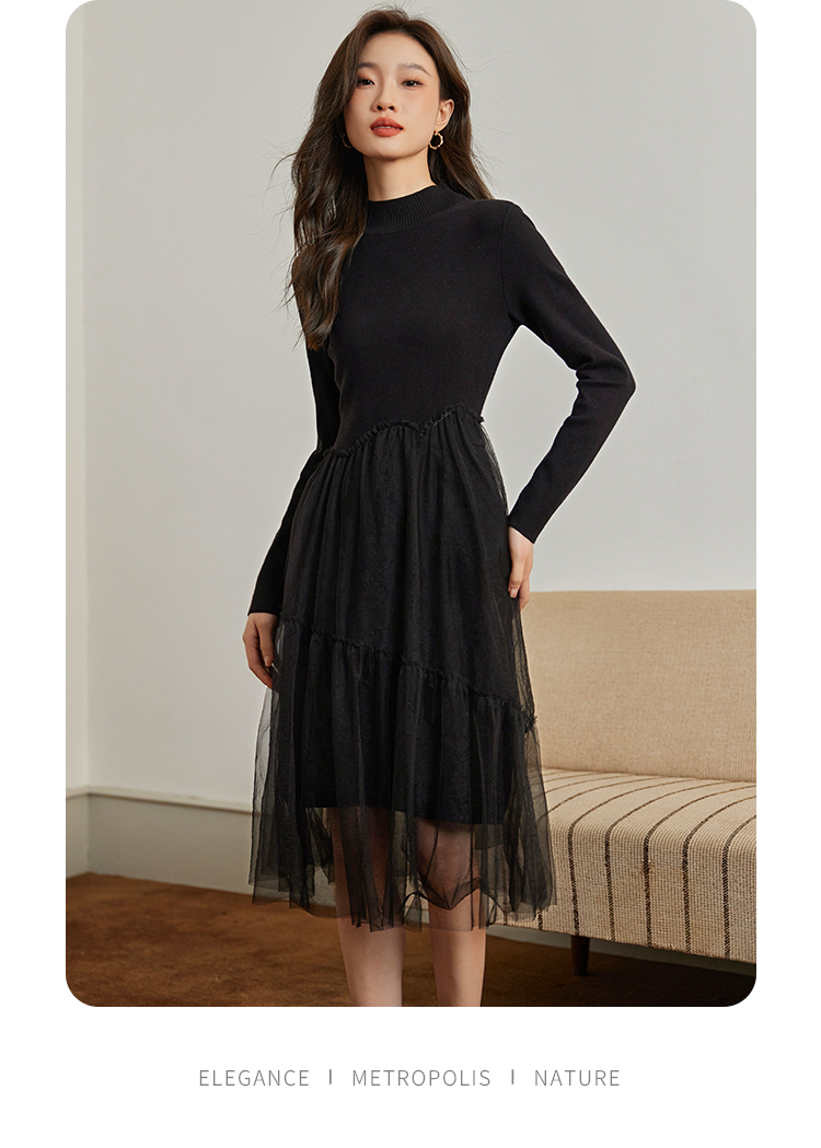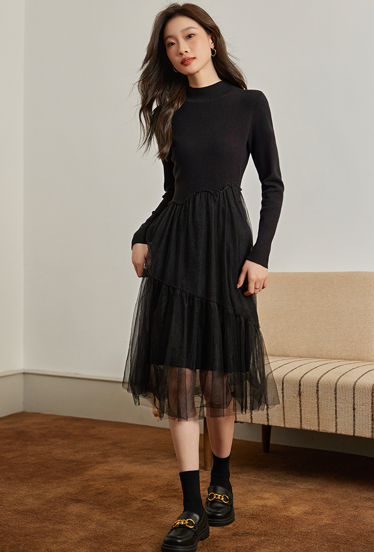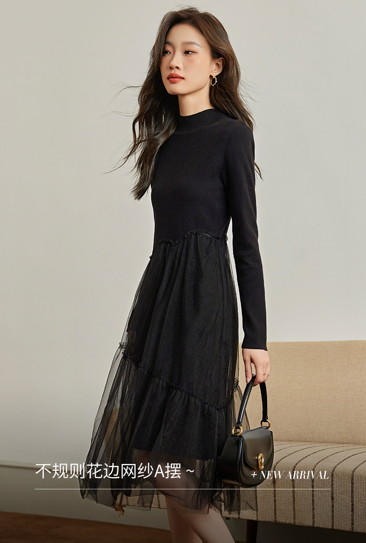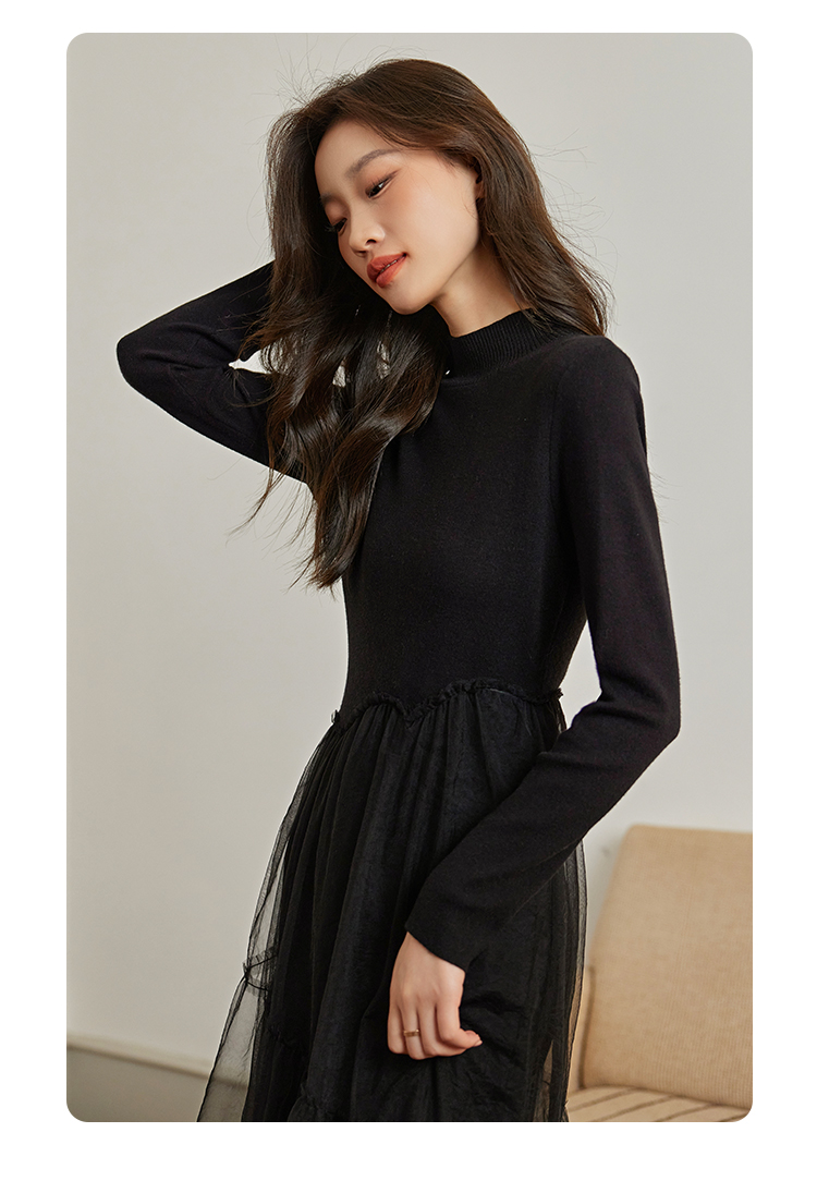 【年终特卖】熙世界半高领针织拼接网纱连衣裙女2025秋冬新款赫本风打底小黑裙