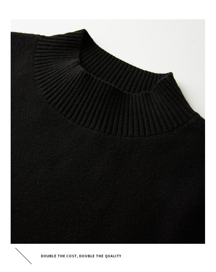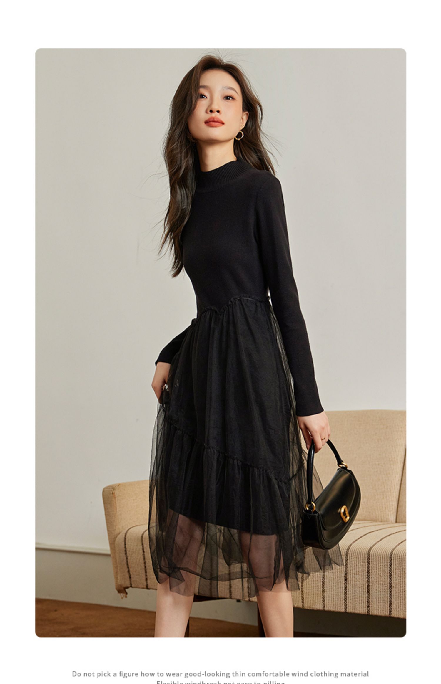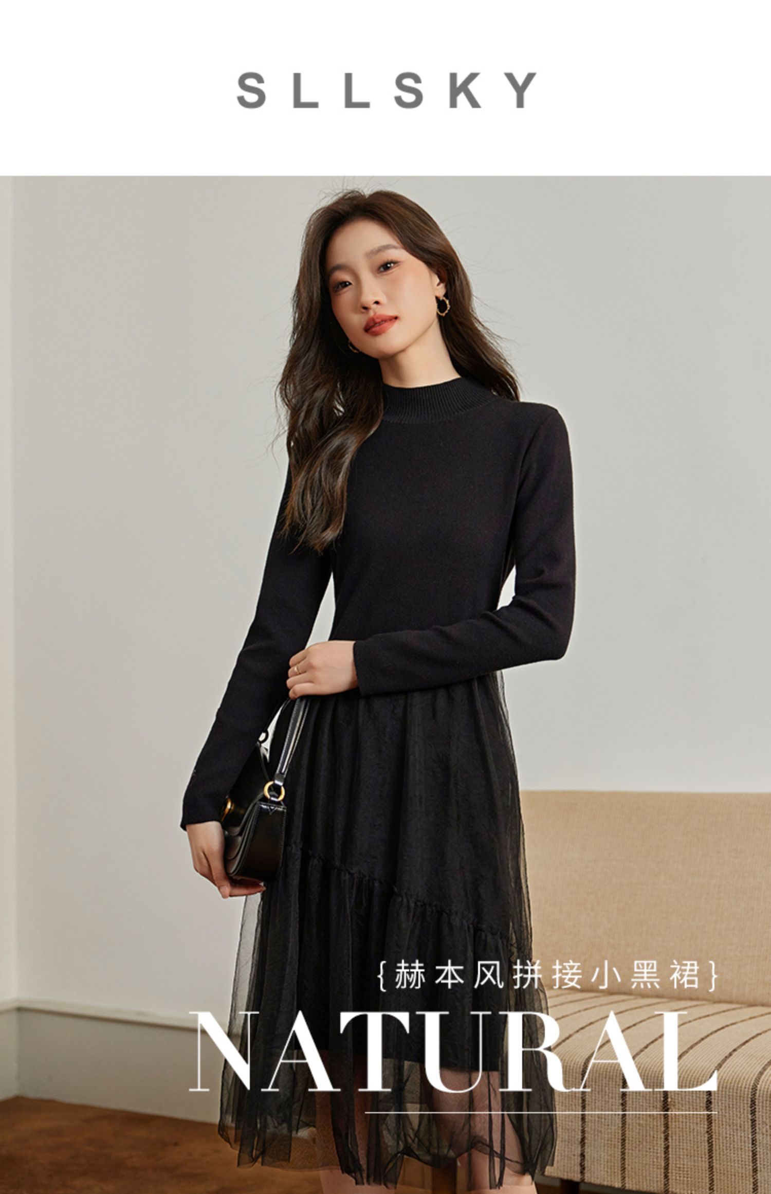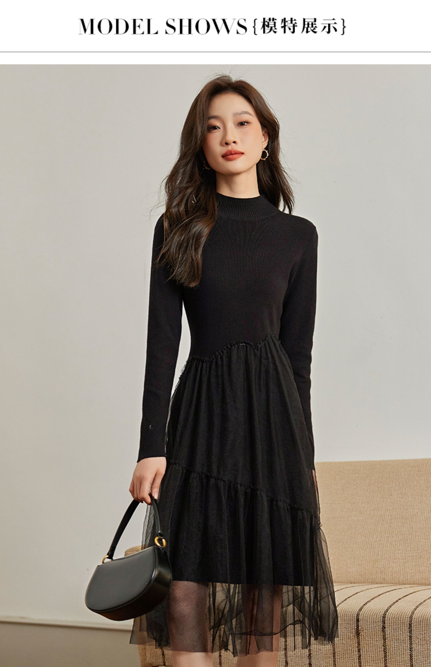 【年终特卖】熙世界半高领针织拼接网纱连衣裙女2025秋冬新款赫本风打底小黑裙