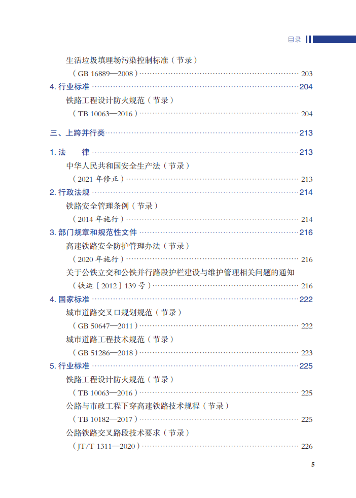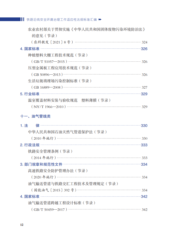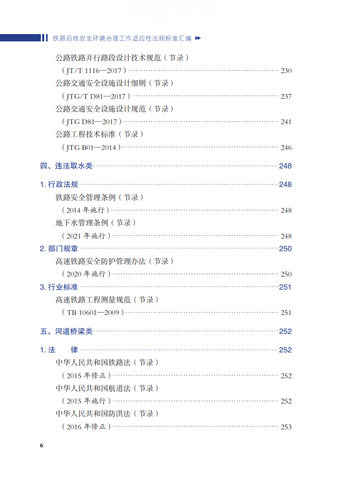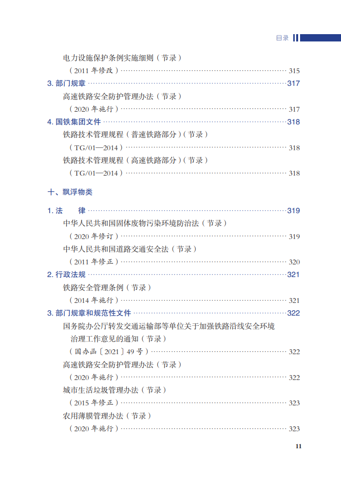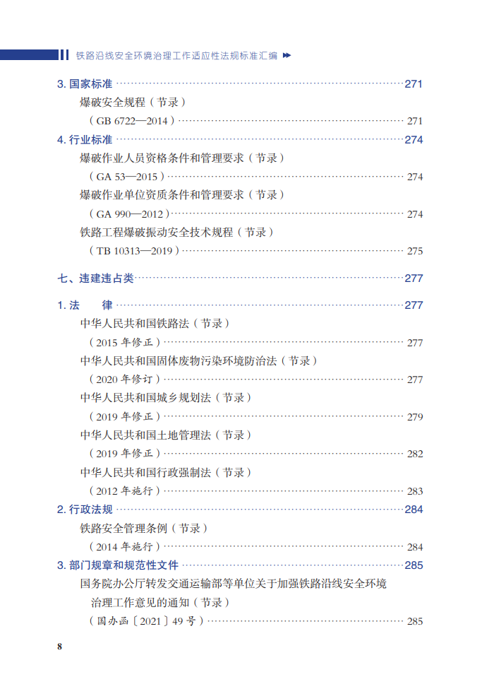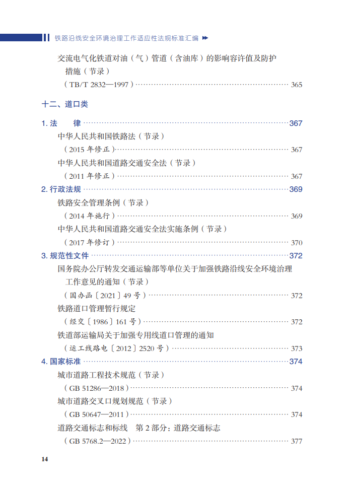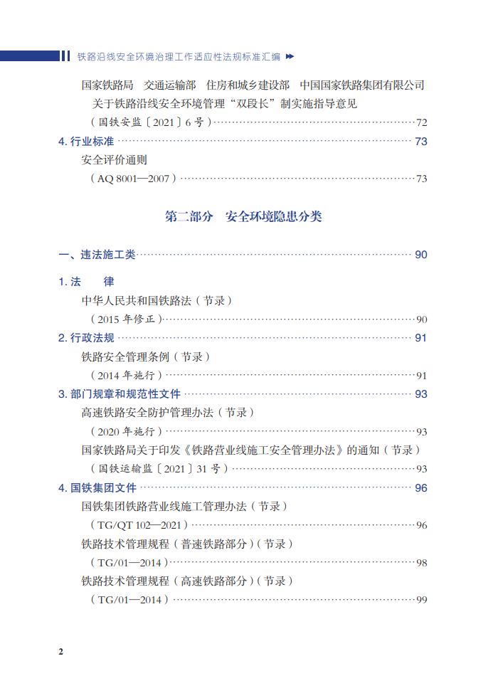 本书为关于铁路外部环境的法律、法规的汇编之作。全书分为通用和安全环境隐患分类两部分,其中第二部分列举安全环境的11种类型。每一部分包括法律、行政法规、部门规章、国家标准、行业标准等几个部分,全面列出相关法律法规并从中筛选出相关的内容进行节录。