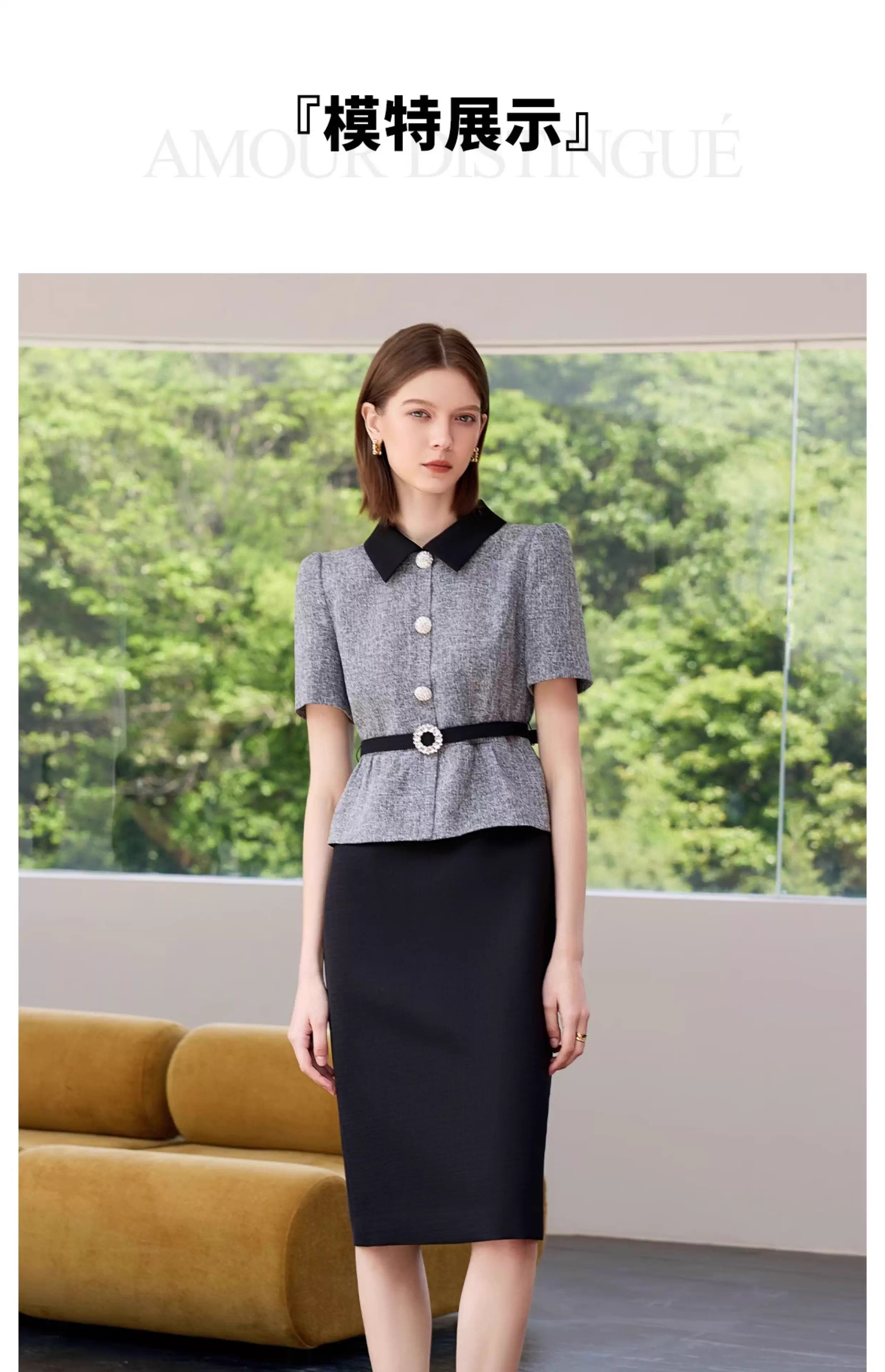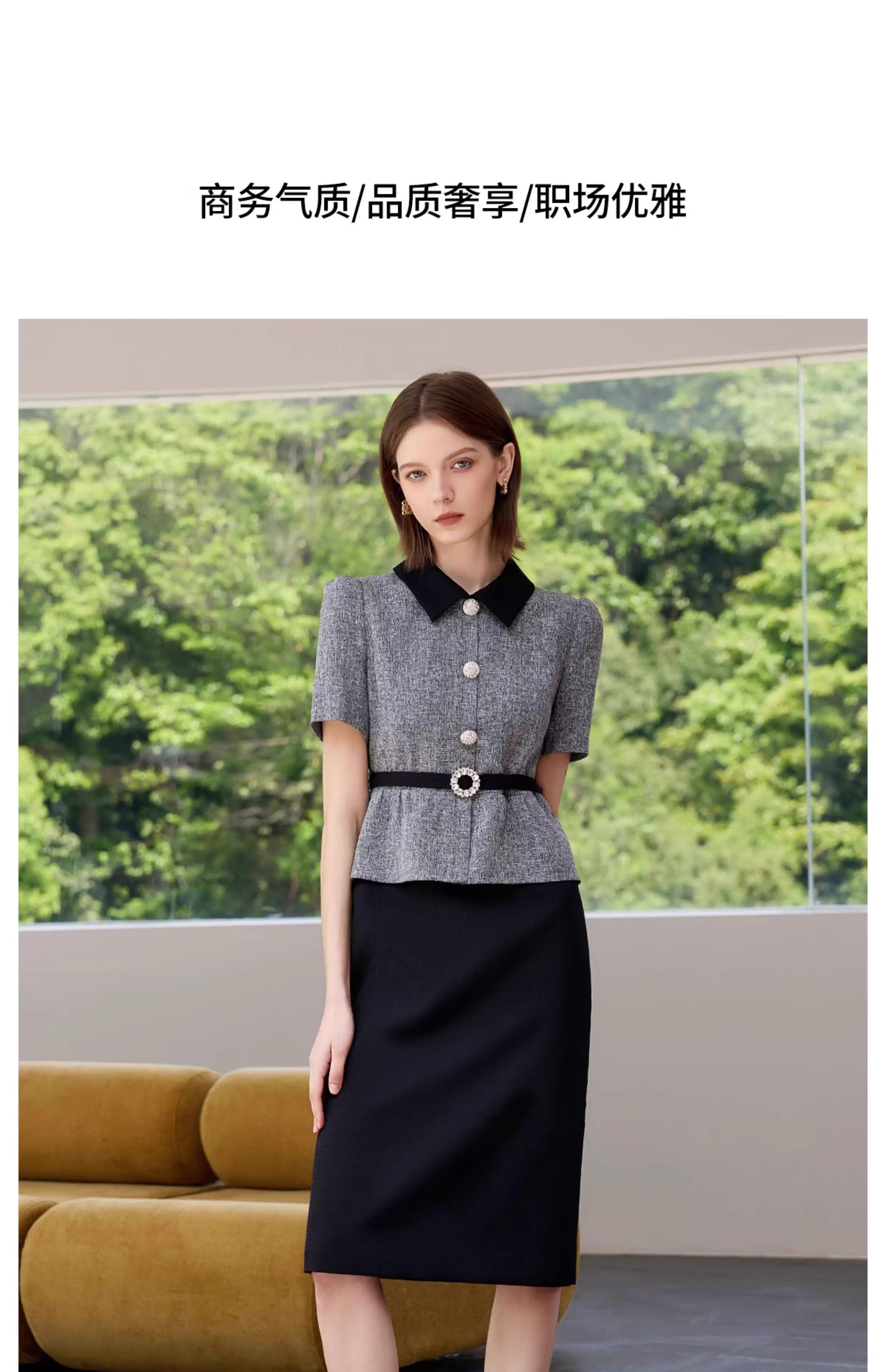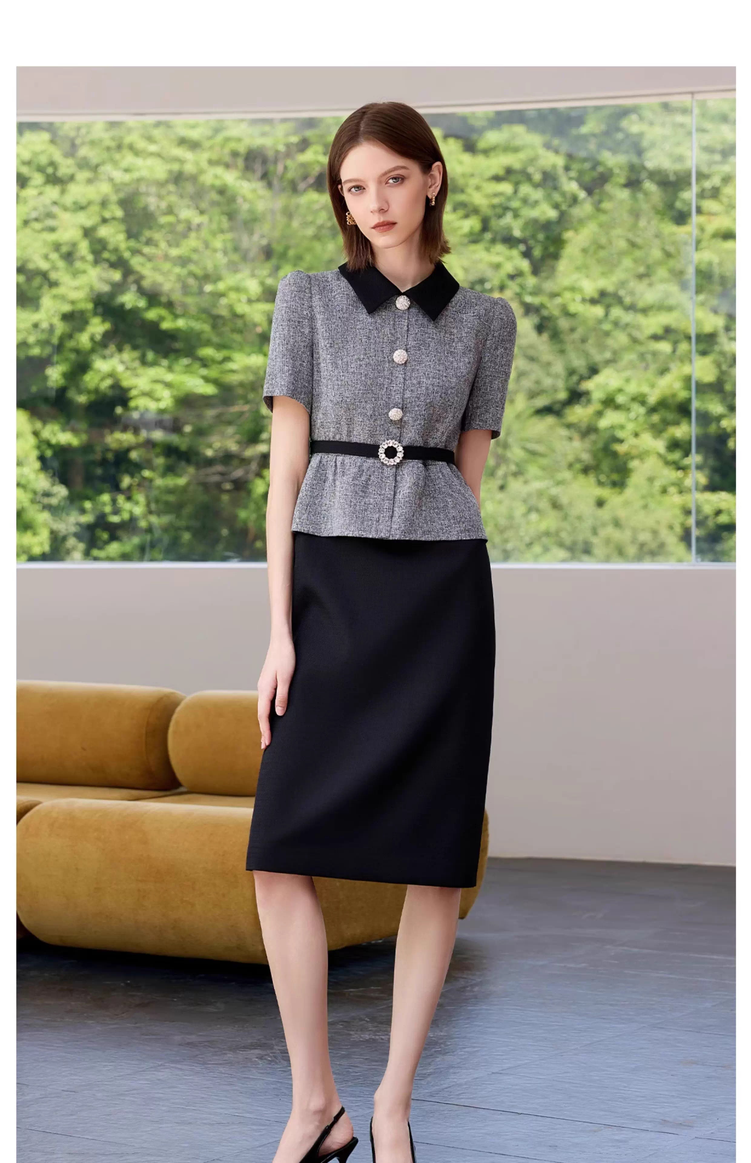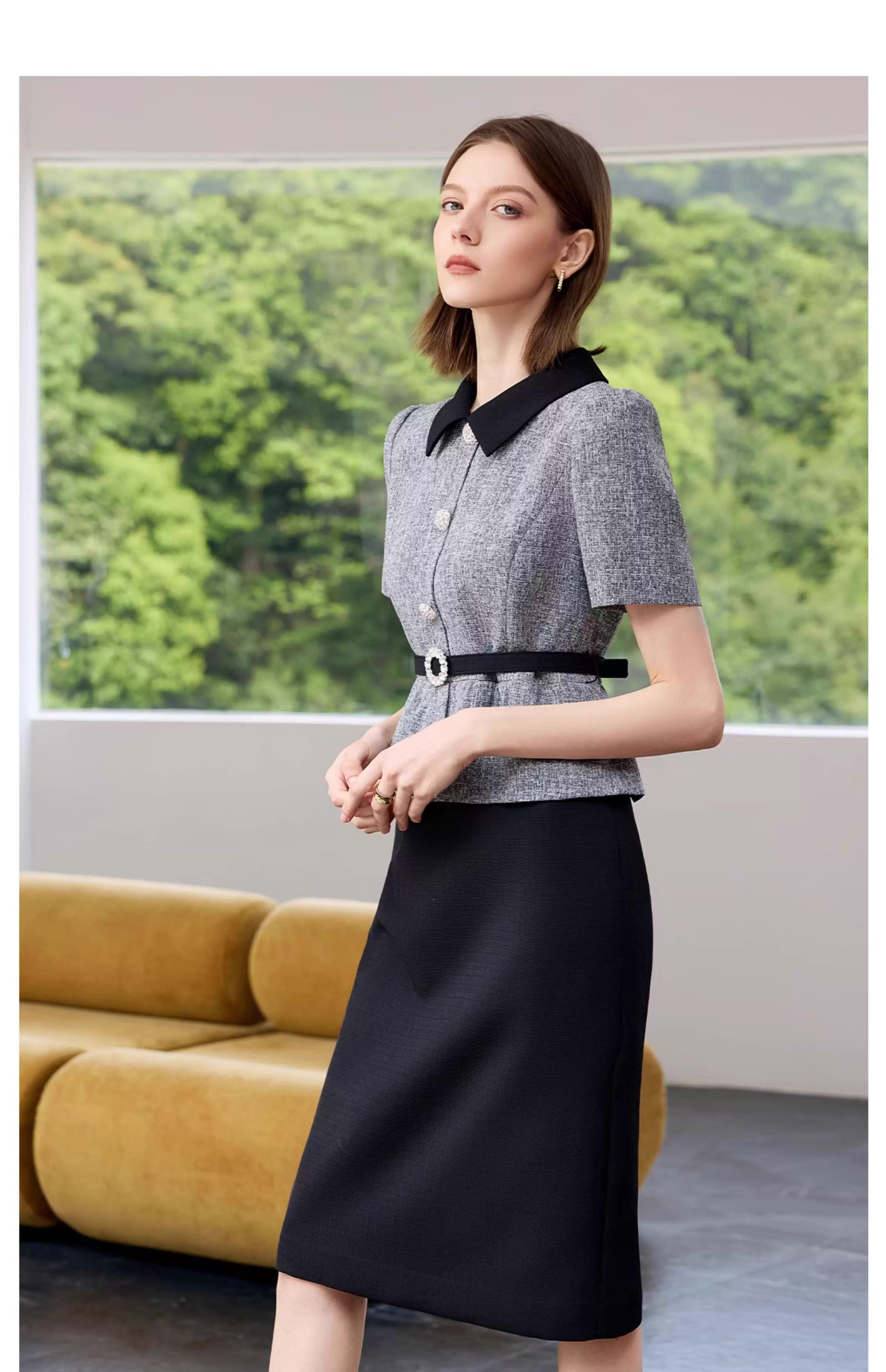 IWY/黑色包臀裙子女夏连衣裙灰色接拼职业装新款假两件西服裙 Q1399