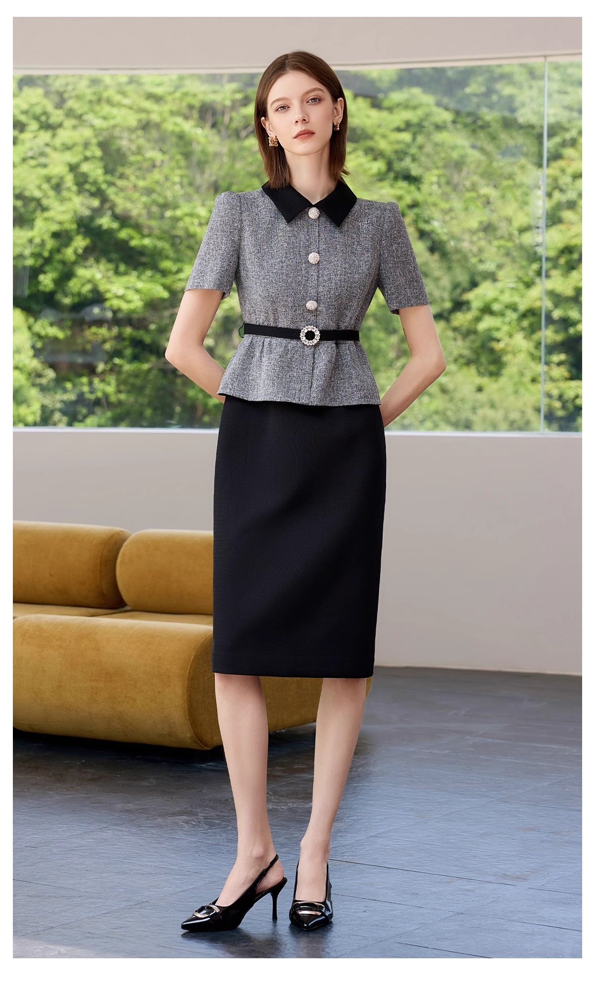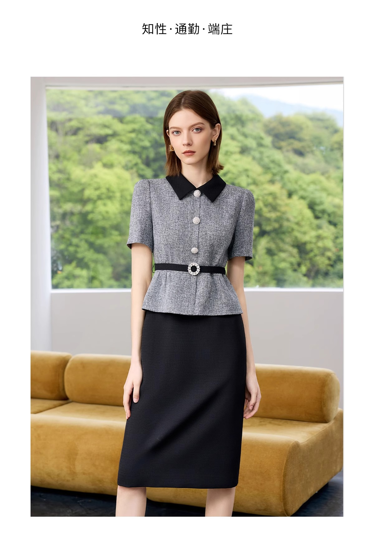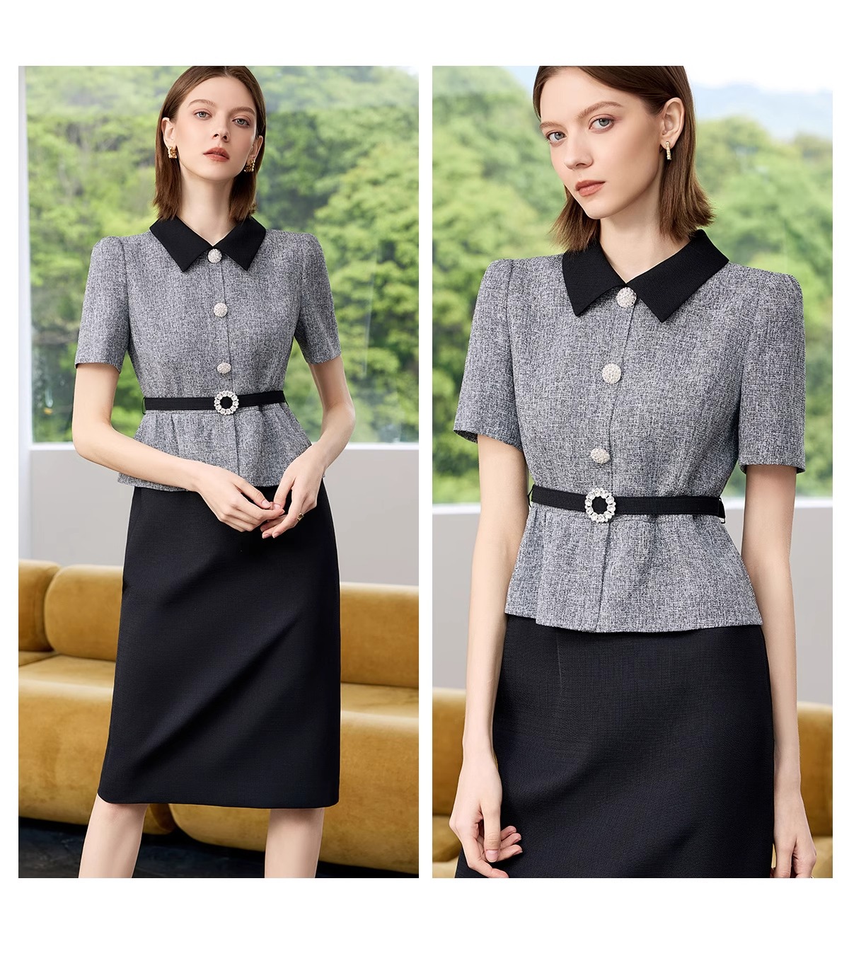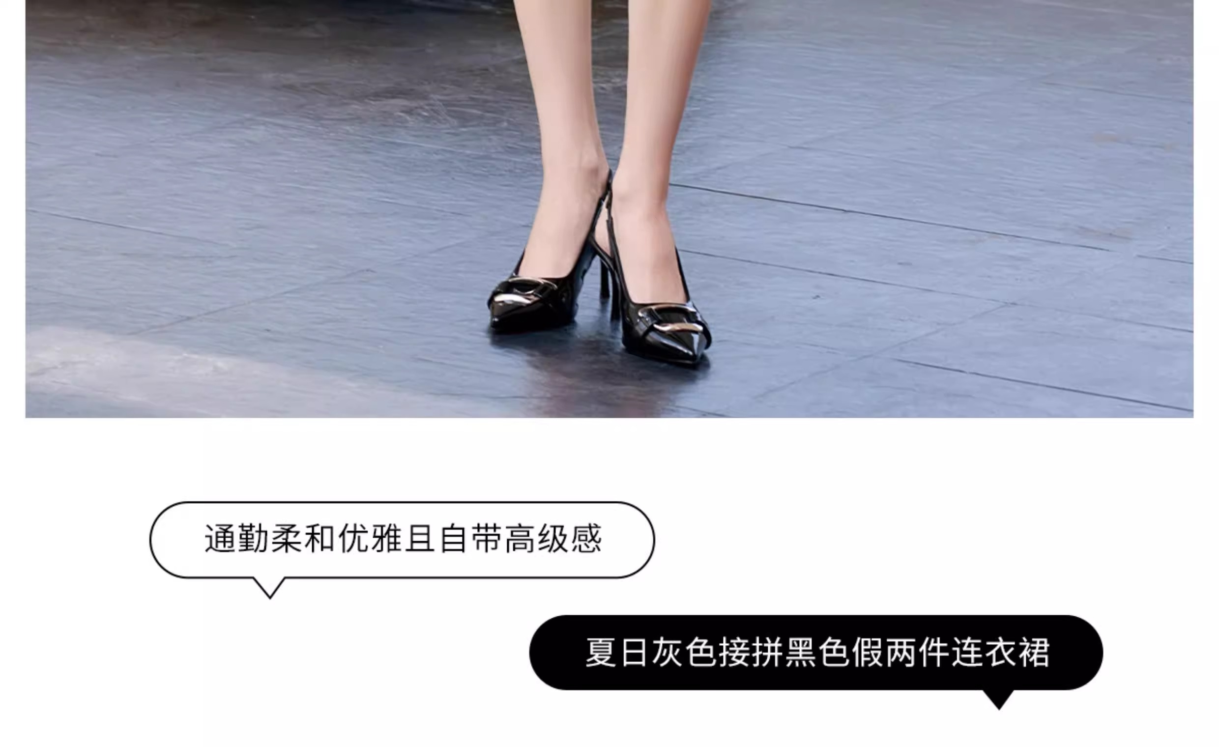 IWY/黑色包臀裙子女夏连衣裙灰色接拼职业装新款假两件西服裙 Q1399
