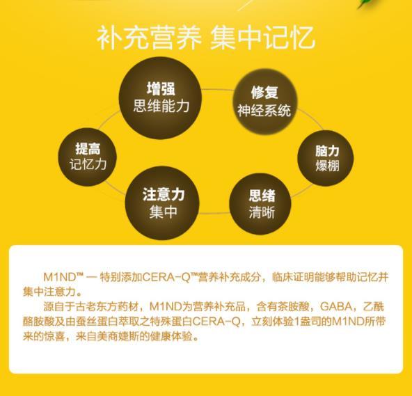 源自于古老东方药材,M1ND为营养补充品,含有茶胺酸、GABA、乙酰酪胺酸及由蚕丝蛋白萃取之特殊蛋白CERA-Q,立刻体验1盎司的M1ND所带来的惊喜,婕斯全球独家贩售。