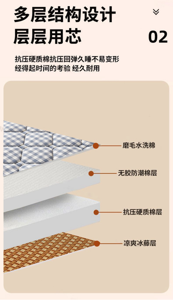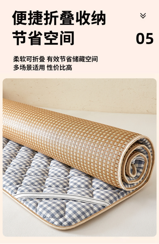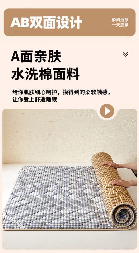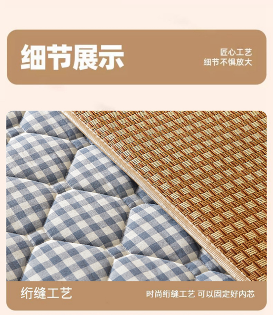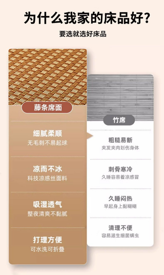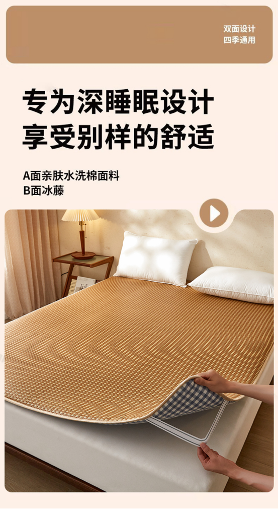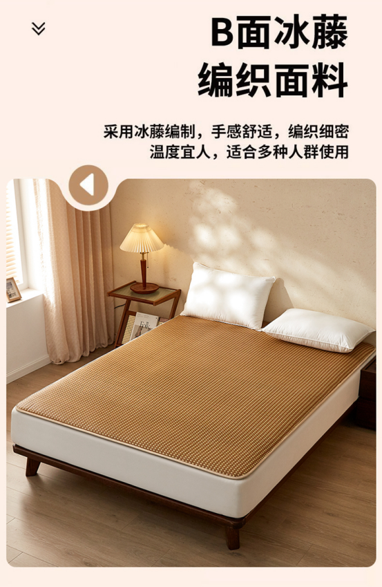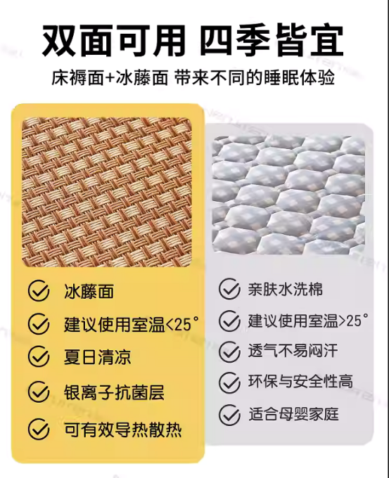 双面设计,正面是的冰藤席,反面是水洗软垫 两面都可以睡。 藤条编织,非常紧密,没有任何倒刺,冰而不凉,适合全家老小使用!! 一年四季都可以使用 ✅藤席性温,温而不燥,特别适合老人、小孩纸使用。即使开空调也不会太冰。怕冷体寒者推荐藤席。