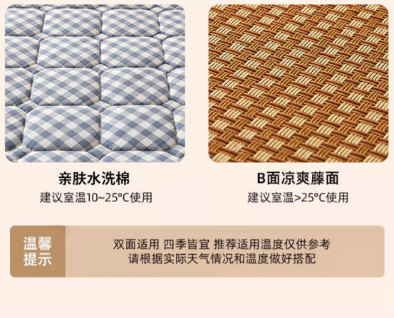 席面温而不燥,特别适合老人、小孩纸使用即使开空调也不会太冰。怕冷体寒者推荐! 一年四季都可以使用 夏天用冰藤面 其他的季节可以使用床褥面 超级实惠方面!