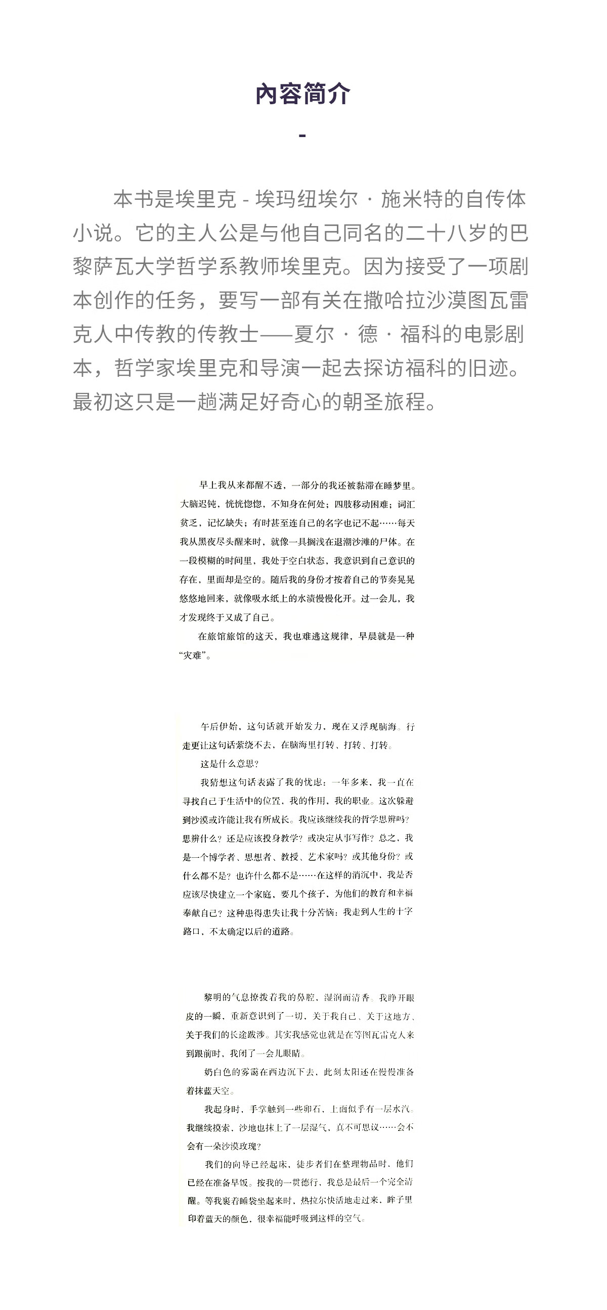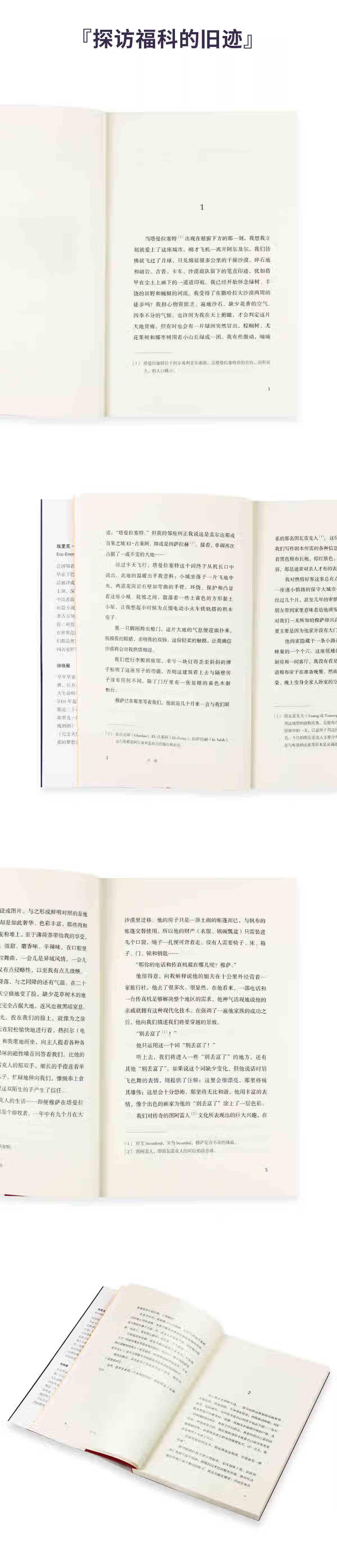 从霍加尔回来后,自童年时代就沉睡于我体内的作家幼虫,在书桌前蠢蠢欲动,成为它所经历故事的 誊写人。我出生了两次:一次是1960年在里昂,一次是1989年在撒哈拉。