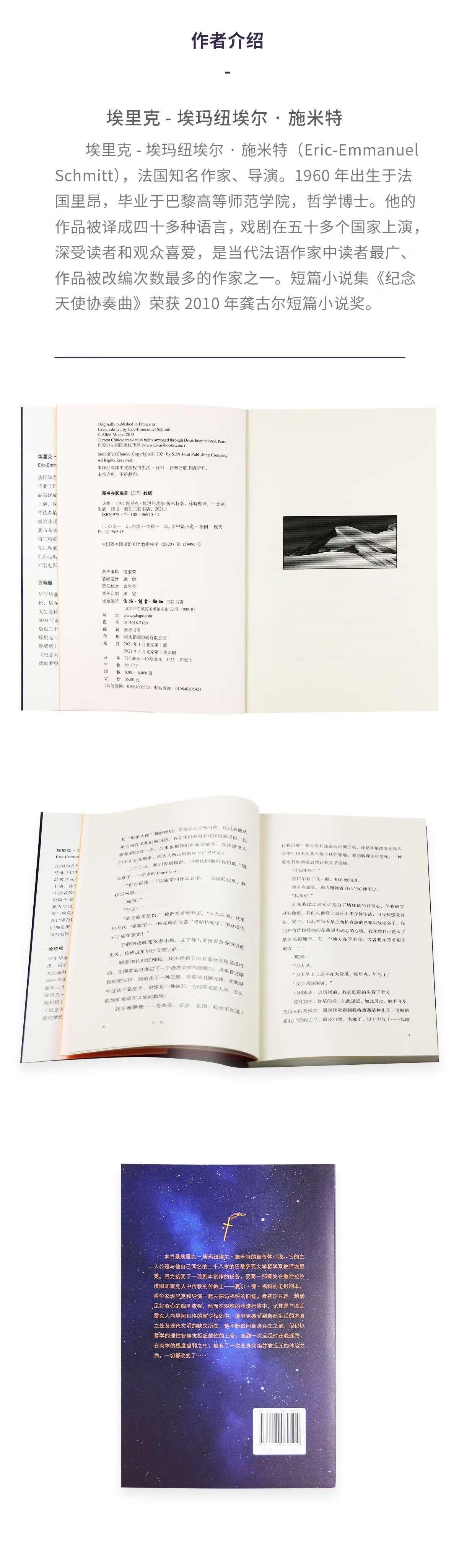 埃里克-埃玛纽埃尔?施米特(Eric-Emmanuel Schmitt),法国知名作家、导演。1960年出生于法国里昂,毕业于巴黎高等师范学院,哲学博士。他的作品被译成四十多种语言,戏剧在五十多个国家上演,深受读者和观众喜爱,是当代法语作家中读者最广、作品被改编次数最多的作家之一。短篇小说集《纪念天使协奏曲》荣获2010年龚古尔短篇小说奖;《来访者》在1994年获得三项莫里哀戏剧大奖;《看不见的周期》使他在世界范围内获得声誉。他也执导了据小说《我们都是奥黛特》《奥斯卡与玫瑰夫人》改编的同名电影等多部影片。