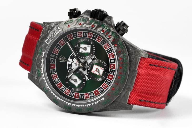 这款充满着赌场色彩的Lucky Player Carbon腕表,以劳力士迪通拿为基础,巧妙利用了圆形表盘还原了博彩轮盘中36格的设计风格,迪通拿Daytona标志性的三个小秒盘则变成了赌桌上的下注区,非常的有创意。在外圈的右上角,三个投注骰子的设计灵感,也一定能给你带来好运气。