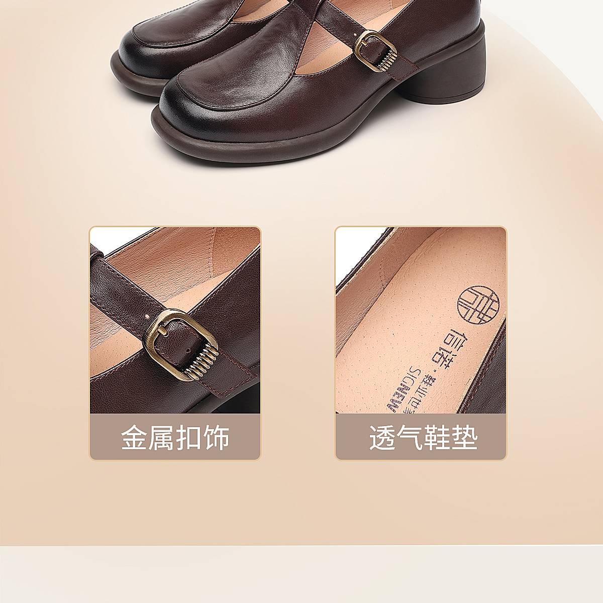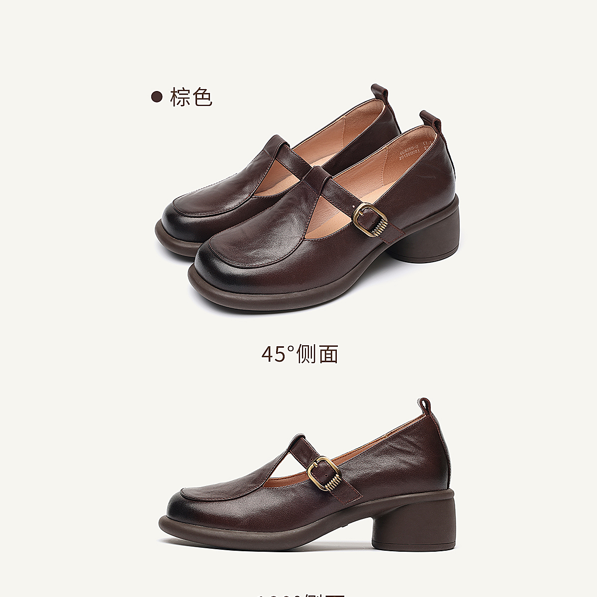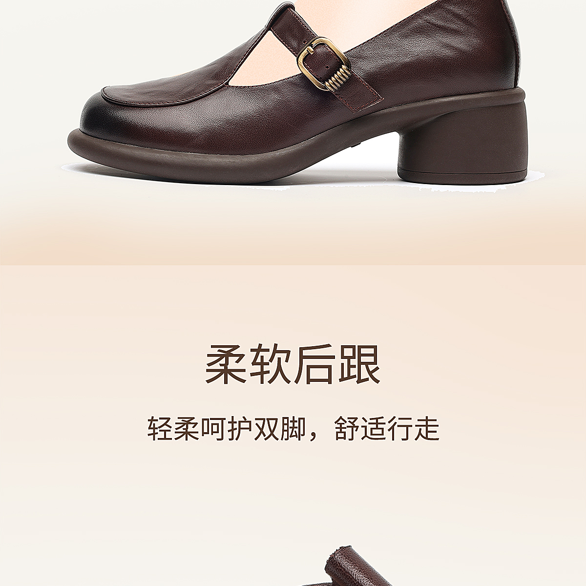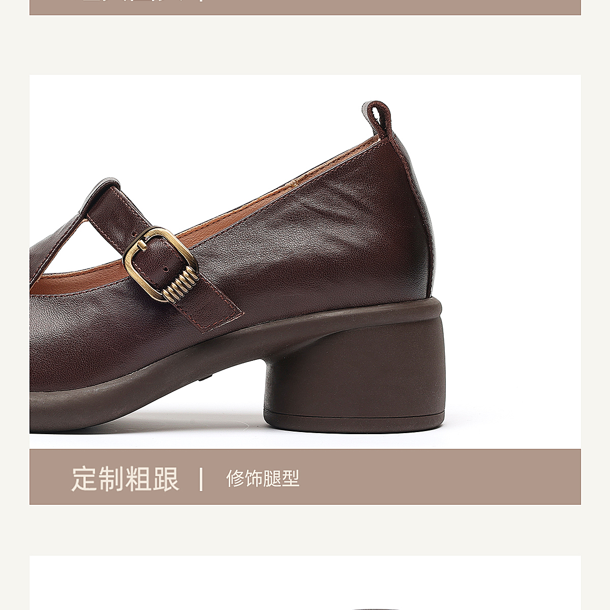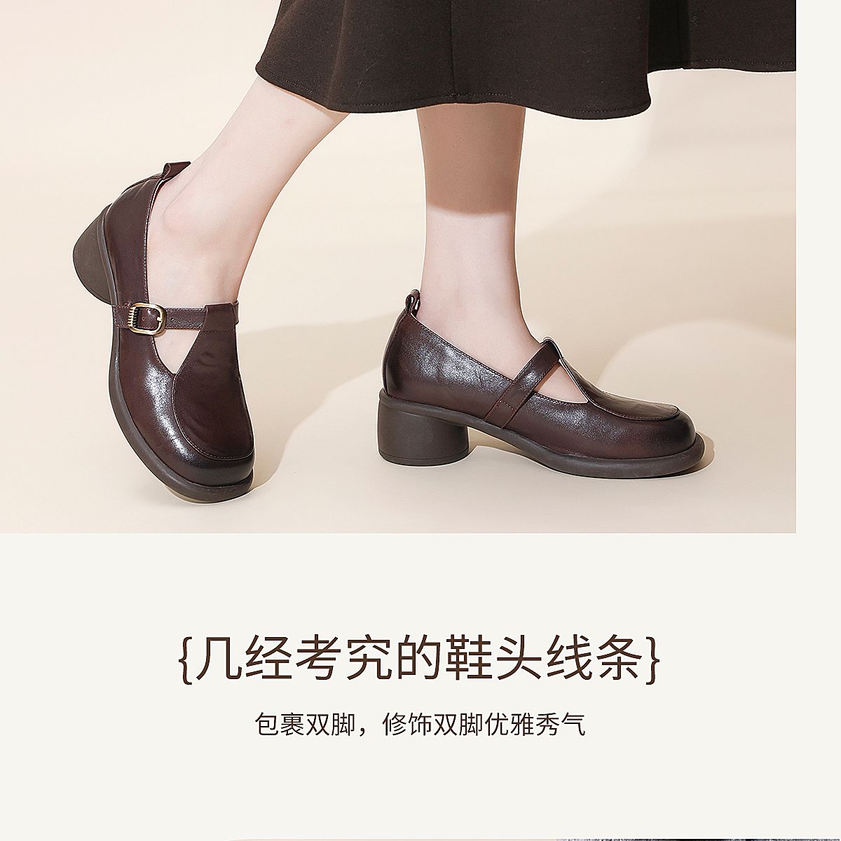 真皮玛丽珍鞋女粗跟一字扣带复古舒适单鞋软底皮鞋6C5255-2