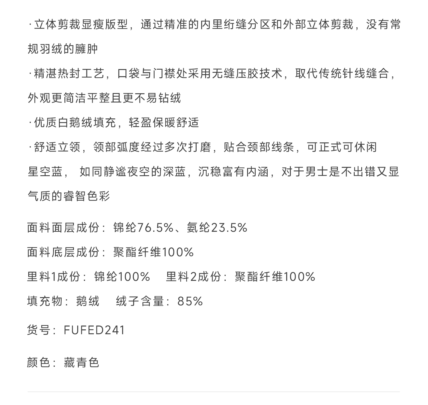 callisto星空蓝立领鹅绒羽绒服