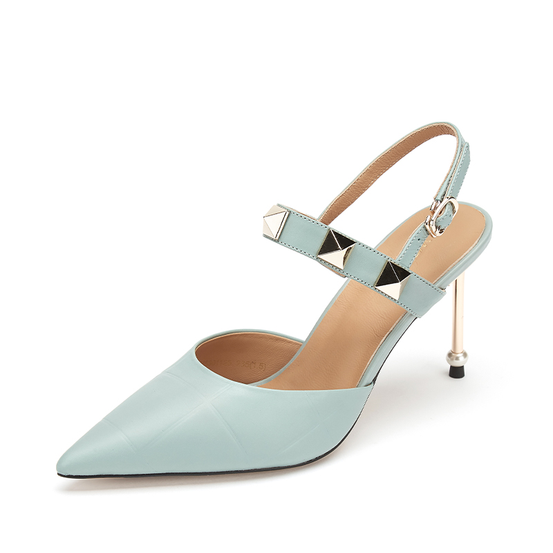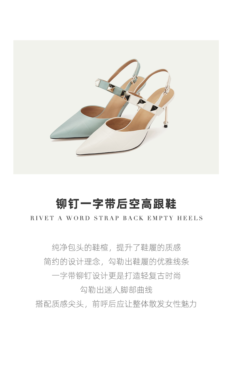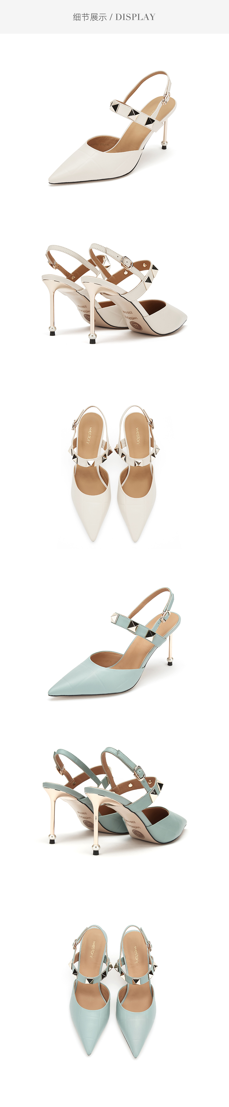 westory23年春新款时尚尖头方形水钻扣高跟鞋细跟女气质名媛55381