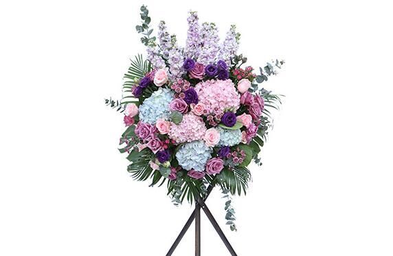 开业花篮B款----紫色紫罗兰9枝,粉色绣球2枝,蓝色绣球3枝,粉佳人玫瑰12枝,紫玫瑰15枝,紫色桔梗6枝, 木质三角架(1361)