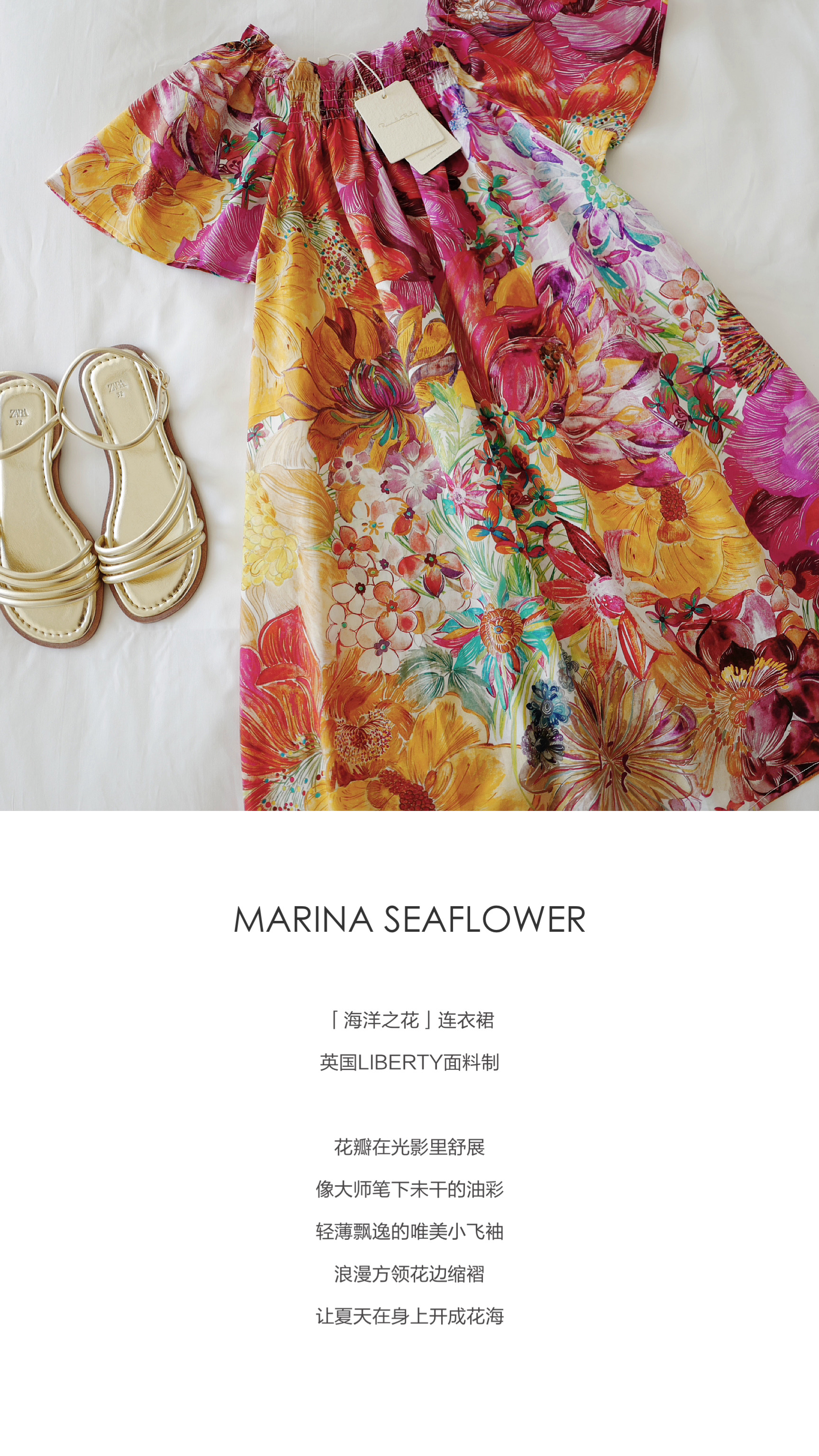现货 / MARINA SEAFLOWER | 海洋之花 花边缩褶小方领飞袖度假裙 英国liberty面料制