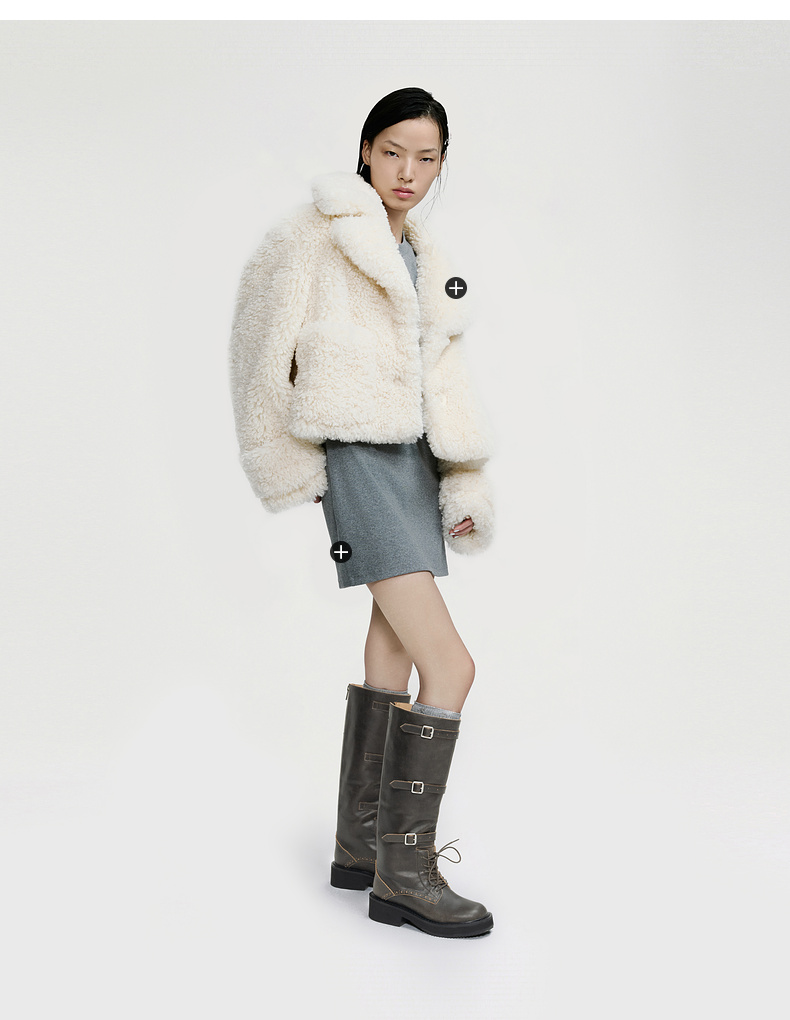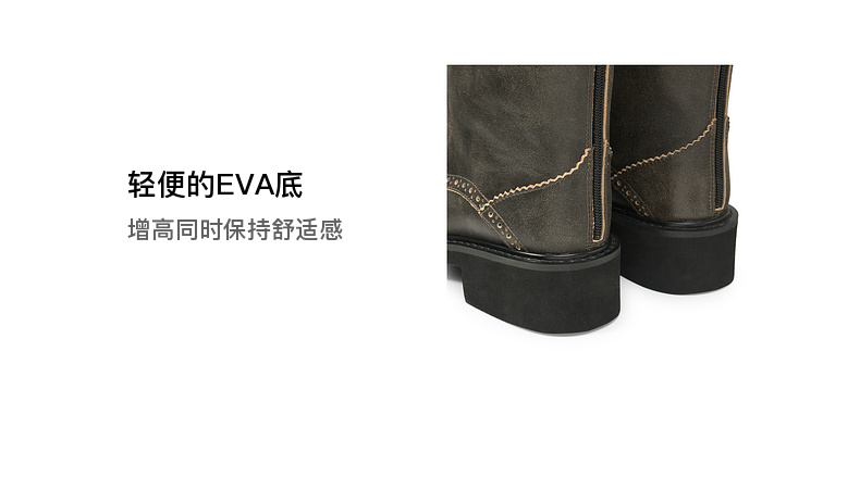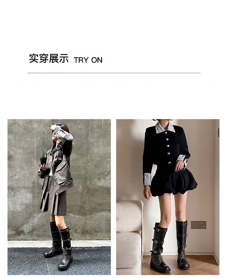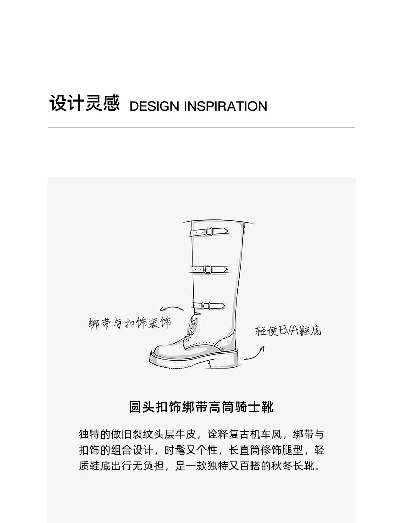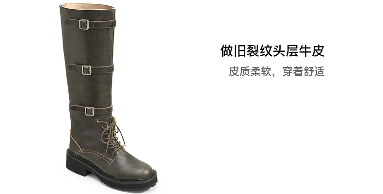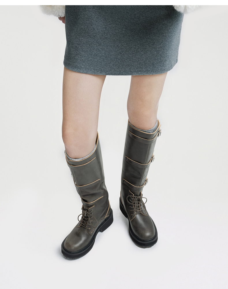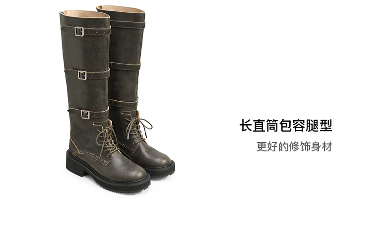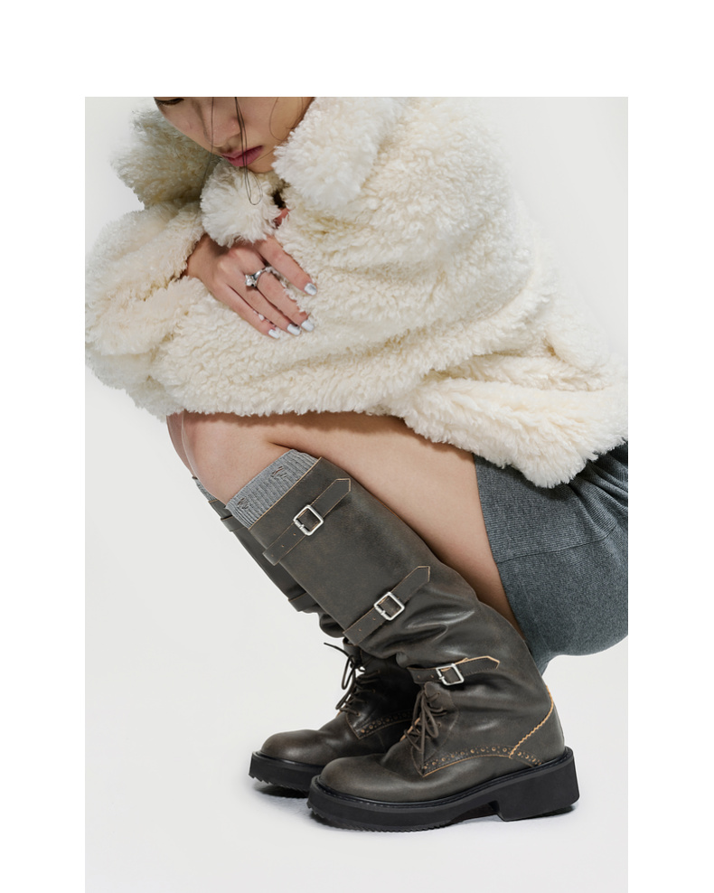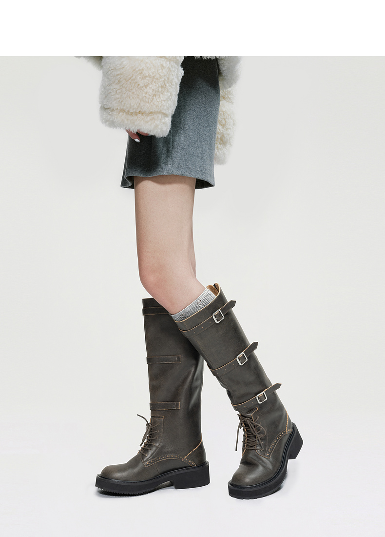 lost in echo2024秋冬新款美拉德圆头宽筒绑带棕色长筒靴骑士靴女
