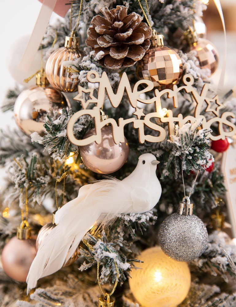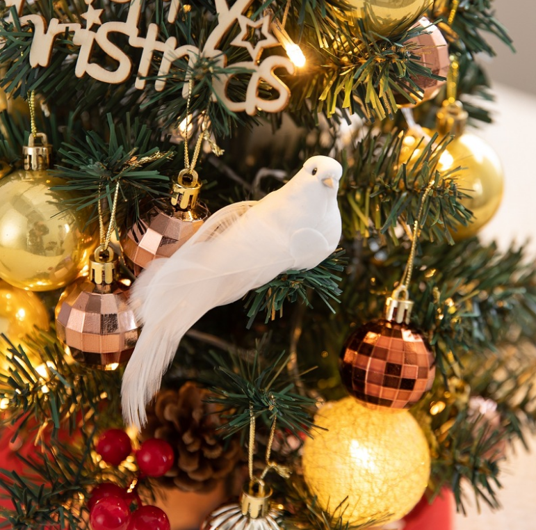 首先将圣诞树和底座安装好,然后挂上灯串、圣诞球、白鸽等装饰品就大功告成了,