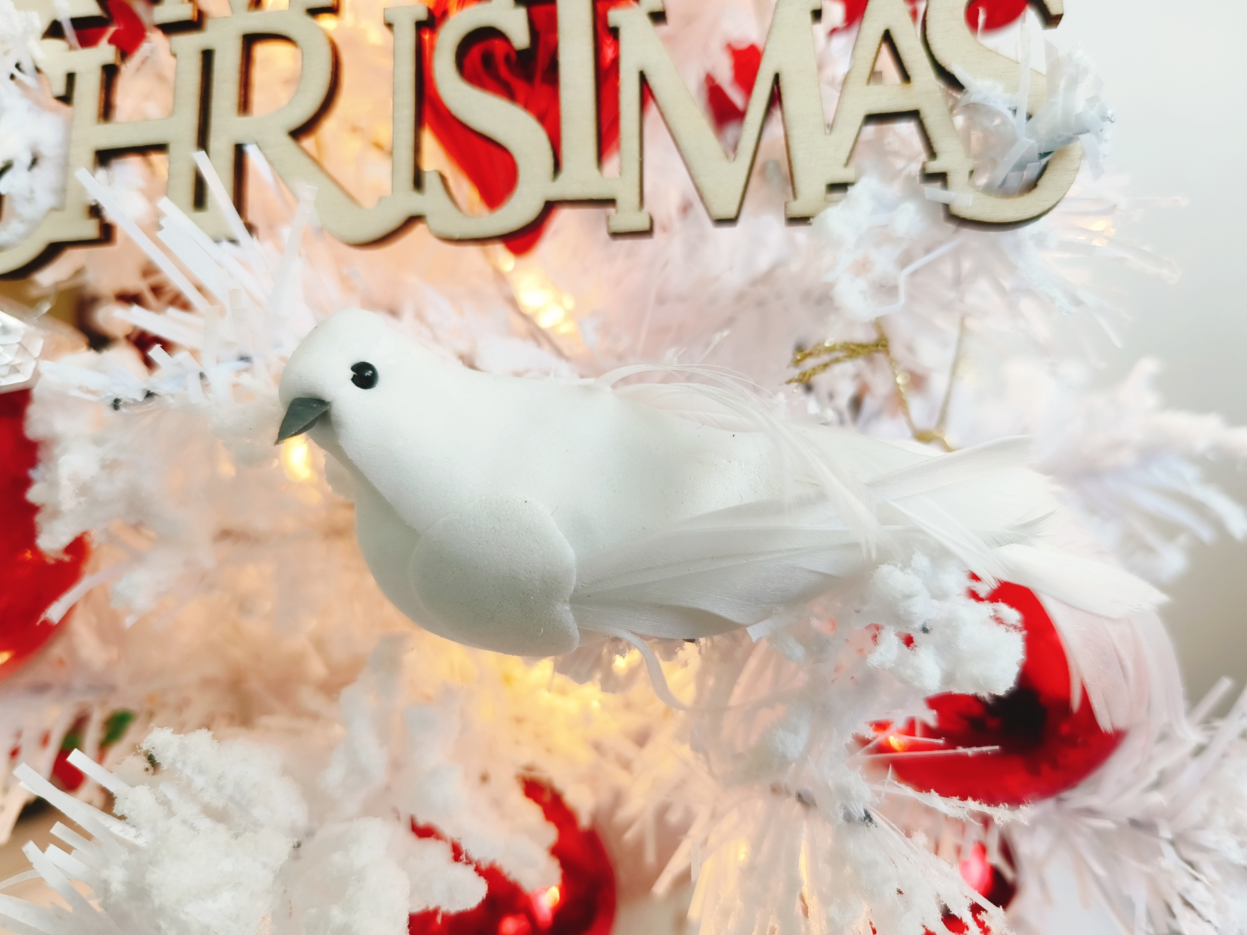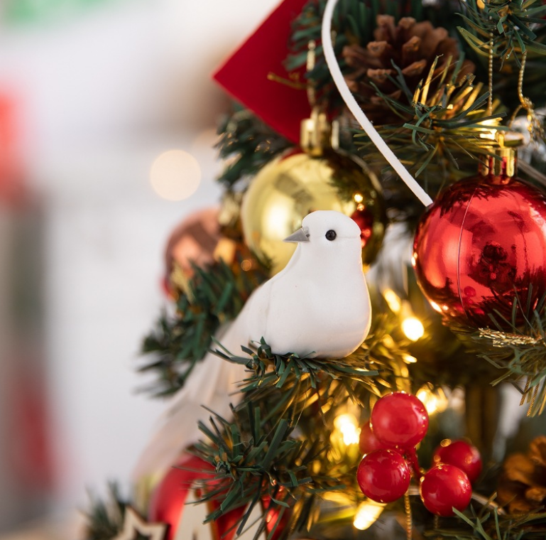 树上停着白鸽,它周围还装饰着buling buling的圣诞小球、铃铛、五角星,