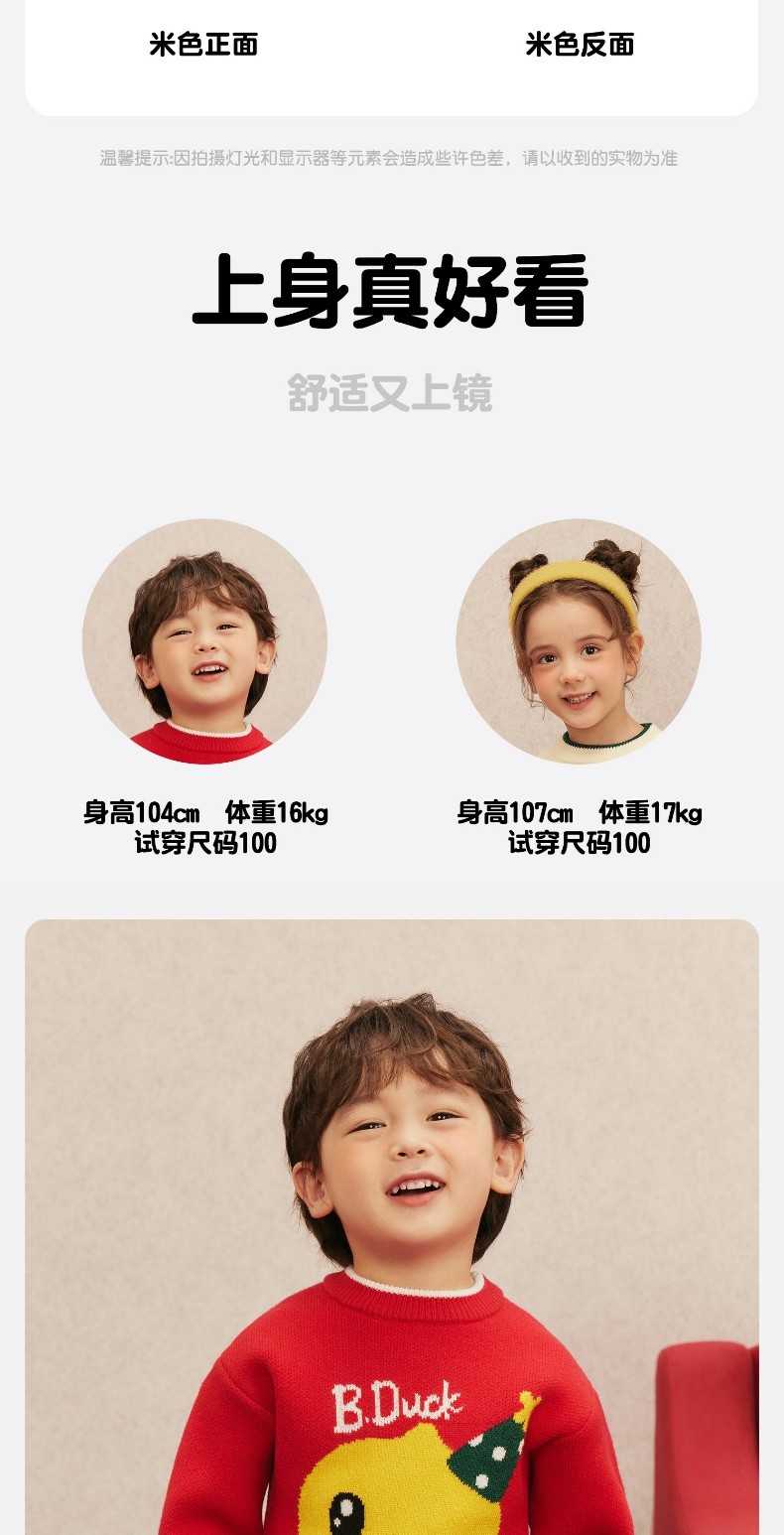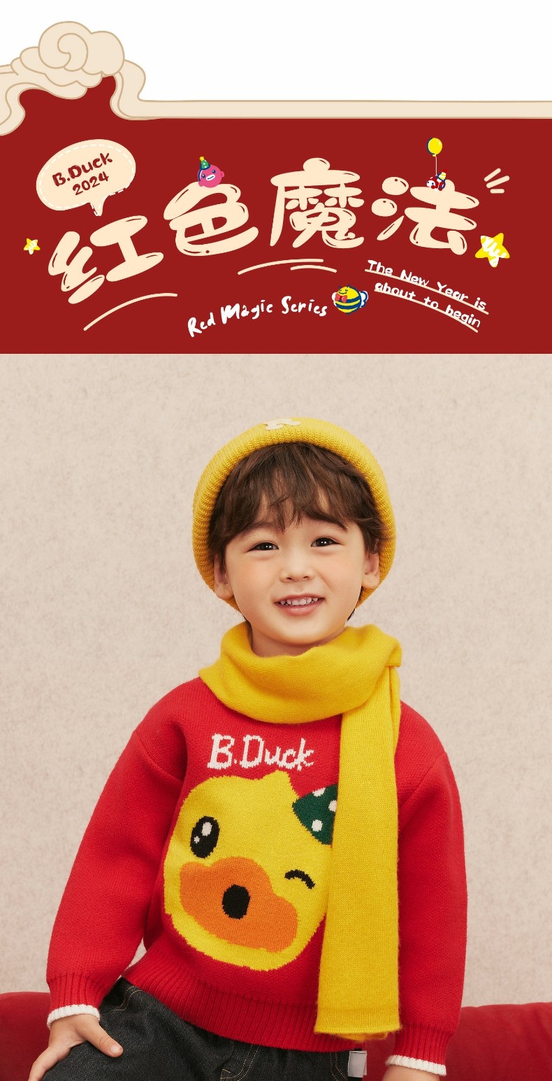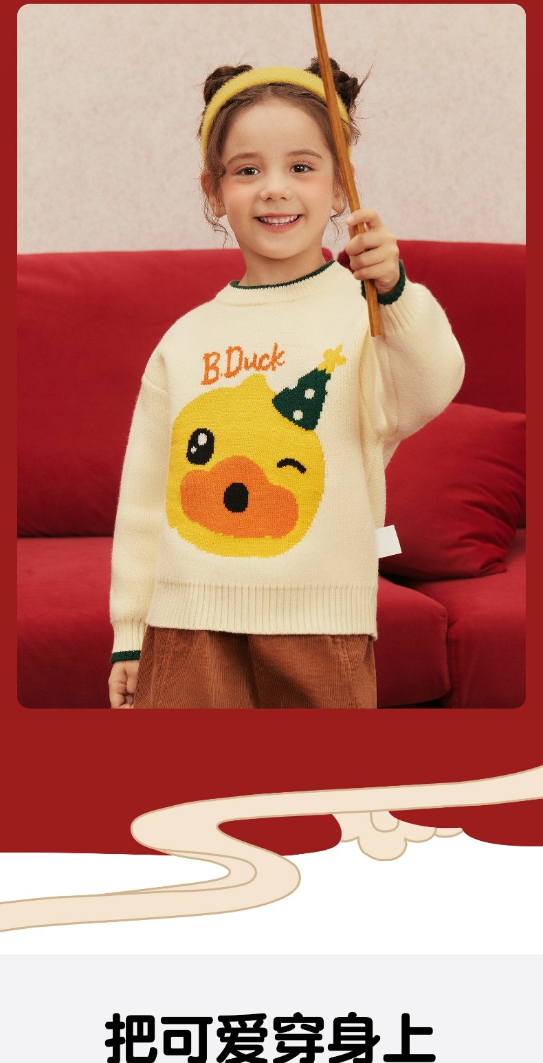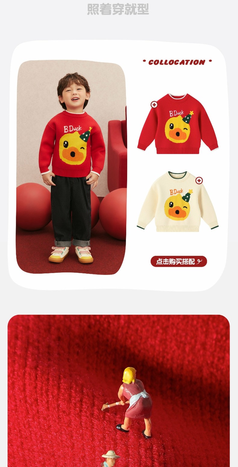 bduck小黄鸭童装男女童红色毛衣过年针织衫新年冬装儿童宝宝拜年服90-140 BF5512065