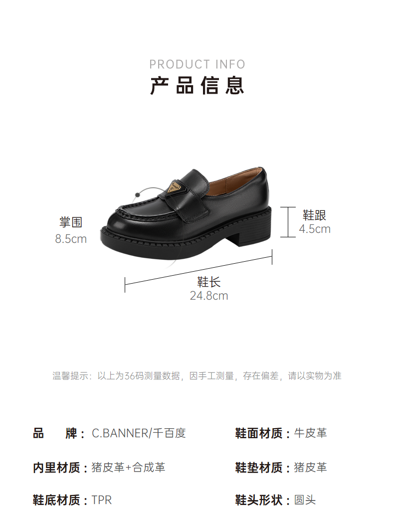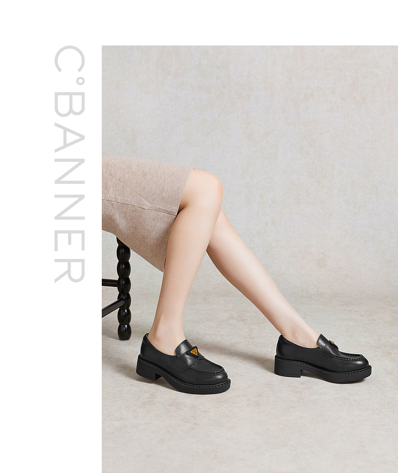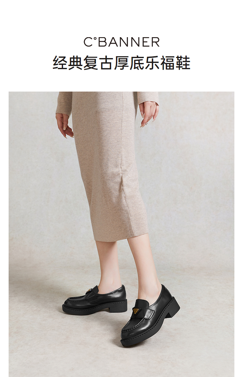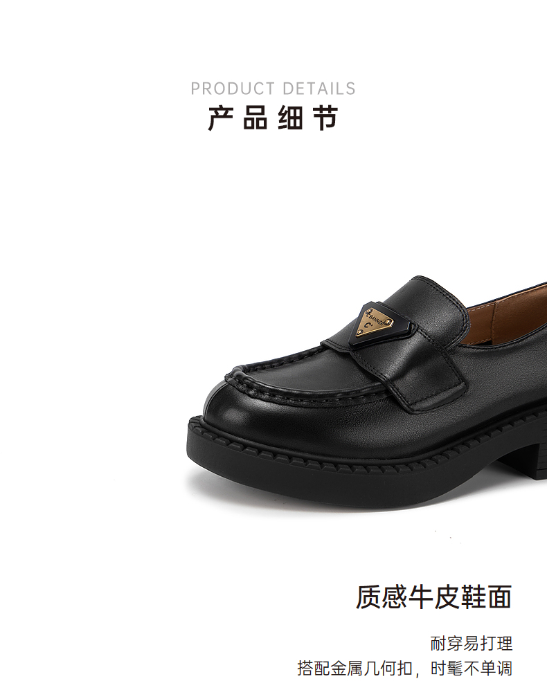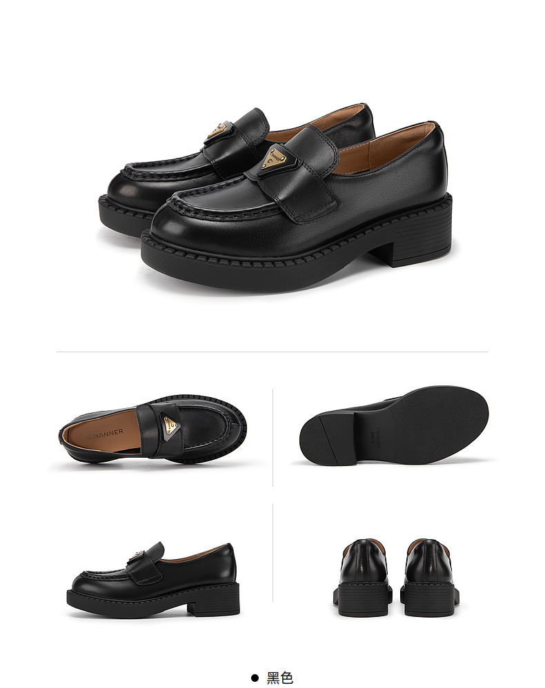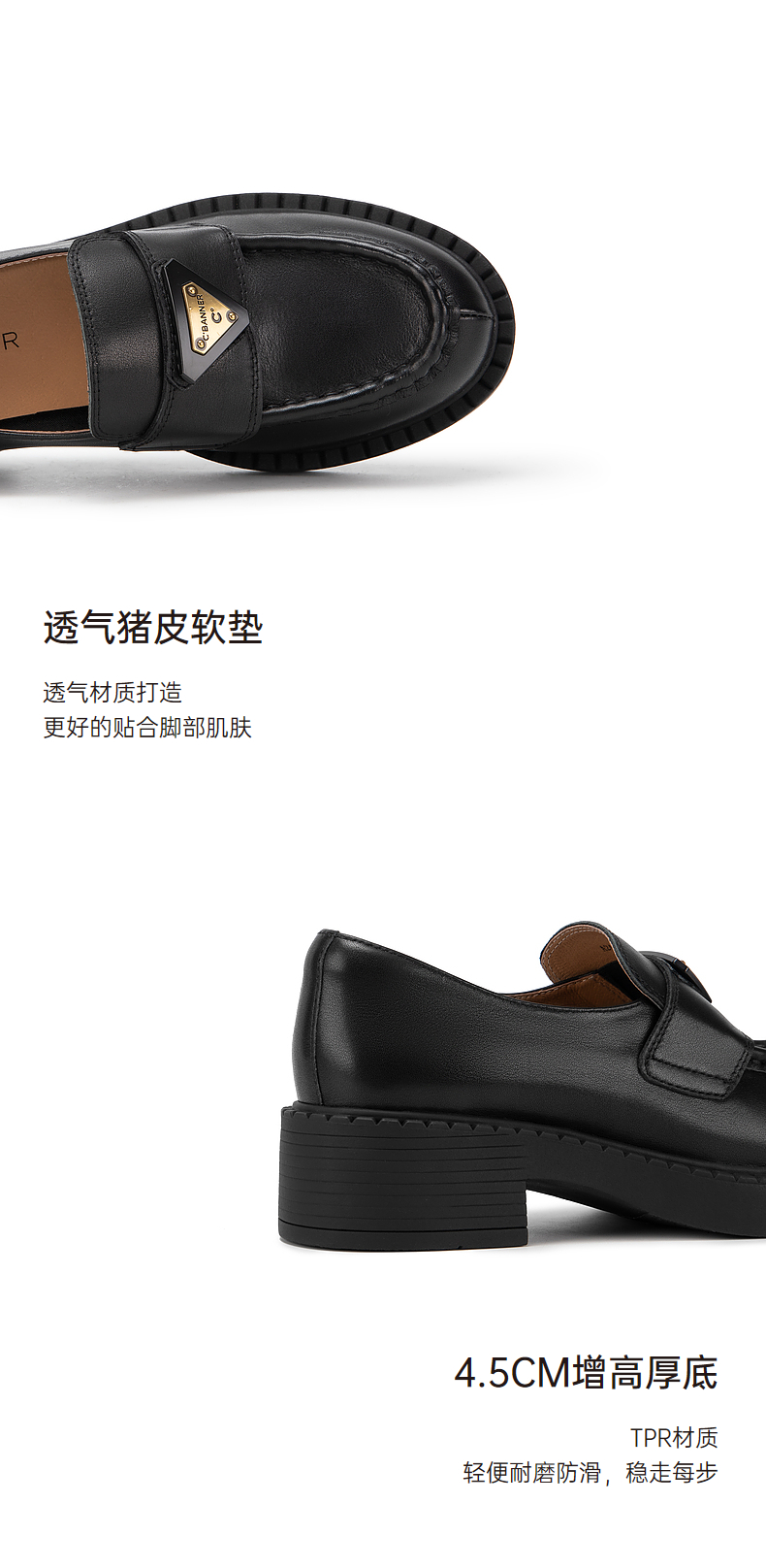 千百度厚底乐福鞋女春季增高黑色小皮鞋真皮豆豆鞋深口A24138605