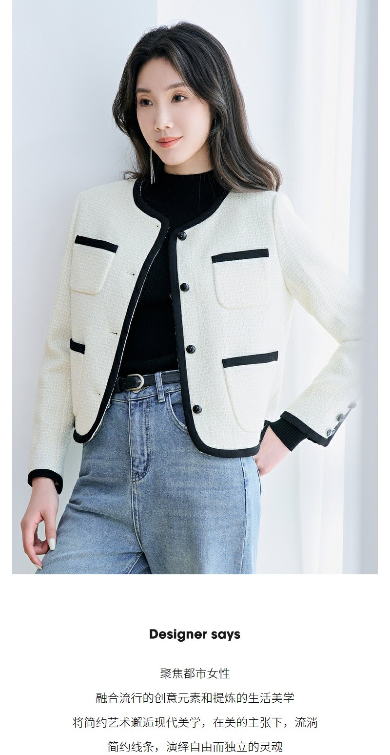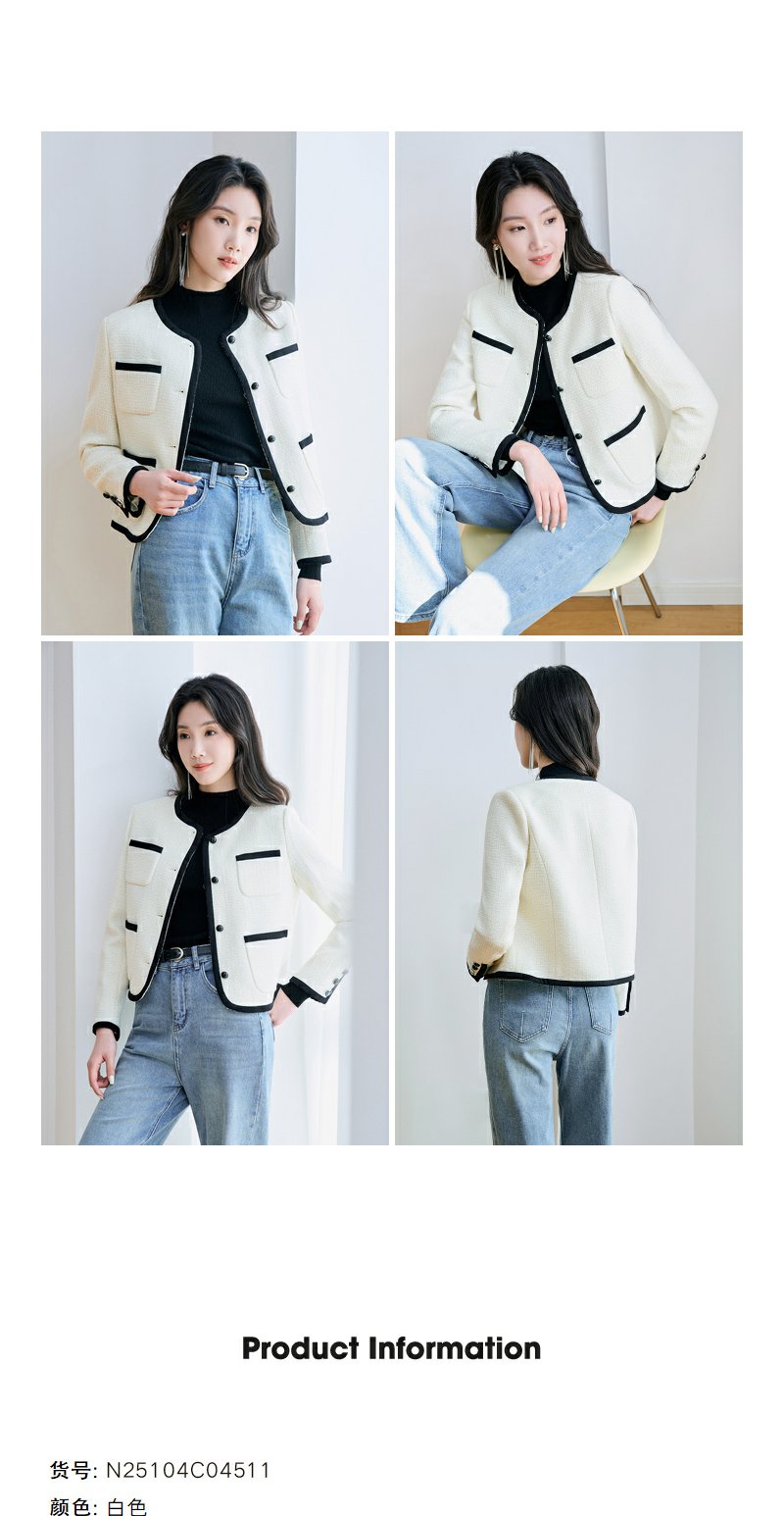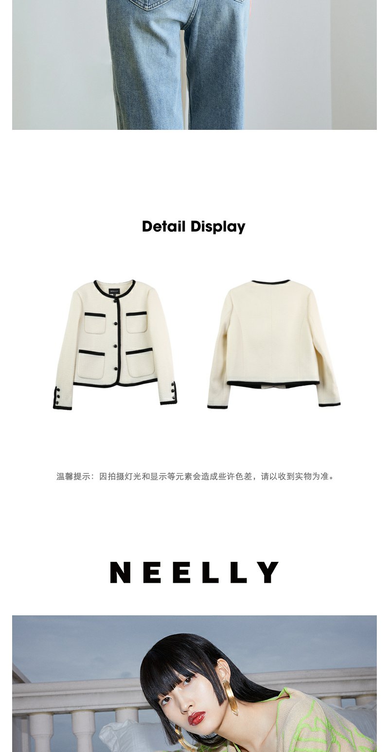 NEELLY纳俪商场同款冬新款小香风羊毛粗花呢外套女撞色显瘦短上衣N25104C04511