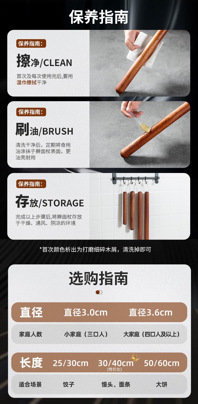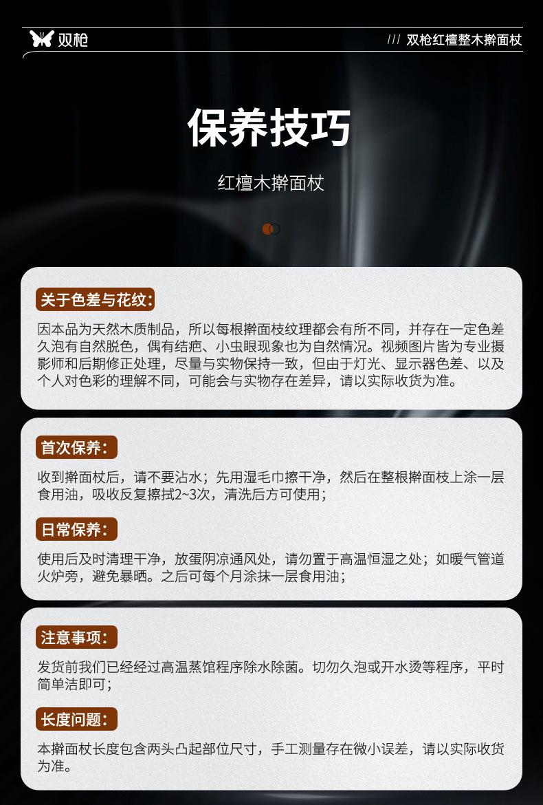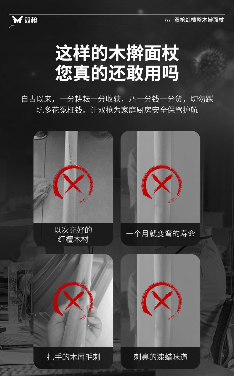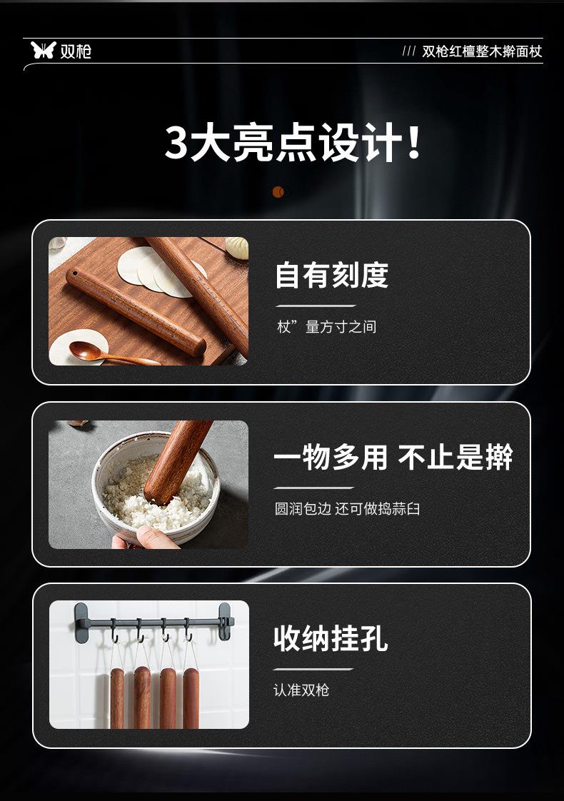 双枪红檀木擀面杖家用实木杆面棒面赶杖擀面棍饺子皮神器不粘大号