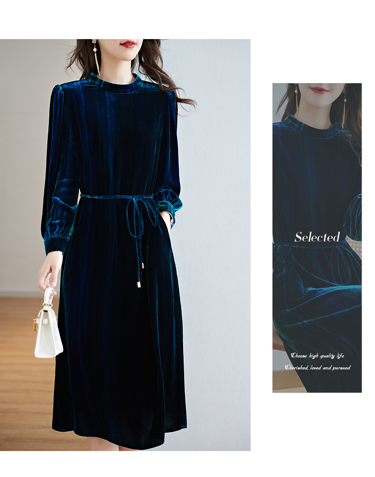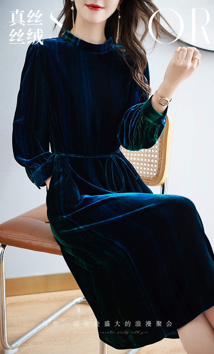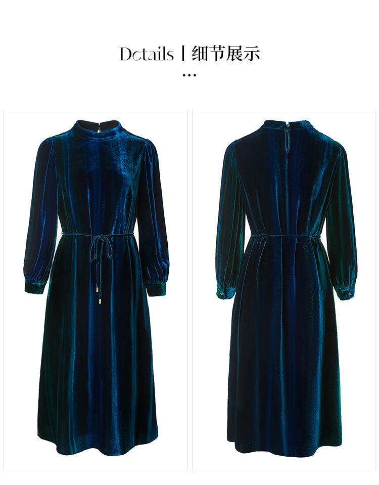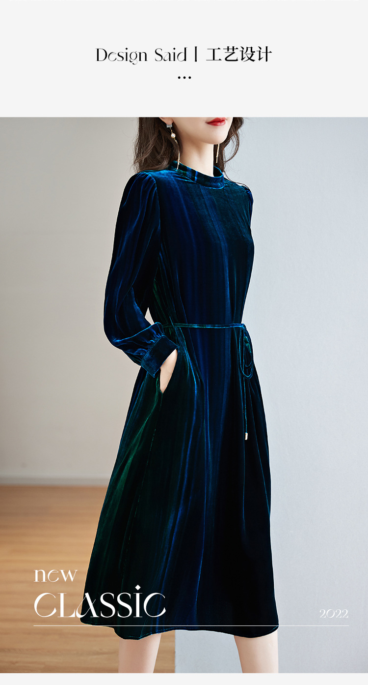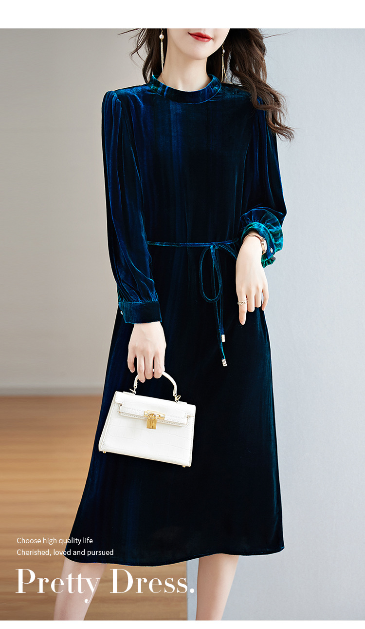 真丝丝绒连衣裙腰间系带孔雀蓝复古立领中长款蚕丝裙ZS-9123