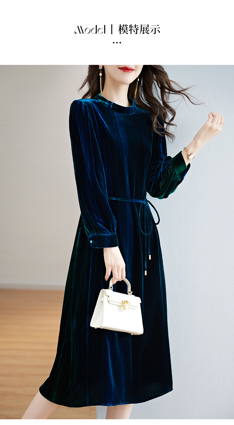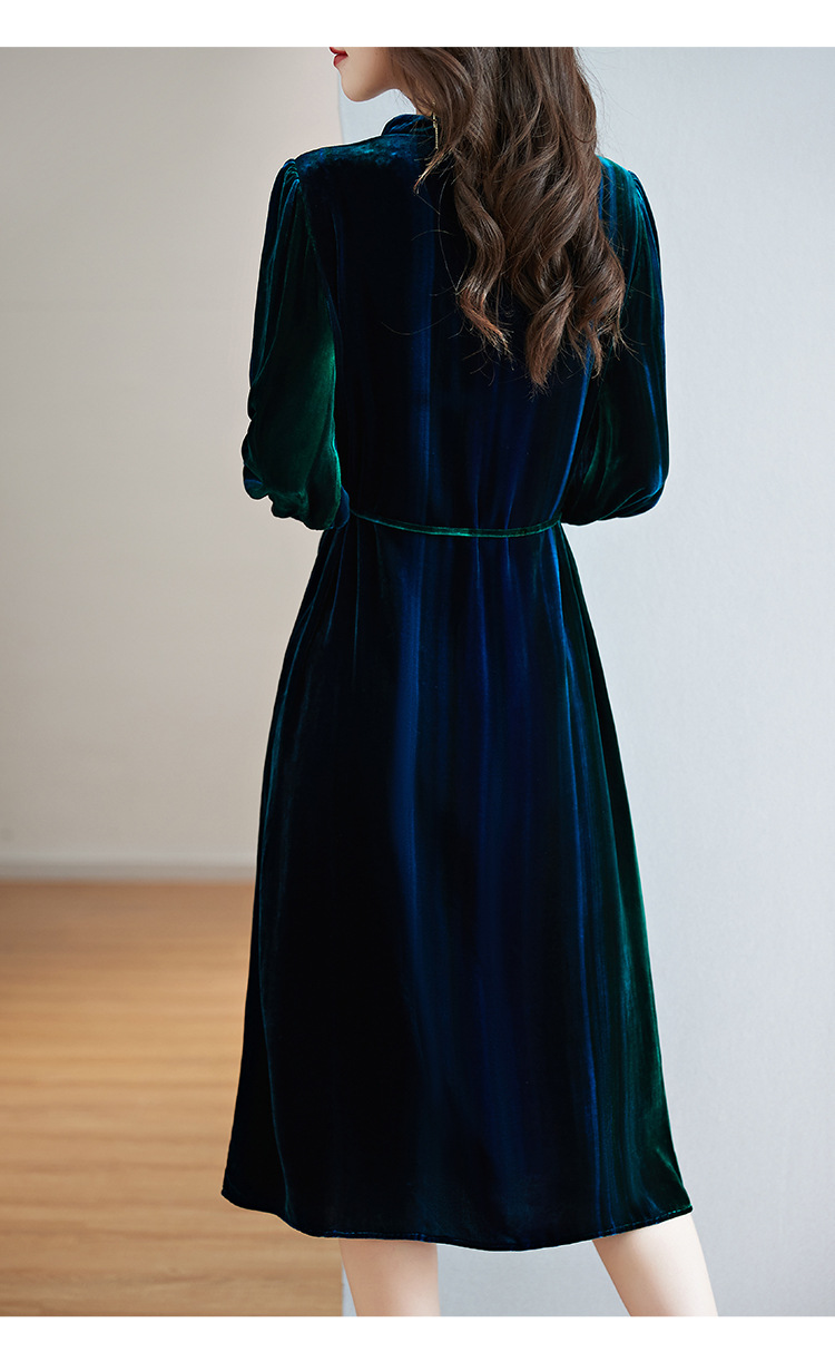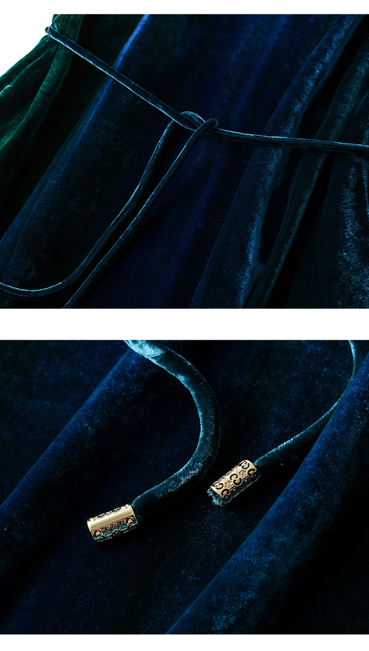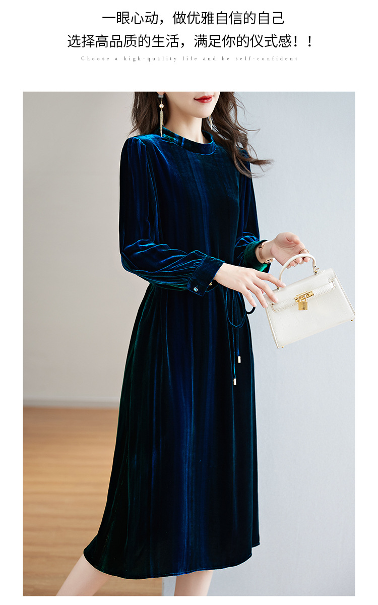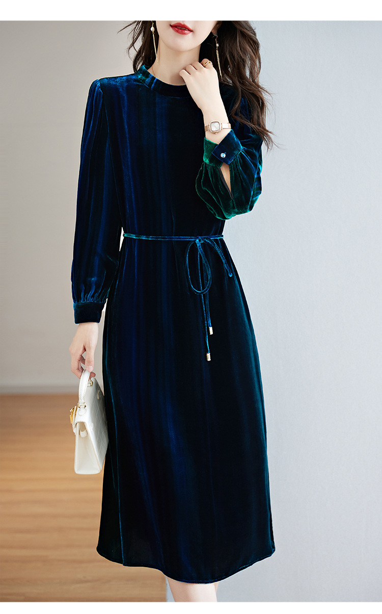 真丝丝绒连衣裙腰间系带孔雀蓝复古立领中长款蚕丝裙ZS-9123