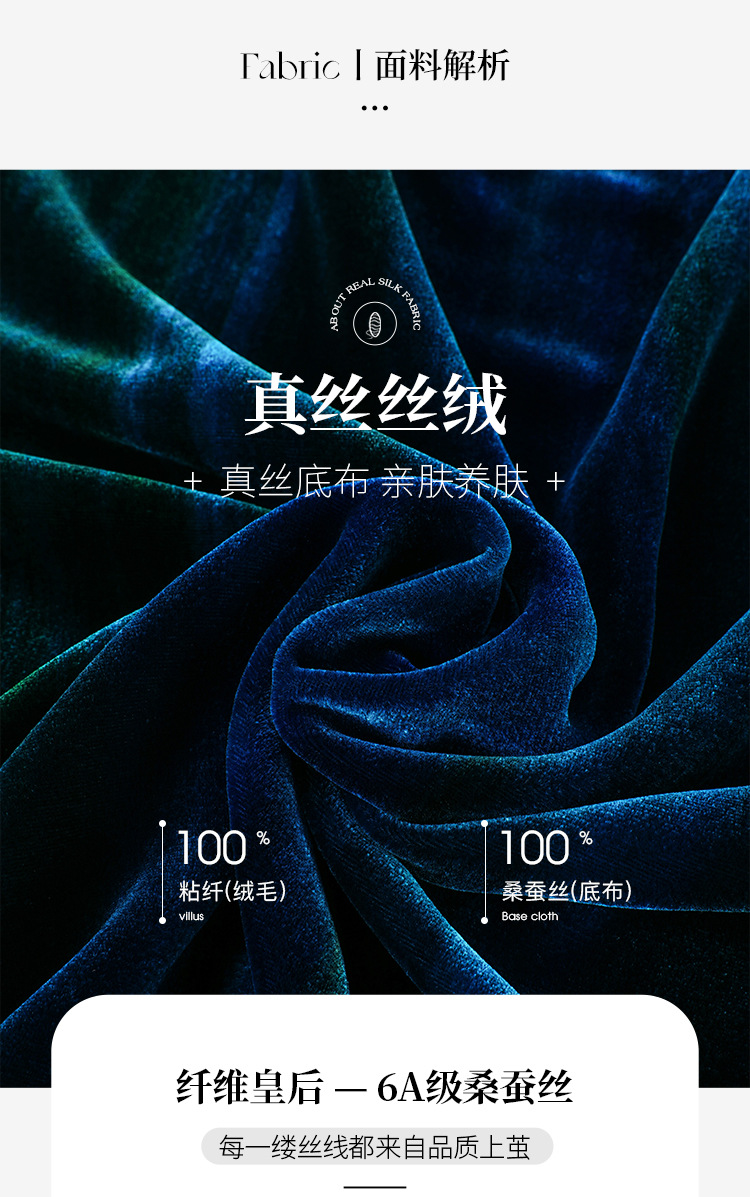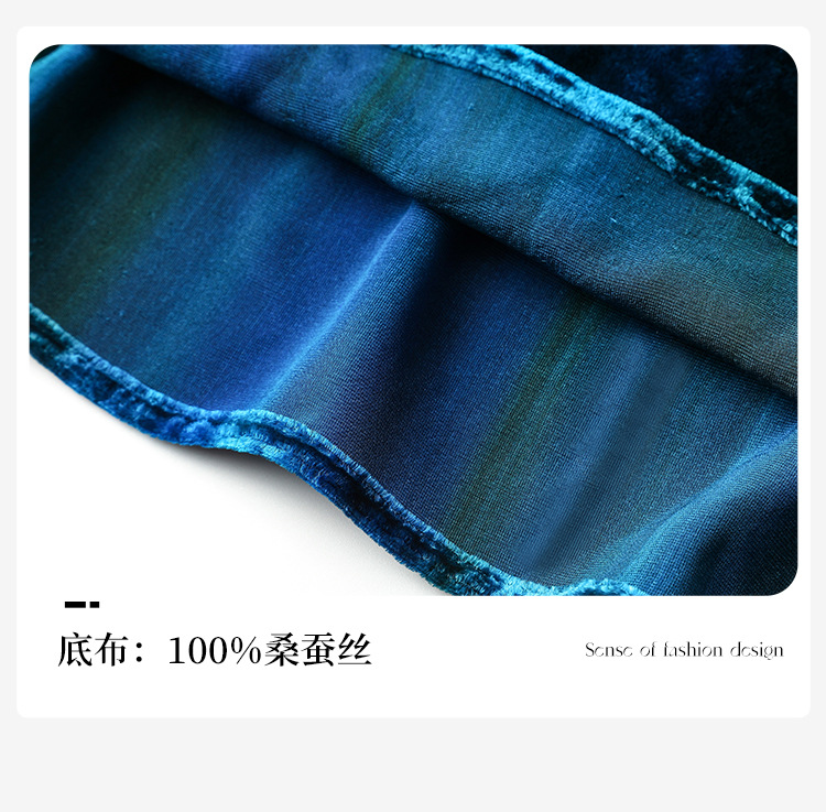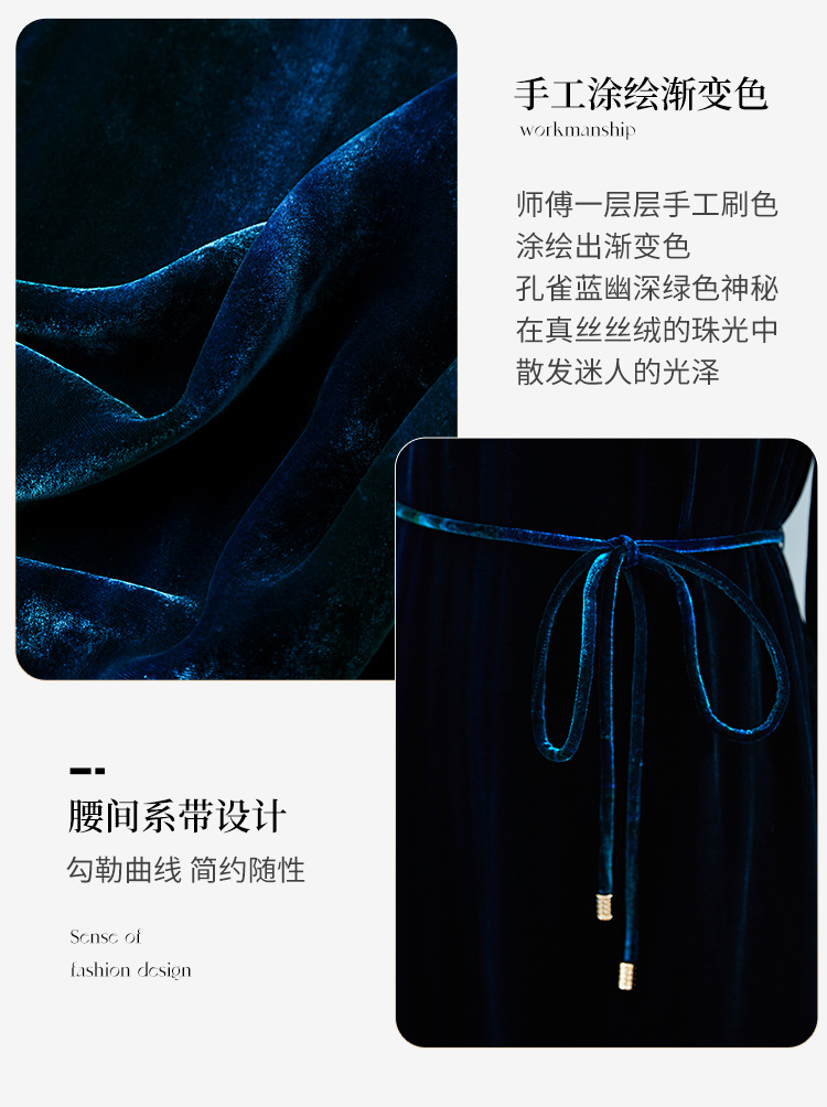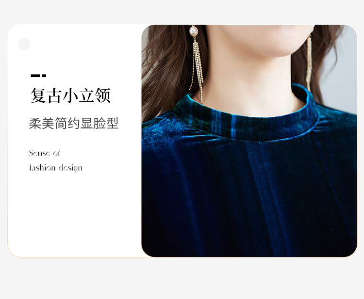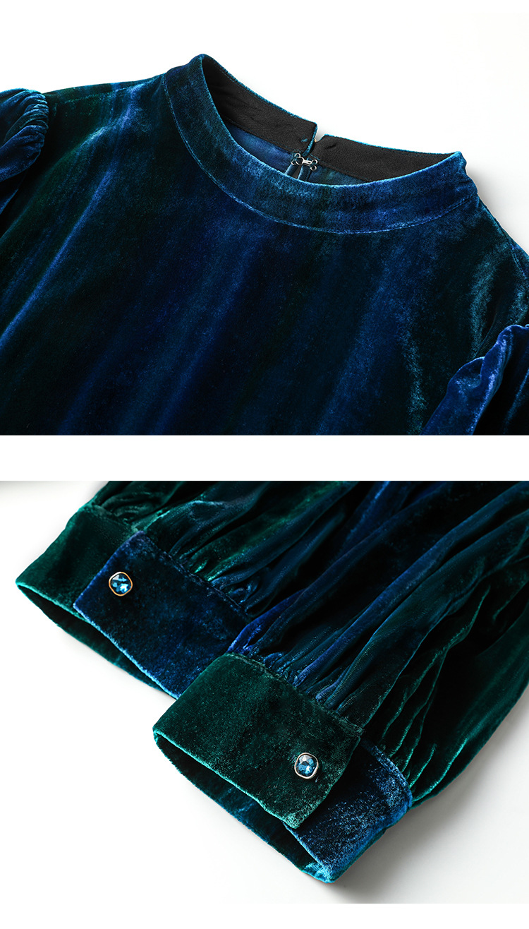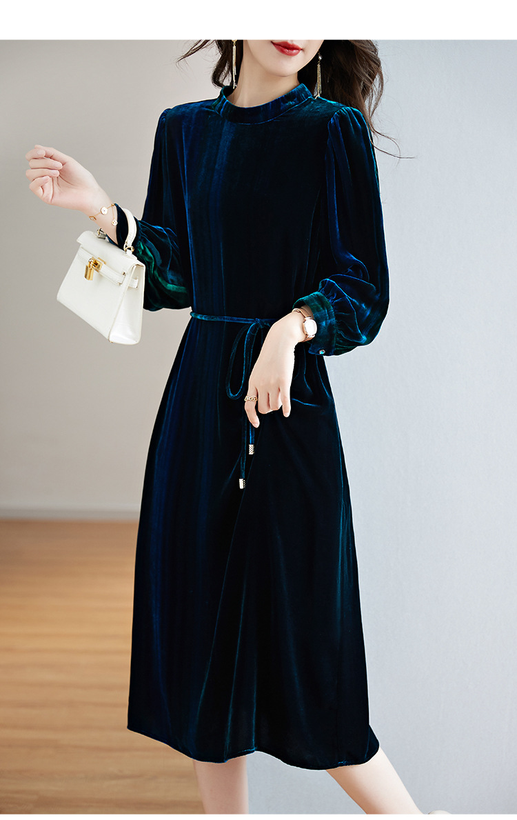 真丝丝绒连衣裙腰间系带孔雀蓝复古立领中长款蚕丝裙ZS-9123