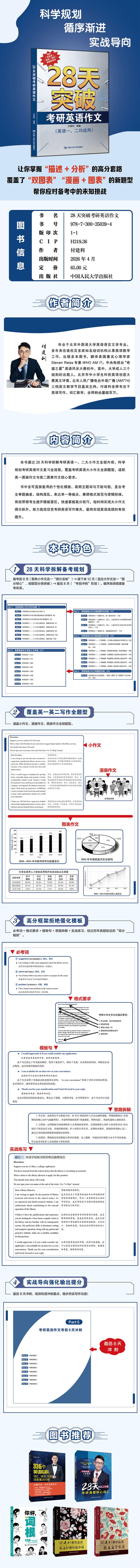 本书通过28天科学拆解考研英语一、二大小作文全部内容,科学规划考研英语作文复习全流程,覆盖考研英语大小作文全部题型,适配英一图画作文与英二图表作文核心需求。 书中含可直接套用的个性化模板、高频主题词与万能句型,直击考生审题偏差、结构混乱、表达单一等痛点,兼顾格式规范与逻辑衔接,有效带领考生避开模板雷区,快速掌握高分技巧,短时间实现大小作文得分跃升,助力高效攻克考研英语写作难关,最终实现英语成绩的有效提升。